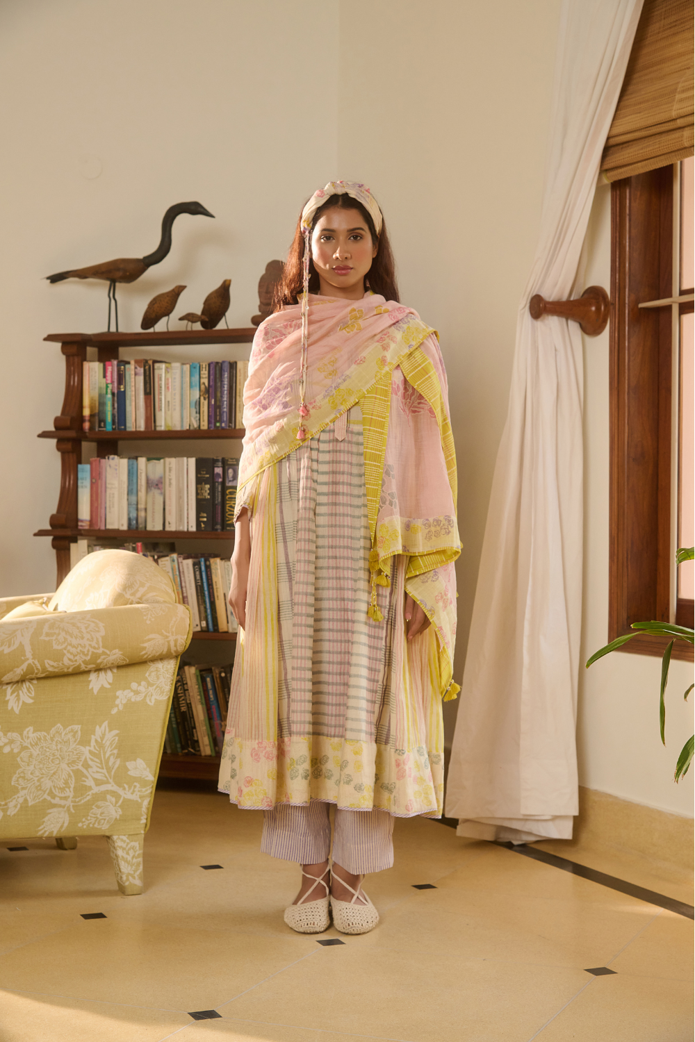 Her Chanderi carries its signature translucence and soft sheen, but with a subtlety that feels almost ethereal — printed slowly, consciously, through hand block printing that heightens the fabric's inherent delicacy.