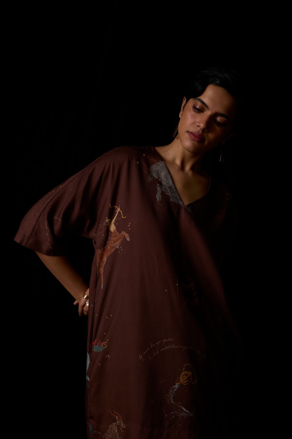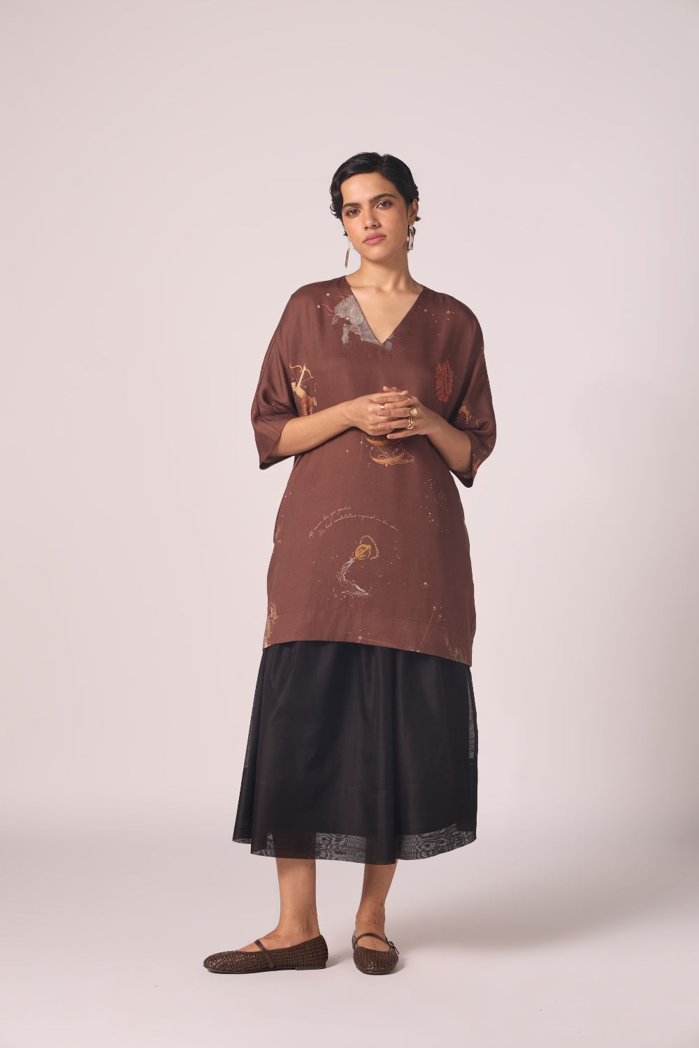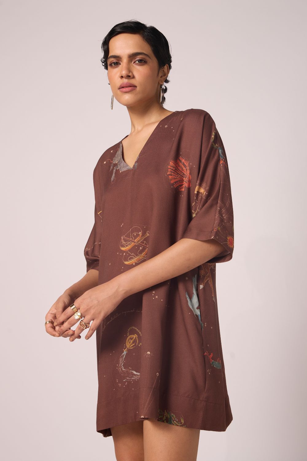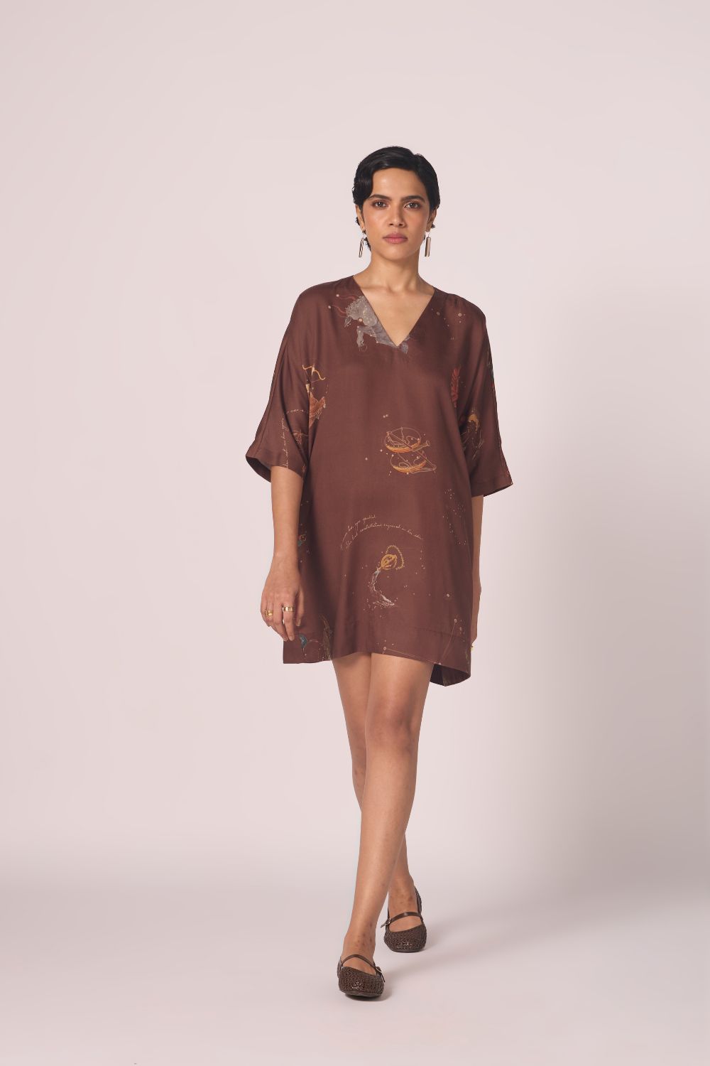 - Shift silhouette; V-neck; Kimono inspired sleeves