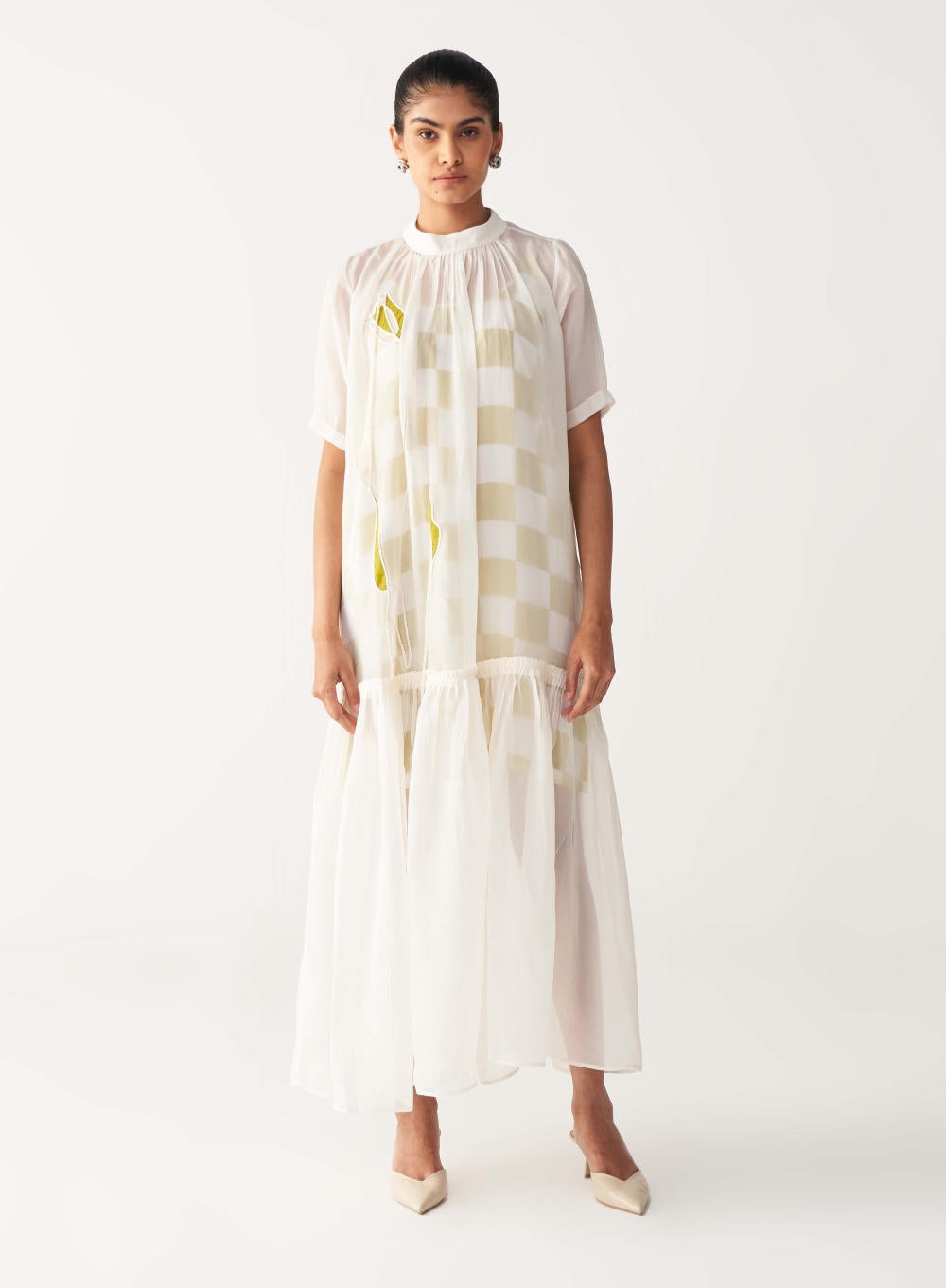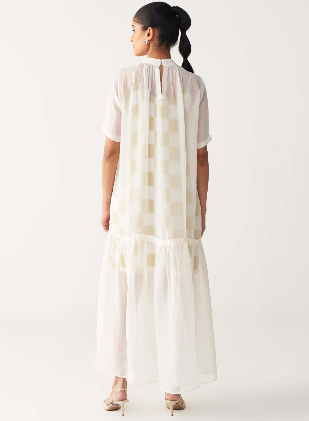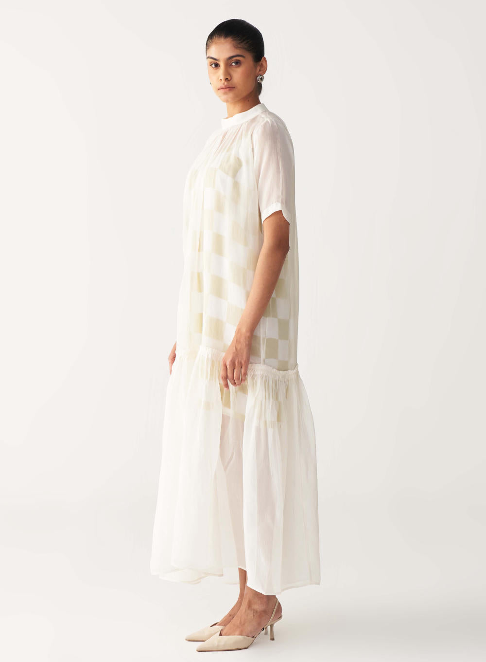 SHEER BOTTOM FRILL DRESS+CHECK SLIP-IVORY