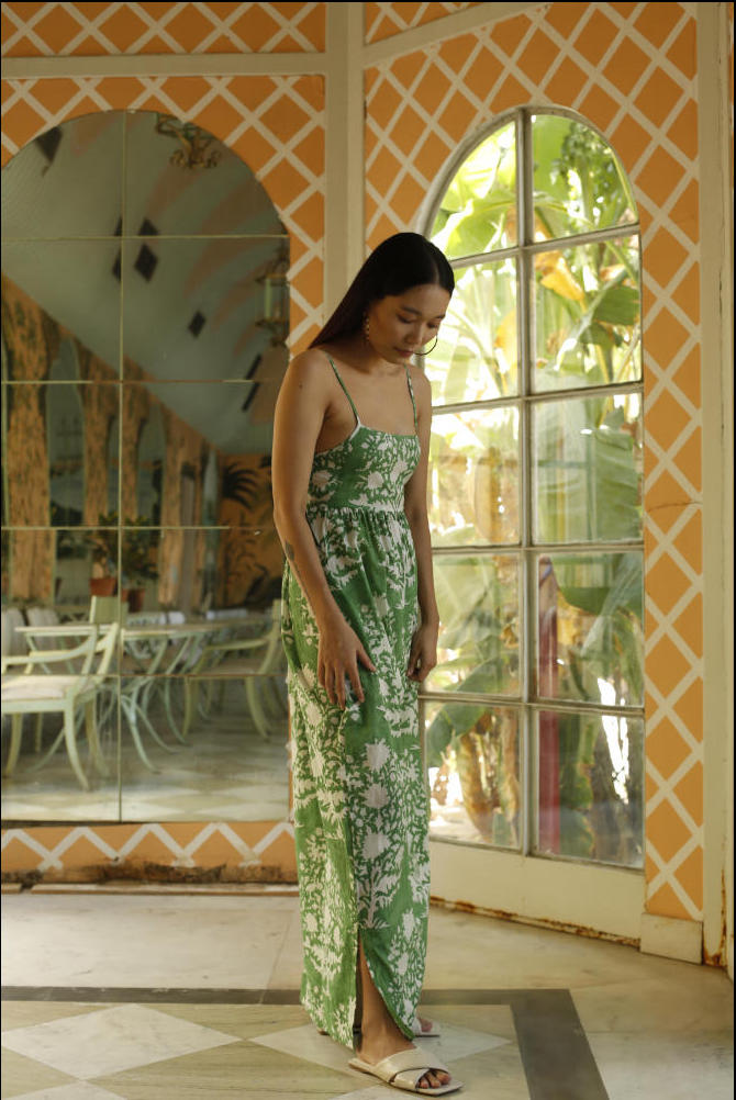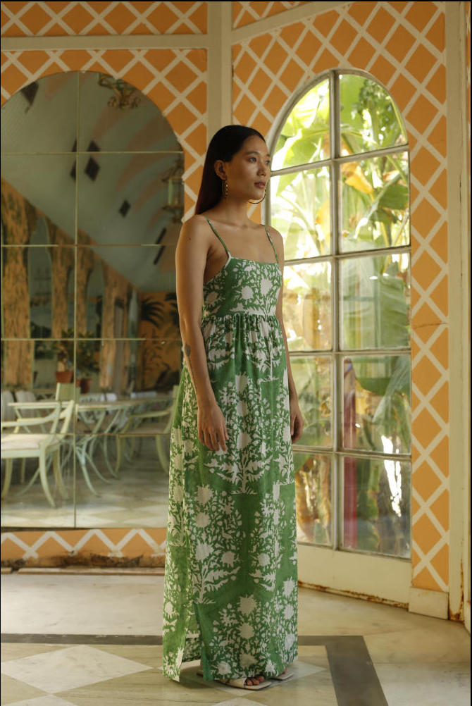 Hand printed maxi dress in cotton mulmul with adjustable straps.