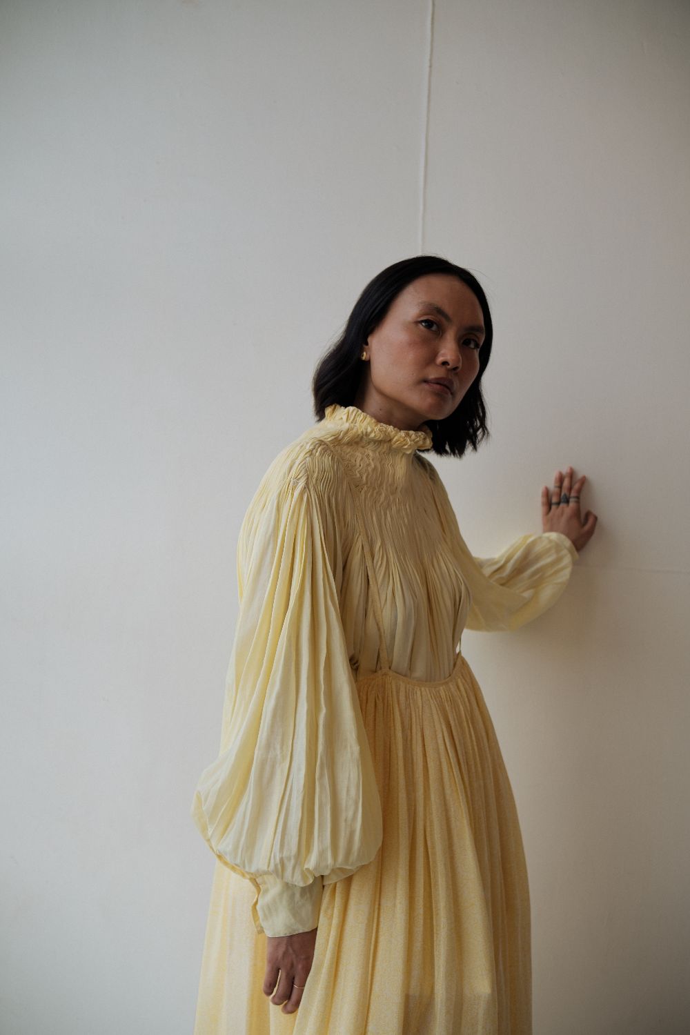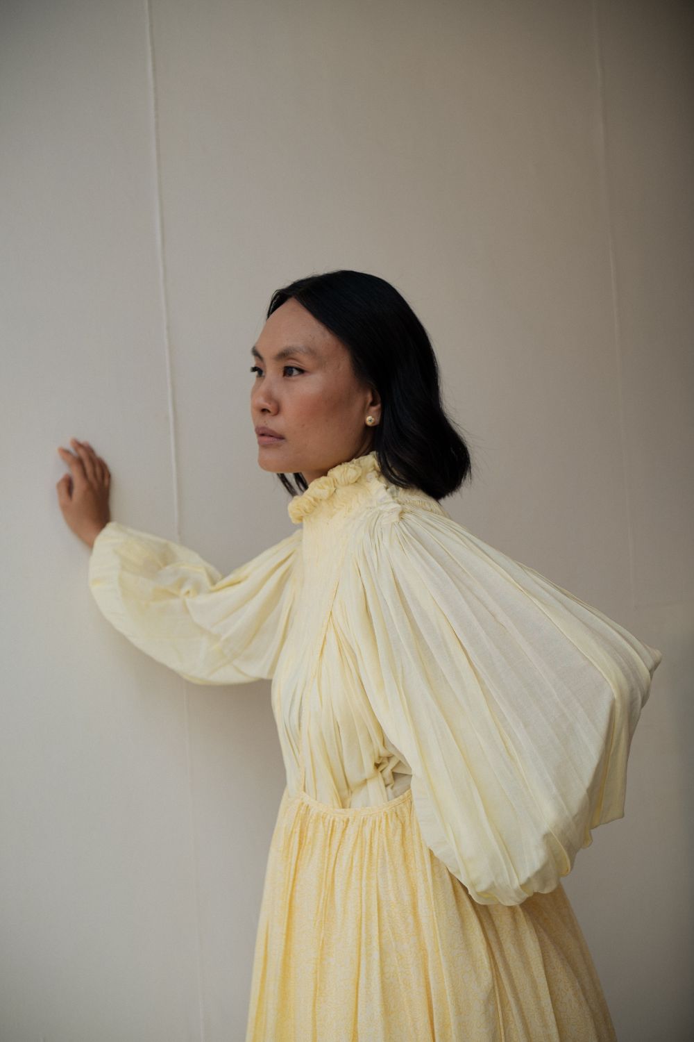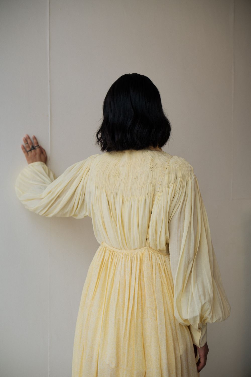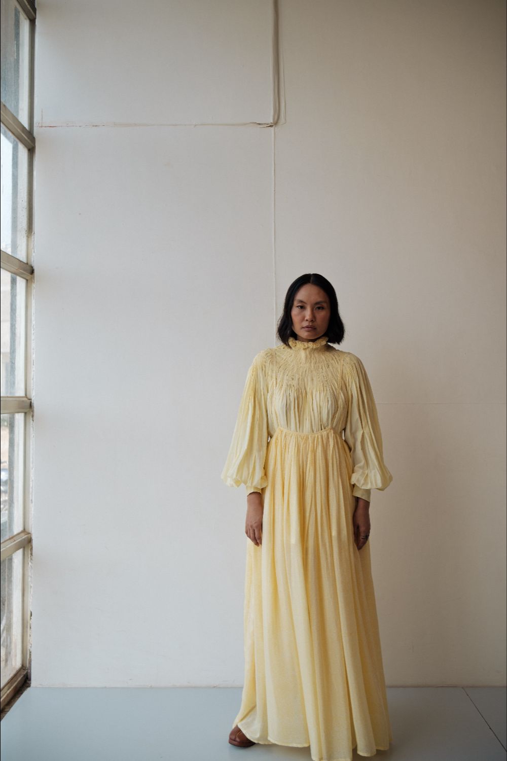 The silhouettes are simple but considered: relaxed cuts, thoughtful details, and fabrics that breathe — from handwoven cottons to delicately finished textiles rooted in Rajasthan’s craft culture. Colours stay close to the earth: muted florals, soft neutrals, and tones that age gracefully rather than fall out of season.