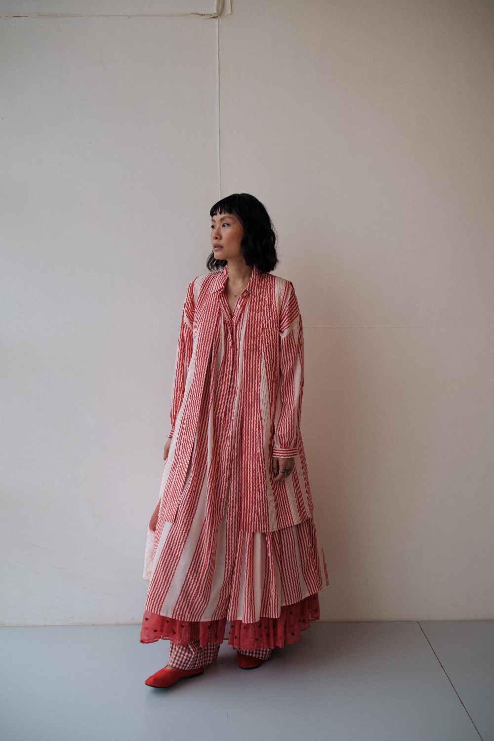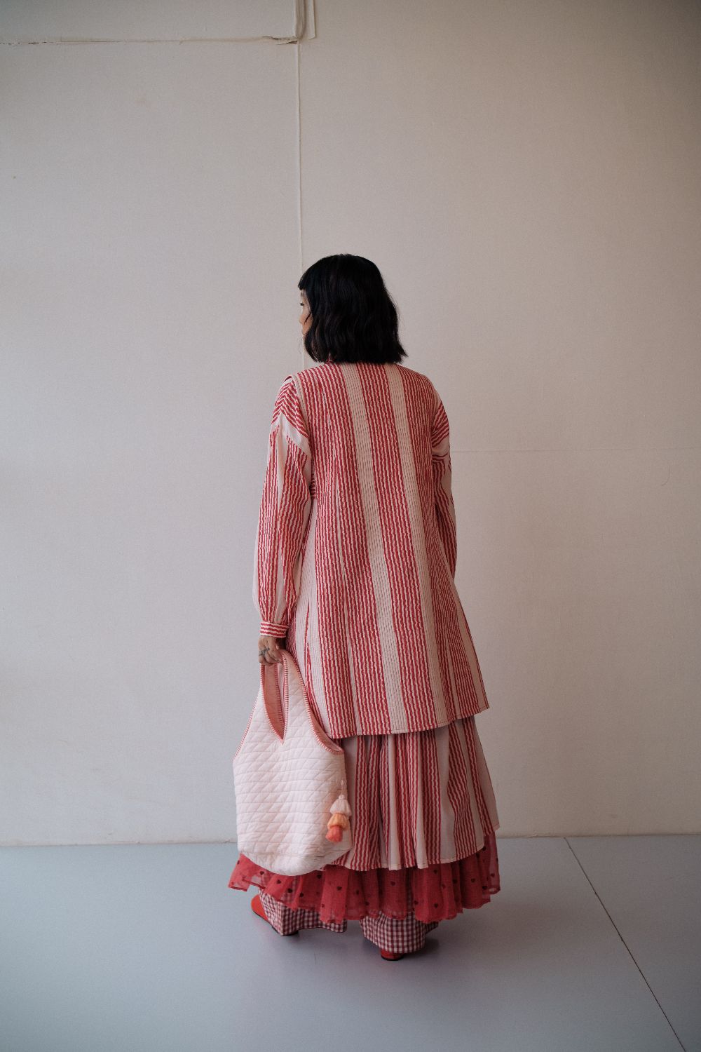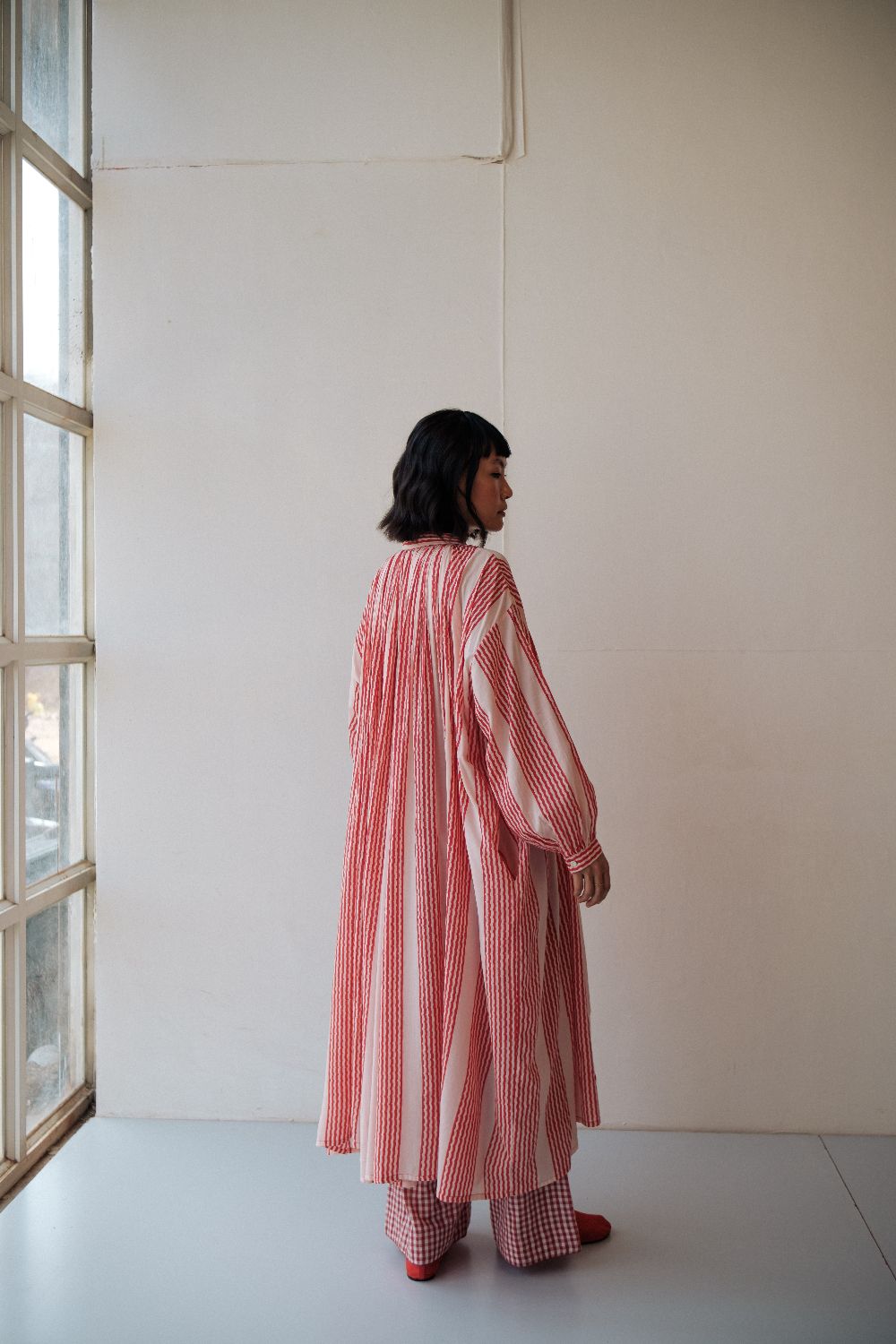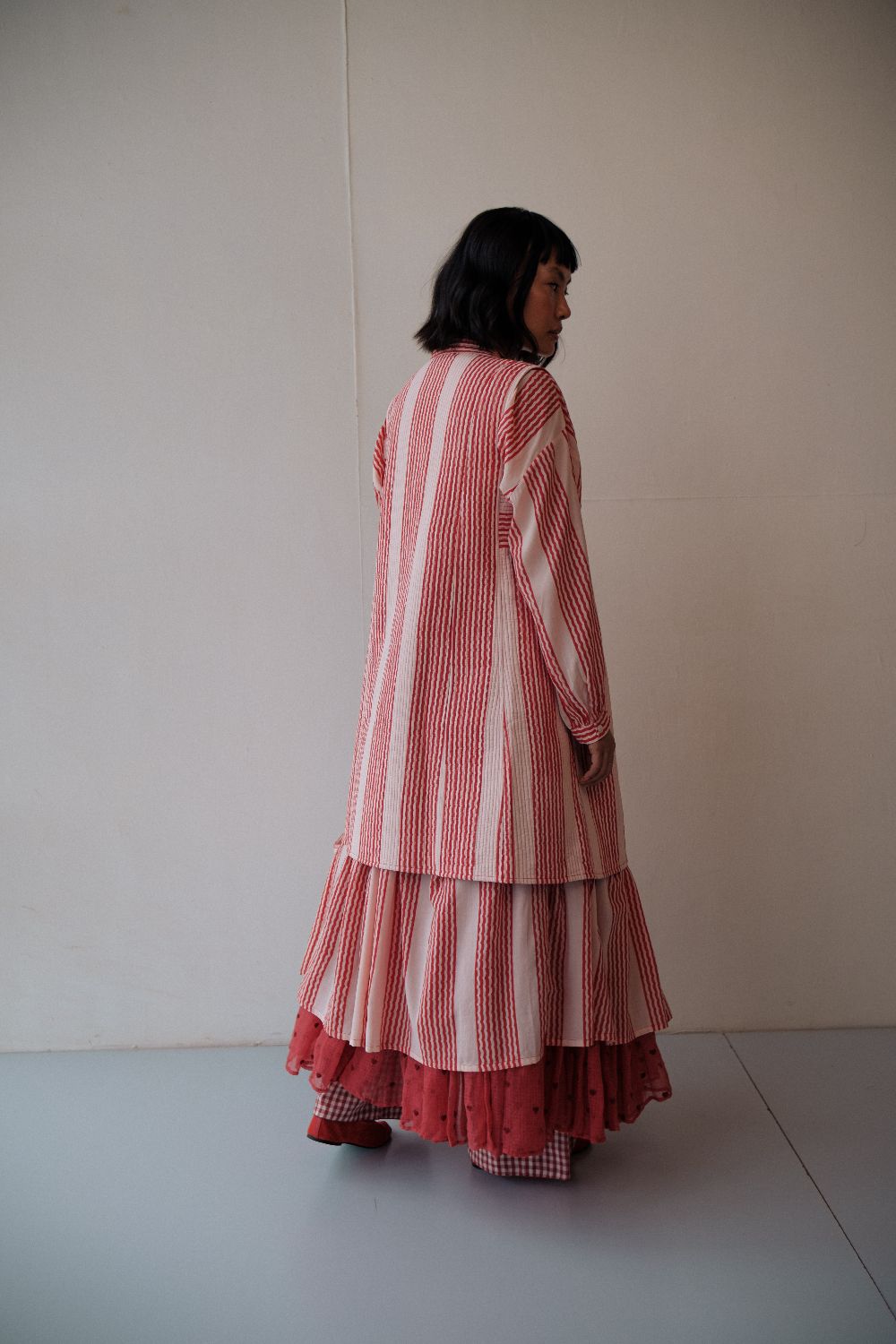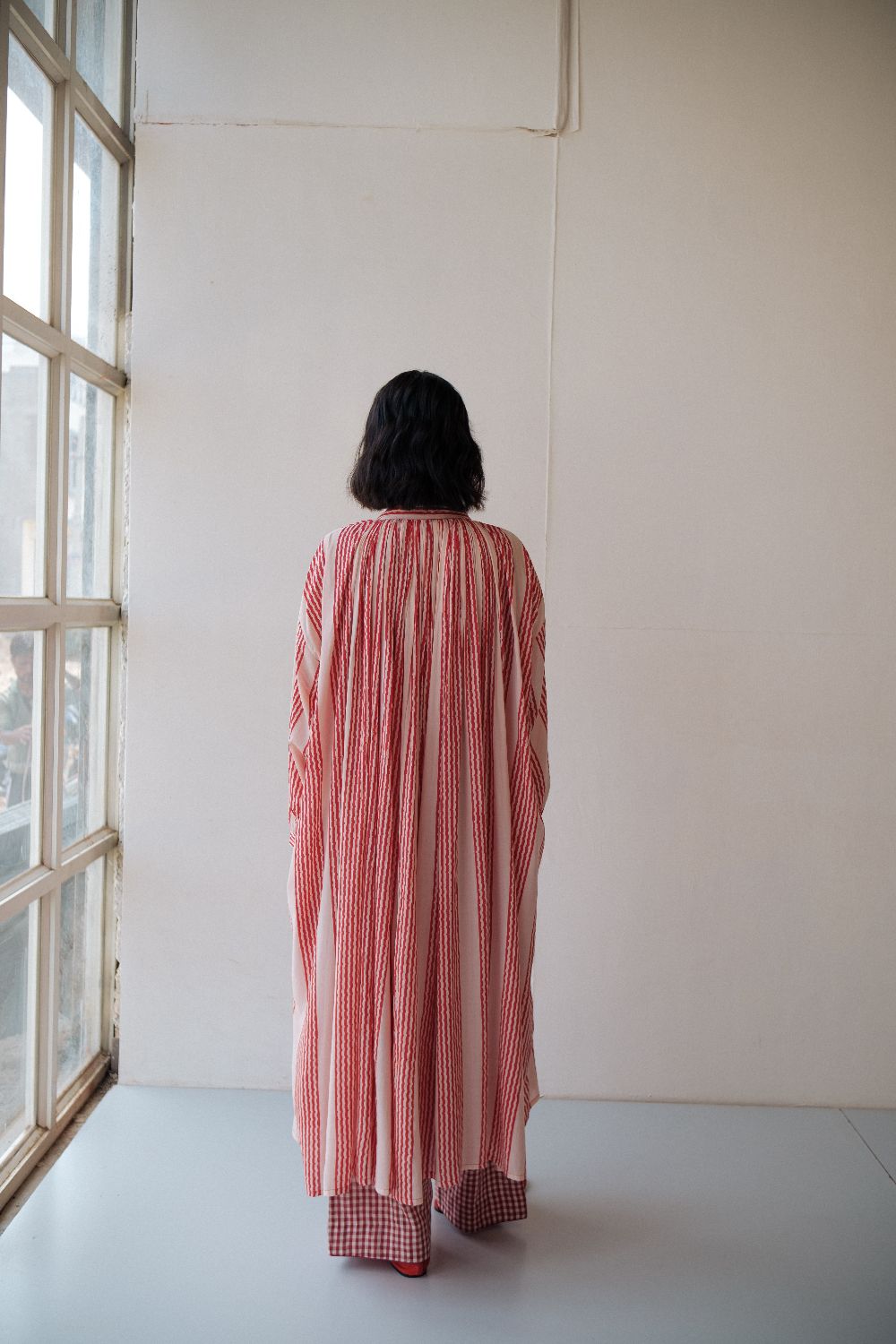 The silhouettes are simple but considered: relaxed cuts, thoughtful details, and fabrics that breathe — from handwoven cottons to delicately finished textiles rooted in Rajasthan’s craft culture. Colours stay close to the earth: muted florals, soft neutrals, and tones that age gracefully rather than fall out of season.