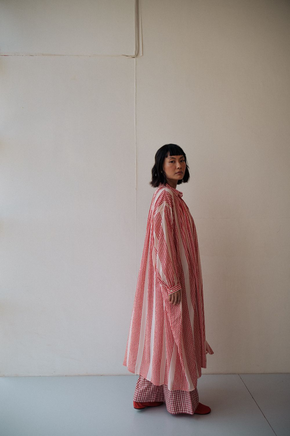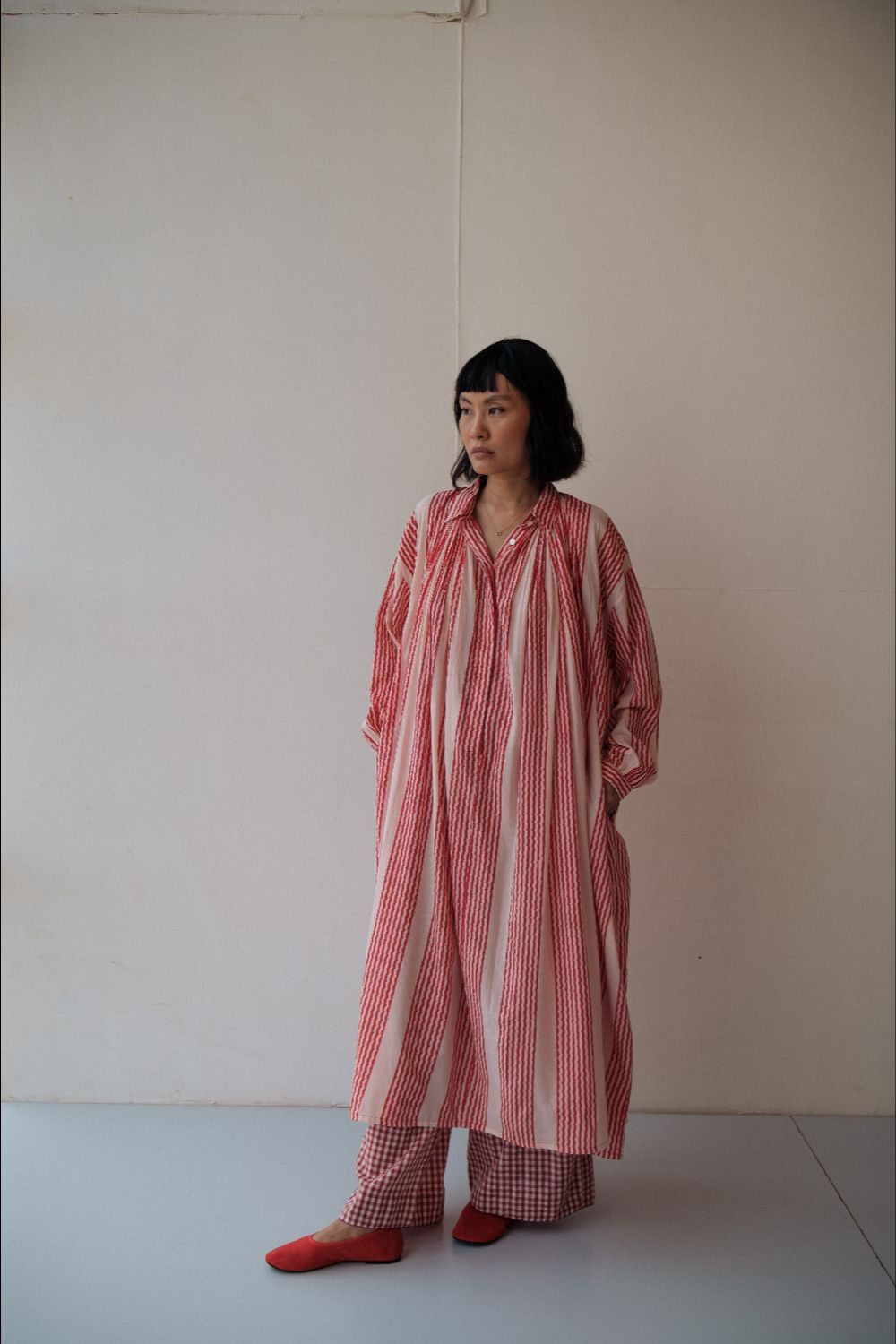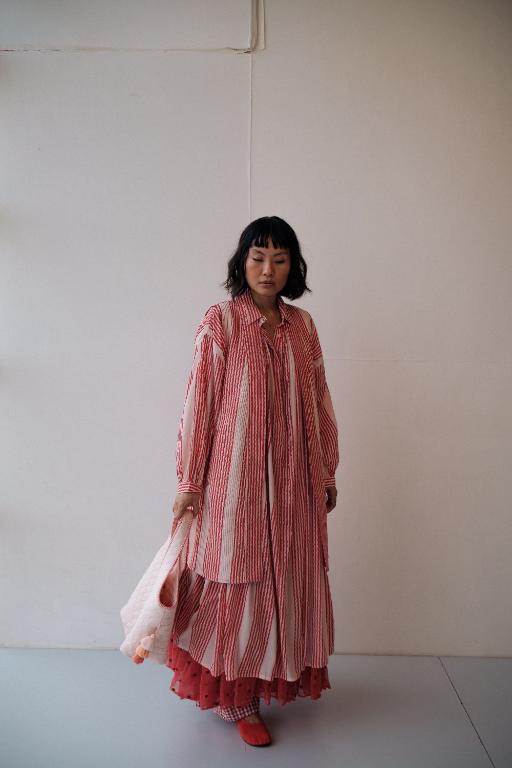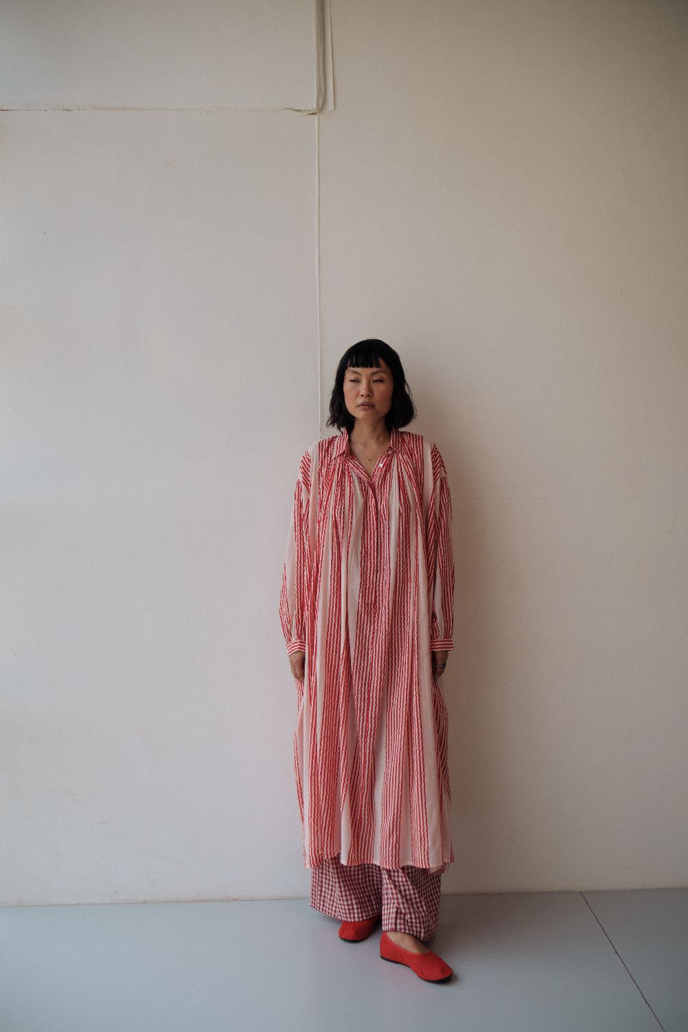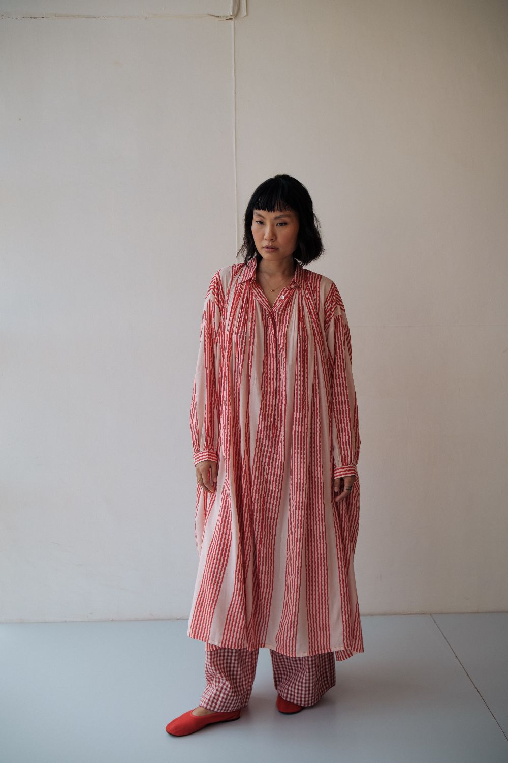 The silhouettes are simple but considered: relaxed cuts, thoughtful details, and fabrics that breathe — from handwoven cottons to delicately finished textiles rooted in Rajasthan’s craft culture. Colours stay close to the earth: muted florals, soft neutrals, and tones that age gracefully rather than fall out of season.
