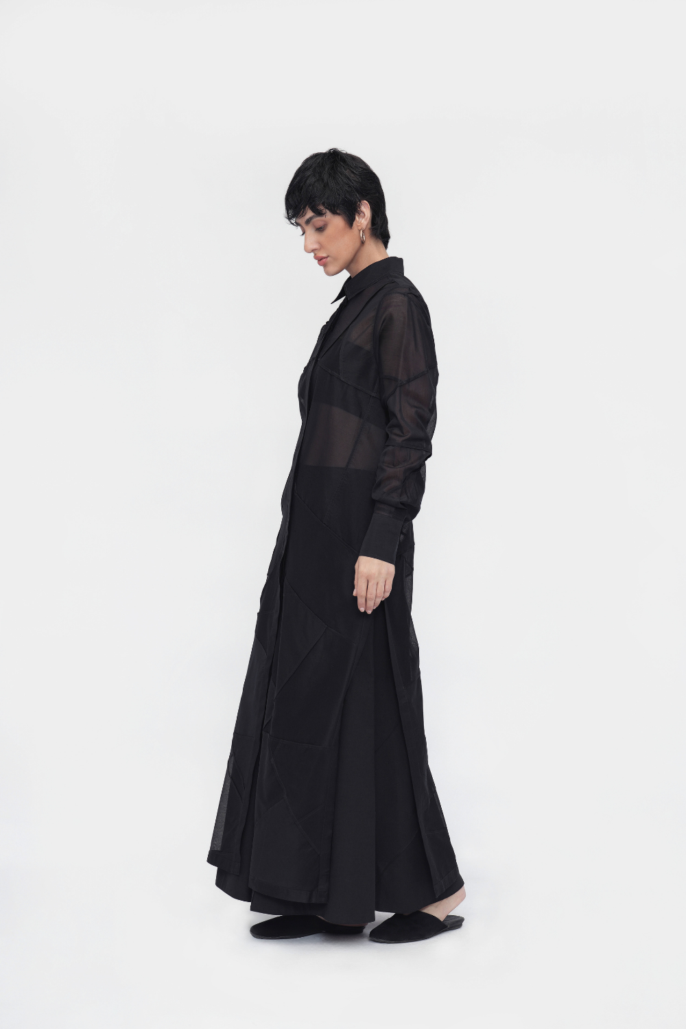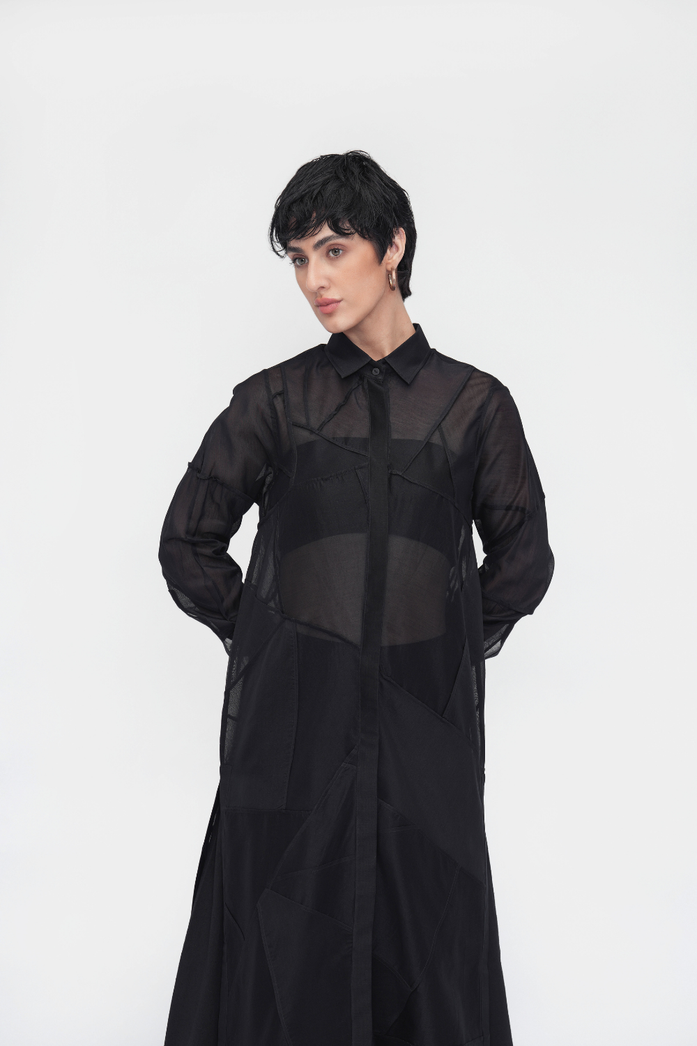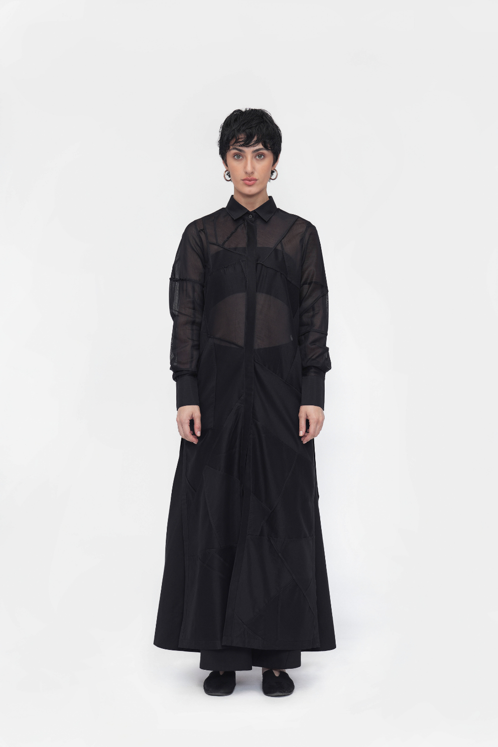 A relaxed-fit dress with a point collar and a full concealed placket. Finished with full sleeves, side slits, and a structured back yoke. Crafted in patchwork fabric using delicate French seams.