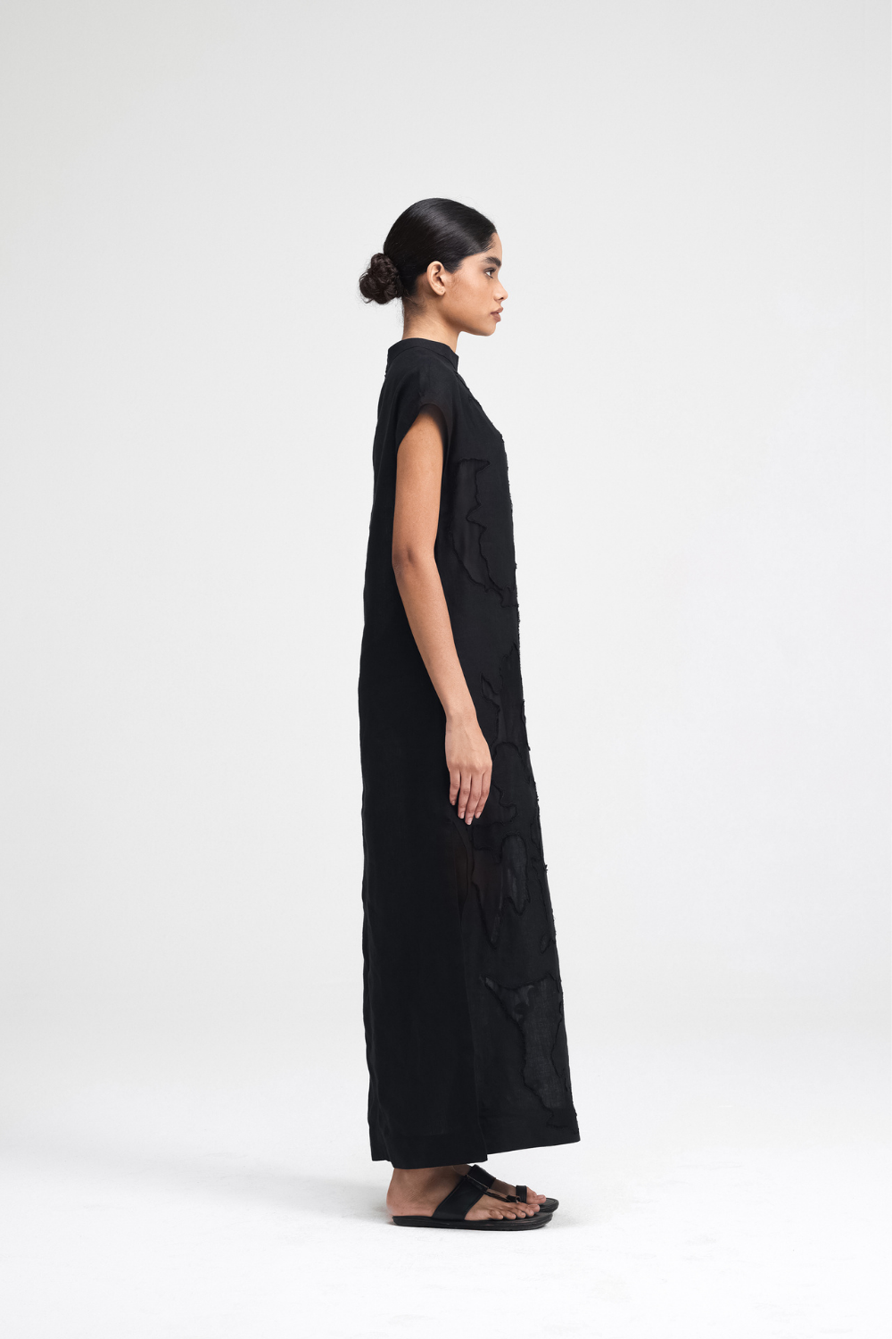 Relaxed and graceful, our Mai hand-embroidered dress features a sleek band collar and drop-shoulder design. A concealed back closure ensures a clean finish, while side slits add ease and movement. Delicately showcasing reverse applique with Chanderi fabric, this piece embodies artisanal craftsmanship and timeless elegance.