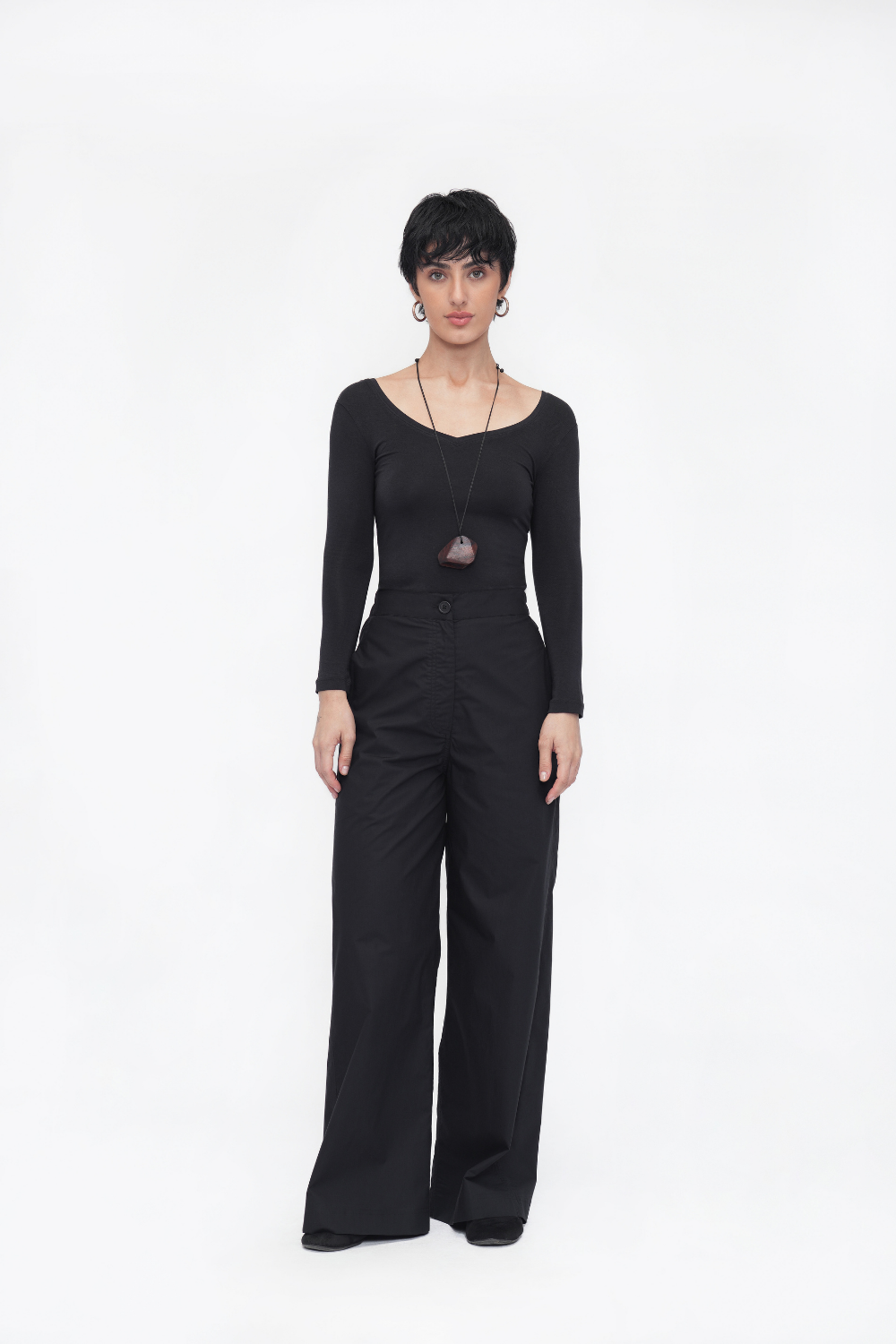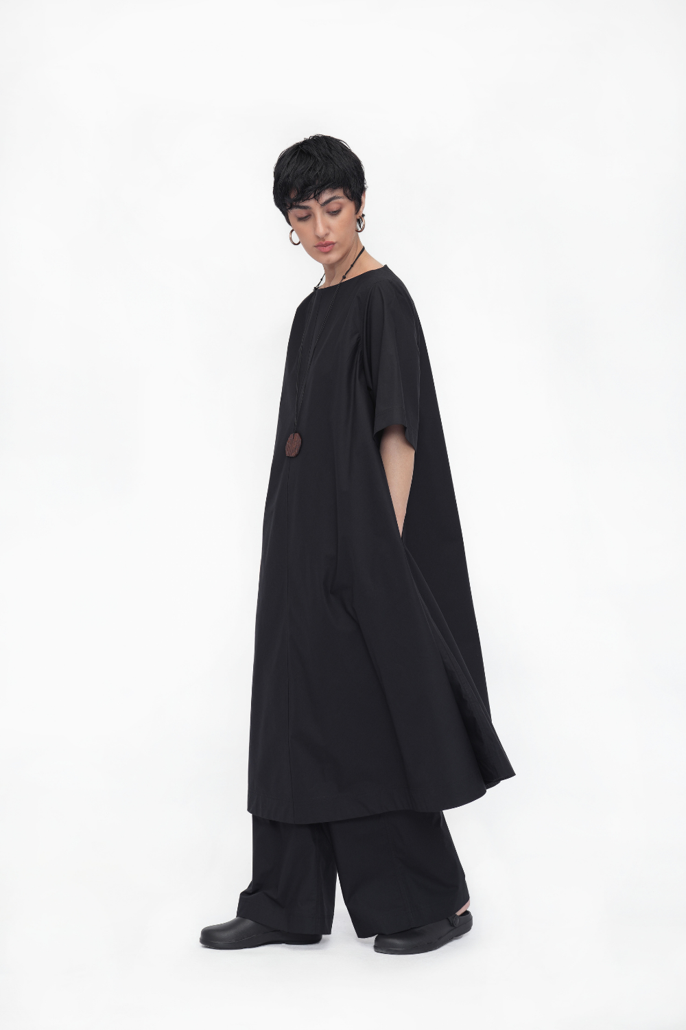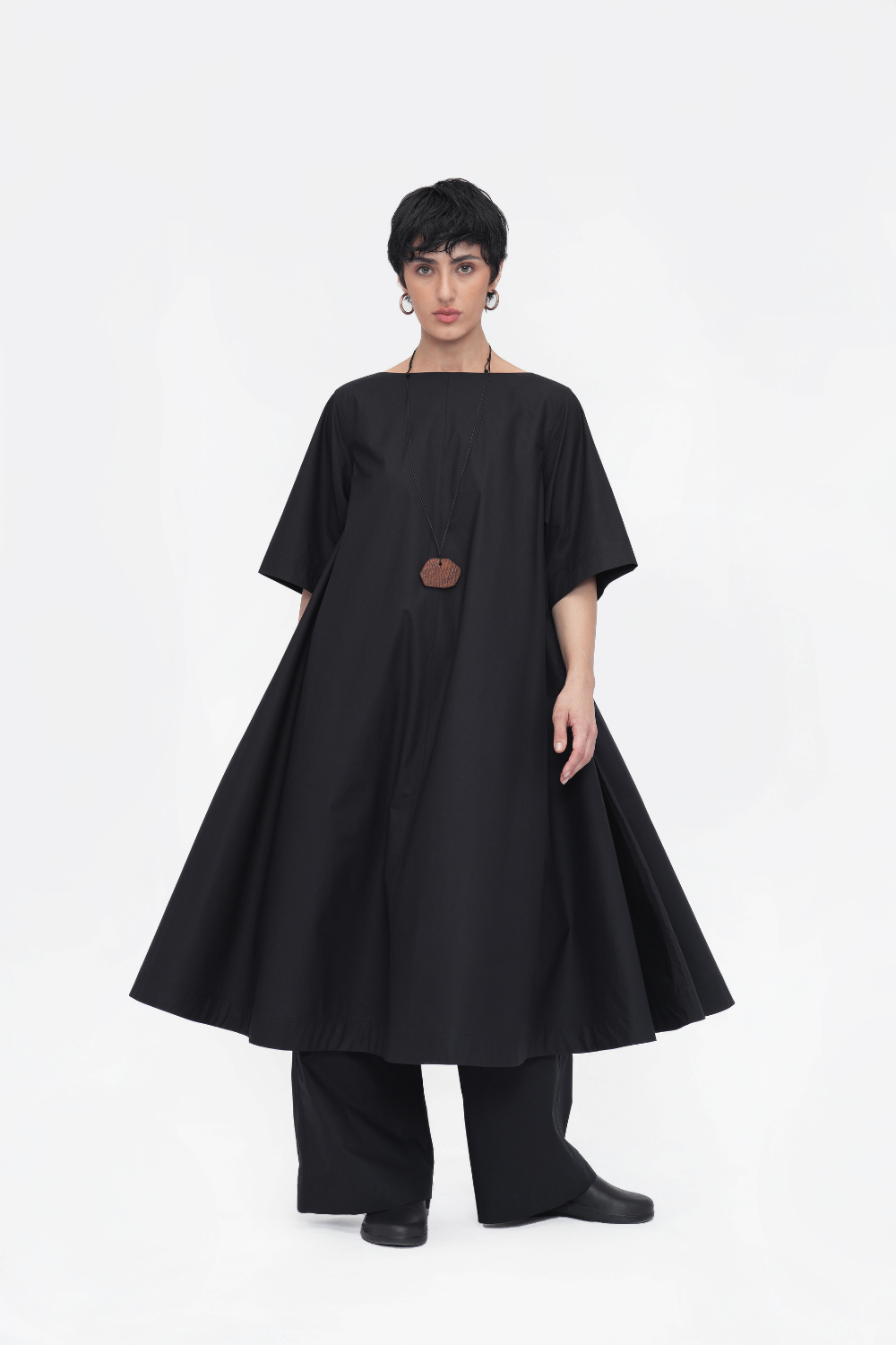 Oversized calf-length tunic in soft cotton poplin, featuring a breezy tent silhouette, boat neck, and center seams front and back. Finished with relaxed half sleeves for effortless elegance.
