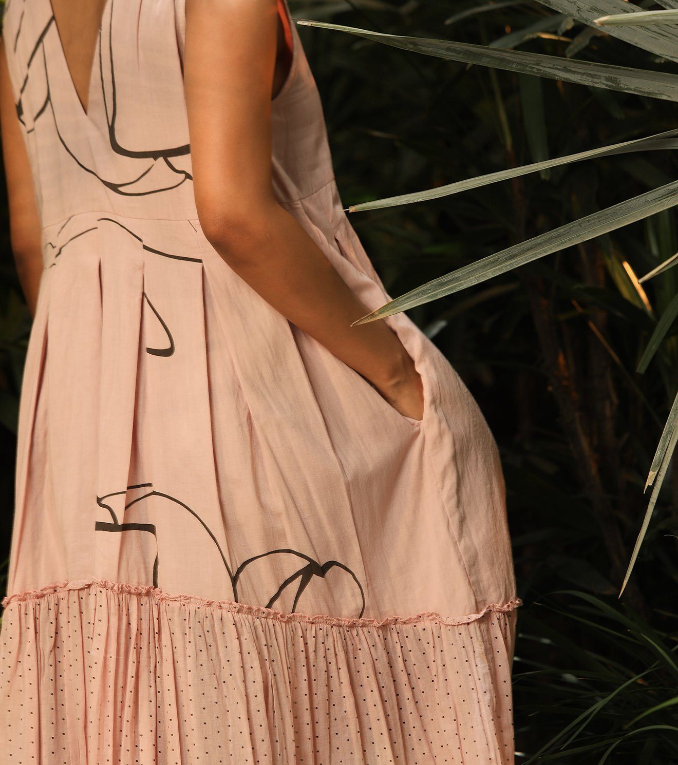 Nature sings for those who listen. A sleeveless pink floral tiered dress with frill details at the bottom, box pleats above the waist and side pockets. Now you know her secret. Partially lined.