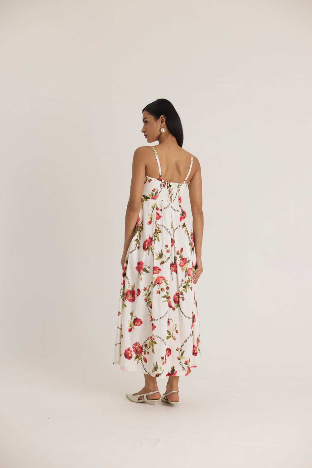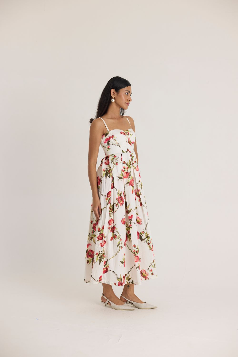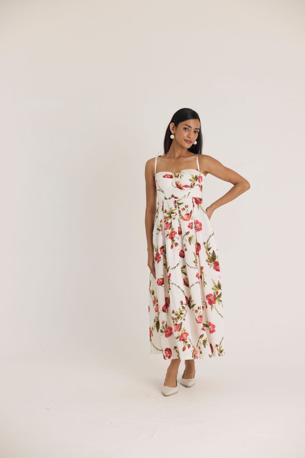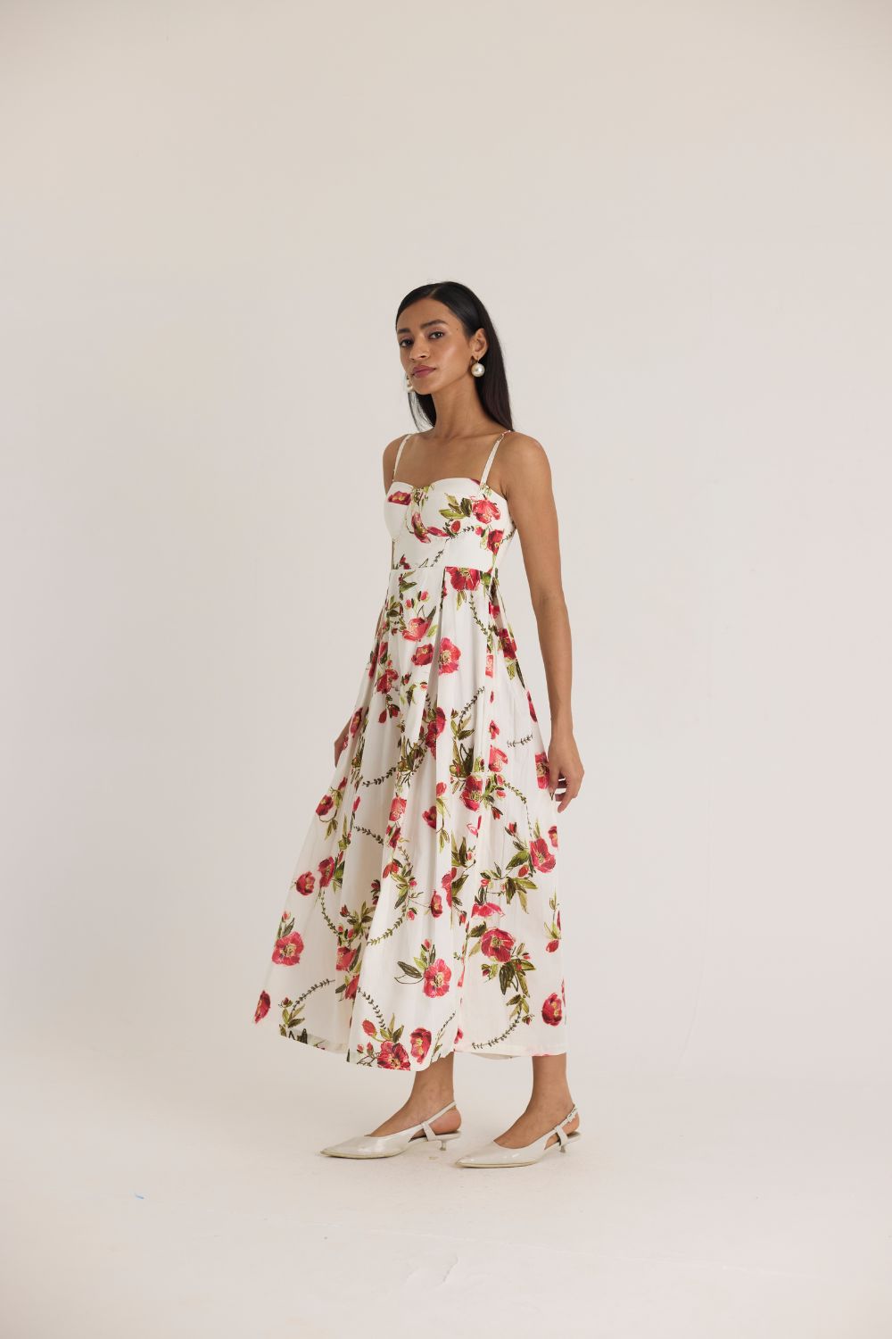 A dreamy, feminine midi dress adorned with delicate red and pink florals on a crisp white base. The structured bodice with a sweetheart neckline and adjustable straps offers a flattering fit, while the pleated skirt adds volume and movement, making it perfect for both daytime elegance and evening soirées.