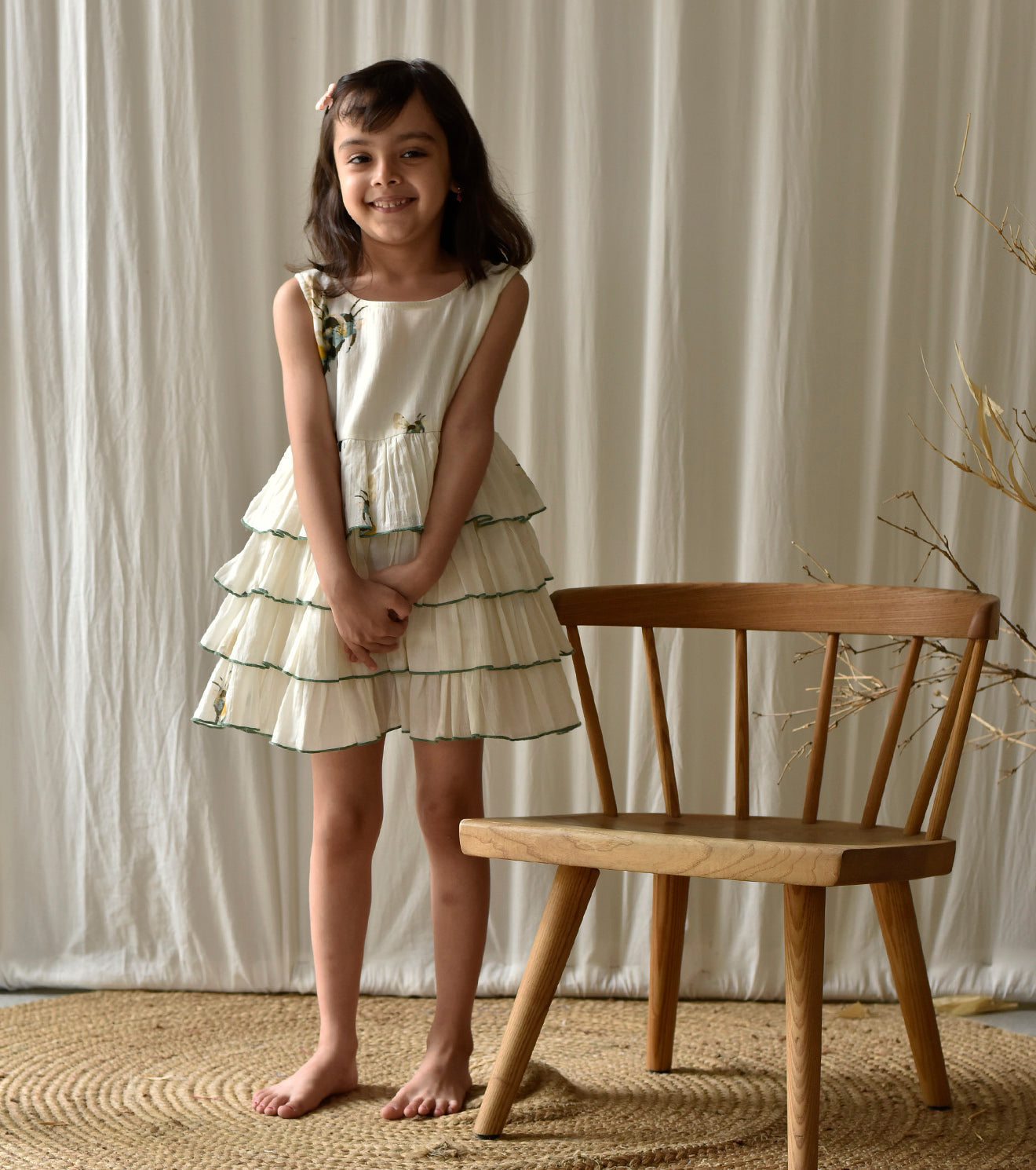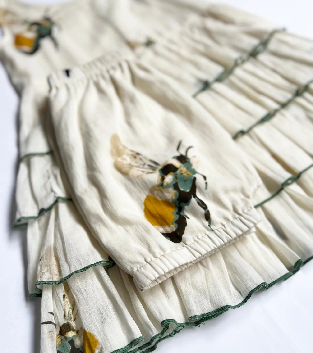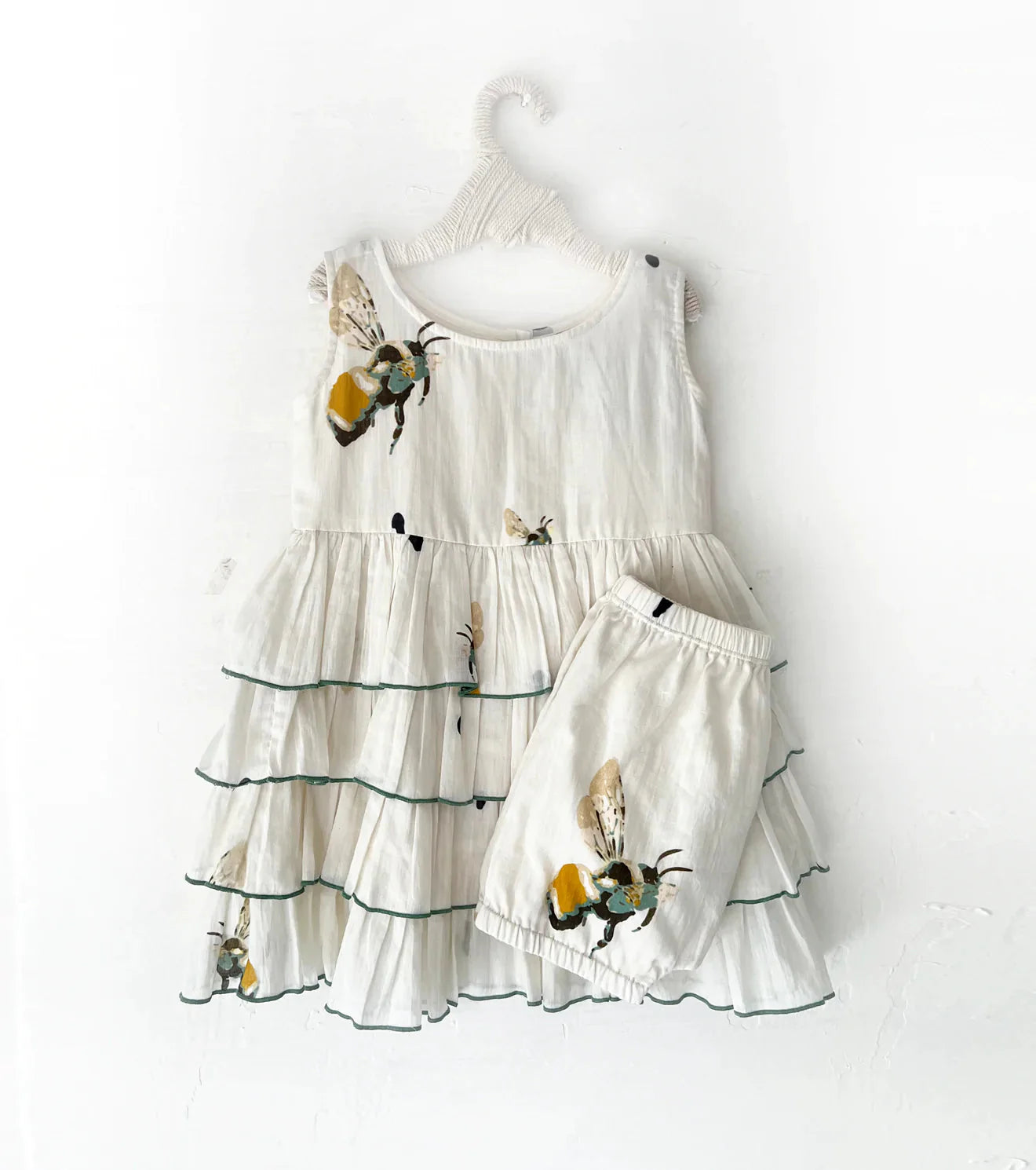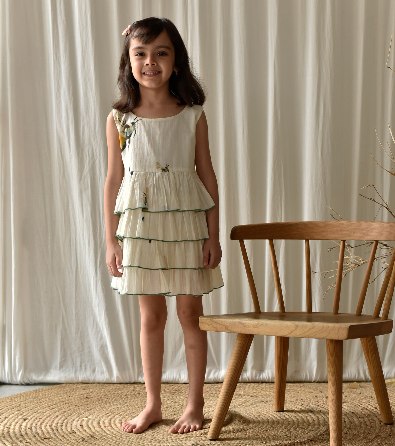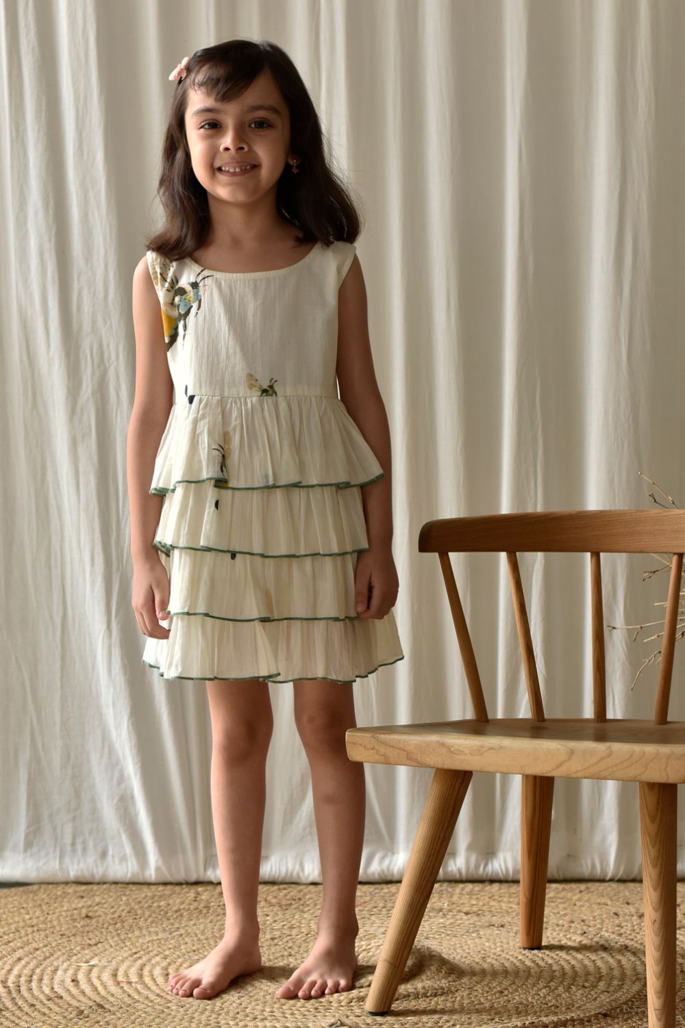 A sleeveless tired frock in mul cotton with busy bee print.