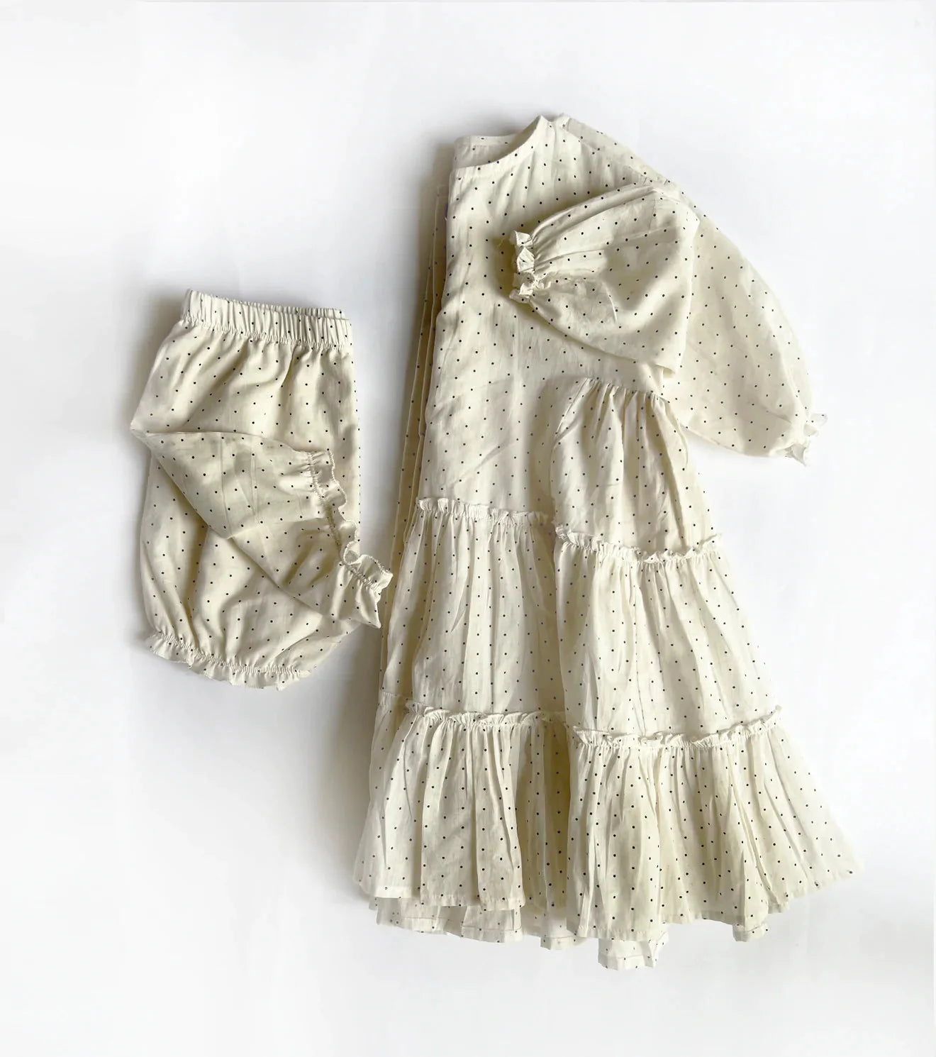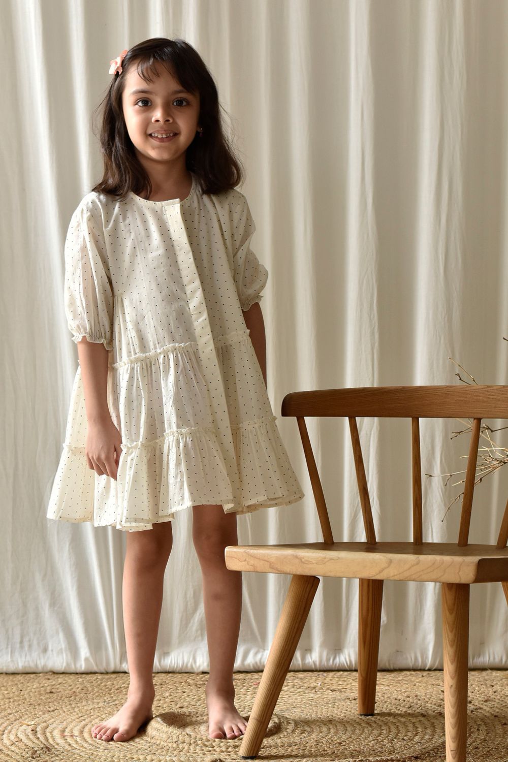Khara Kapas classic tiered designed for your younger one. A flared polka dot dress with elasticated sleeve hem and front button opening.