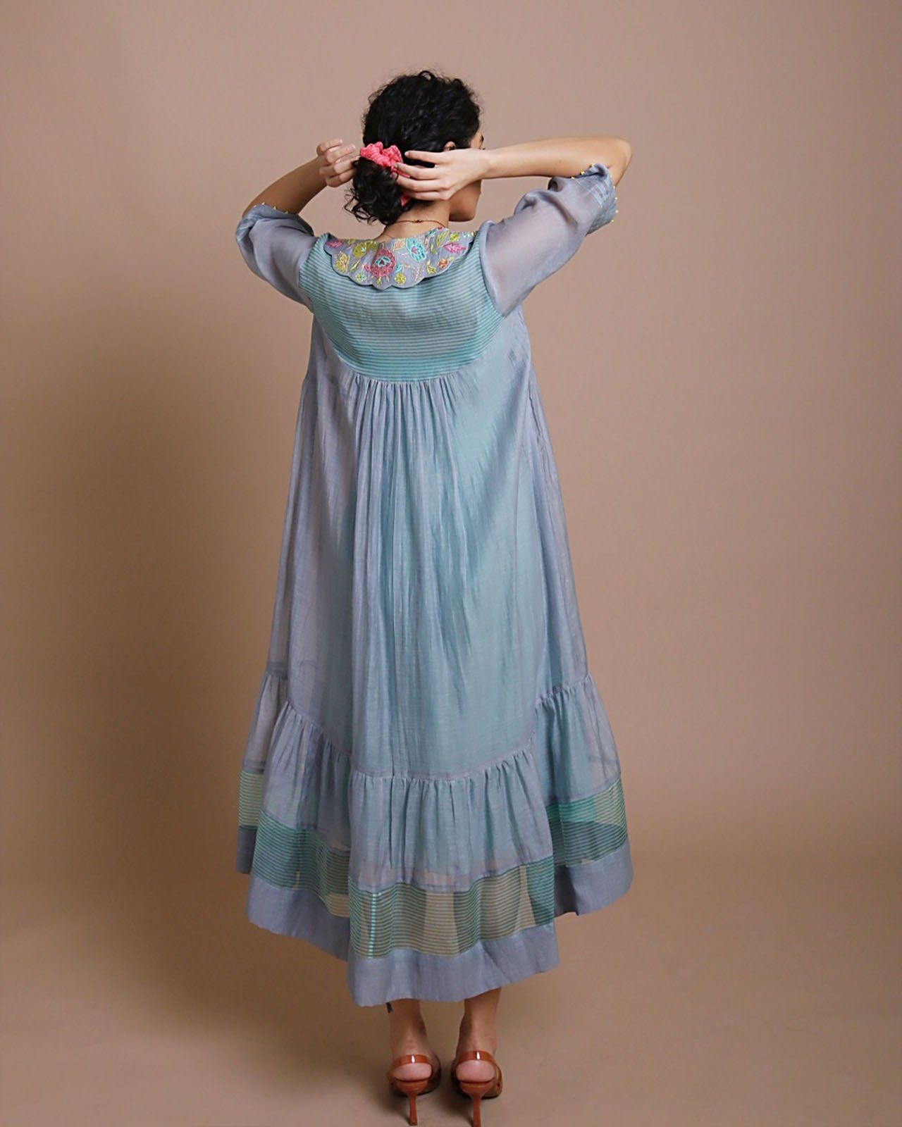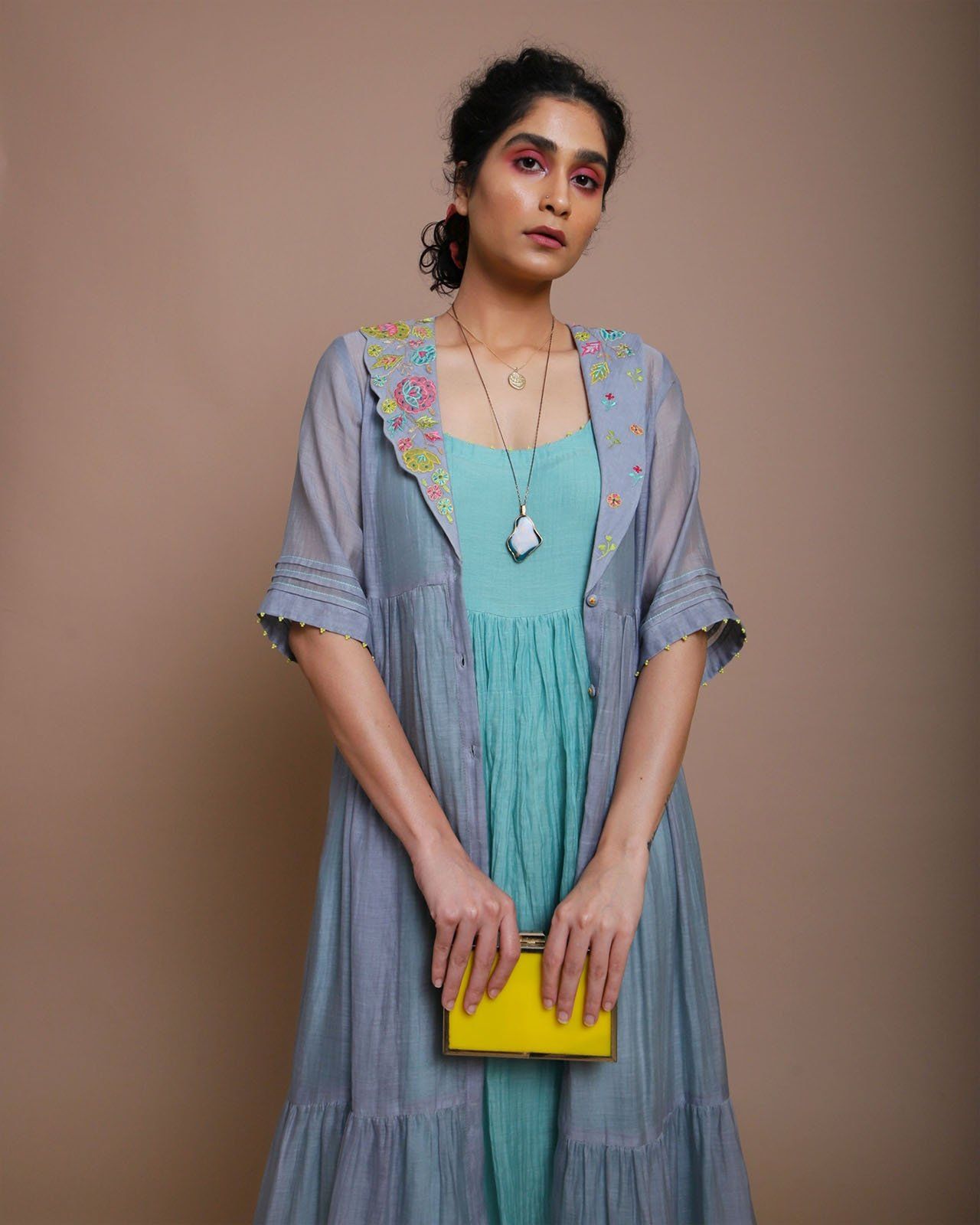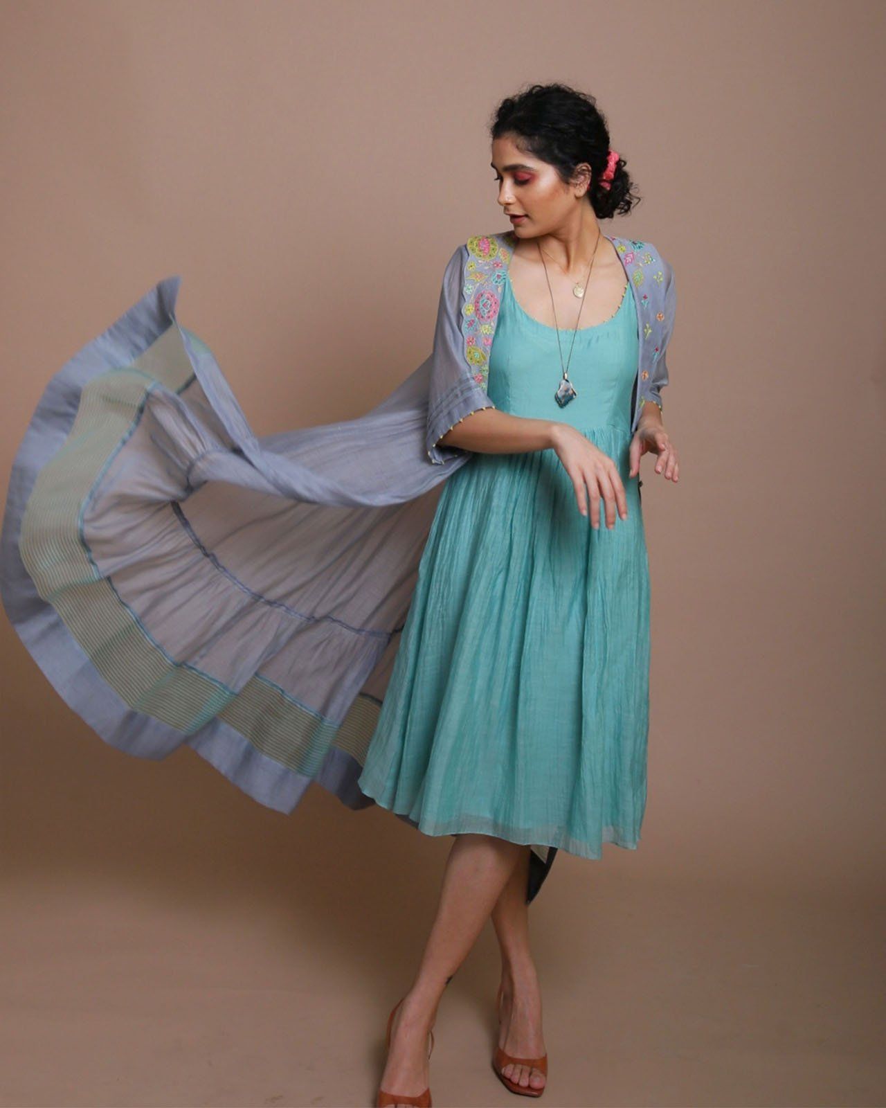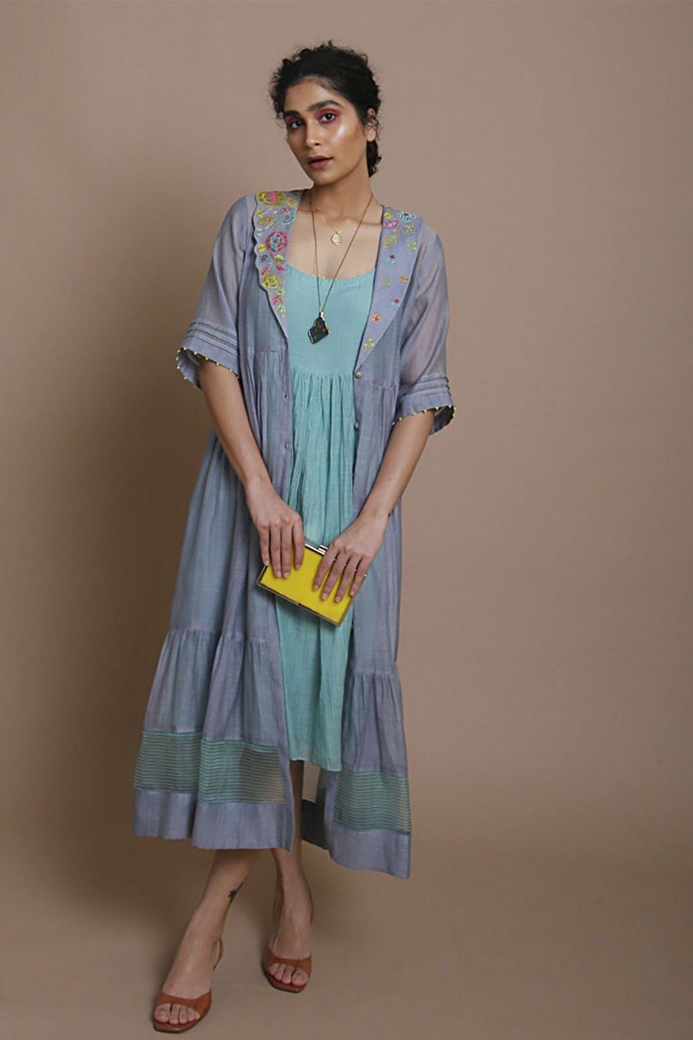 Grey & powder blue chanderi jacket with intricate embroidery paired with powder blue chanderi dress