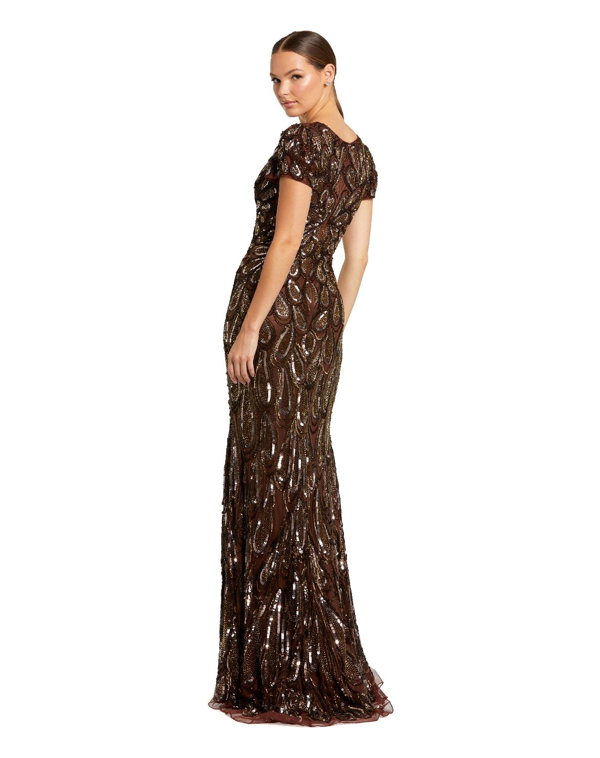 Brown Beaded Embellished V Neck Cap Sleeve Column Gown