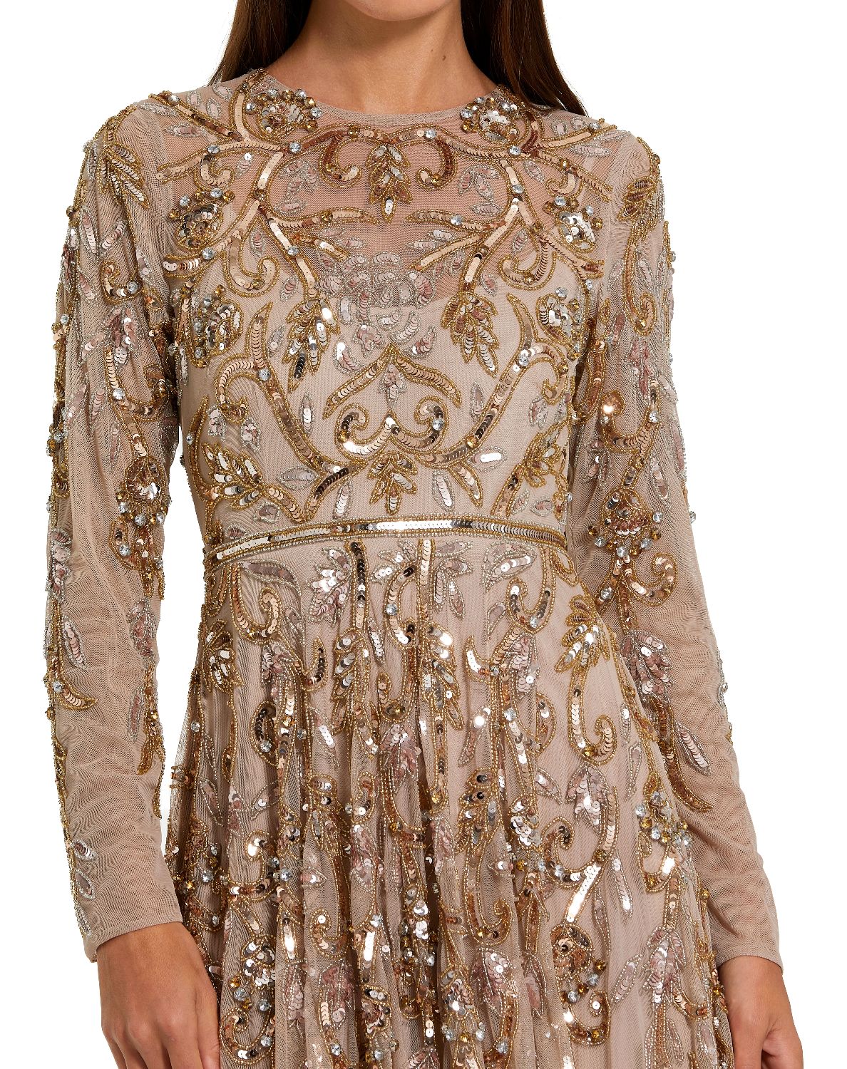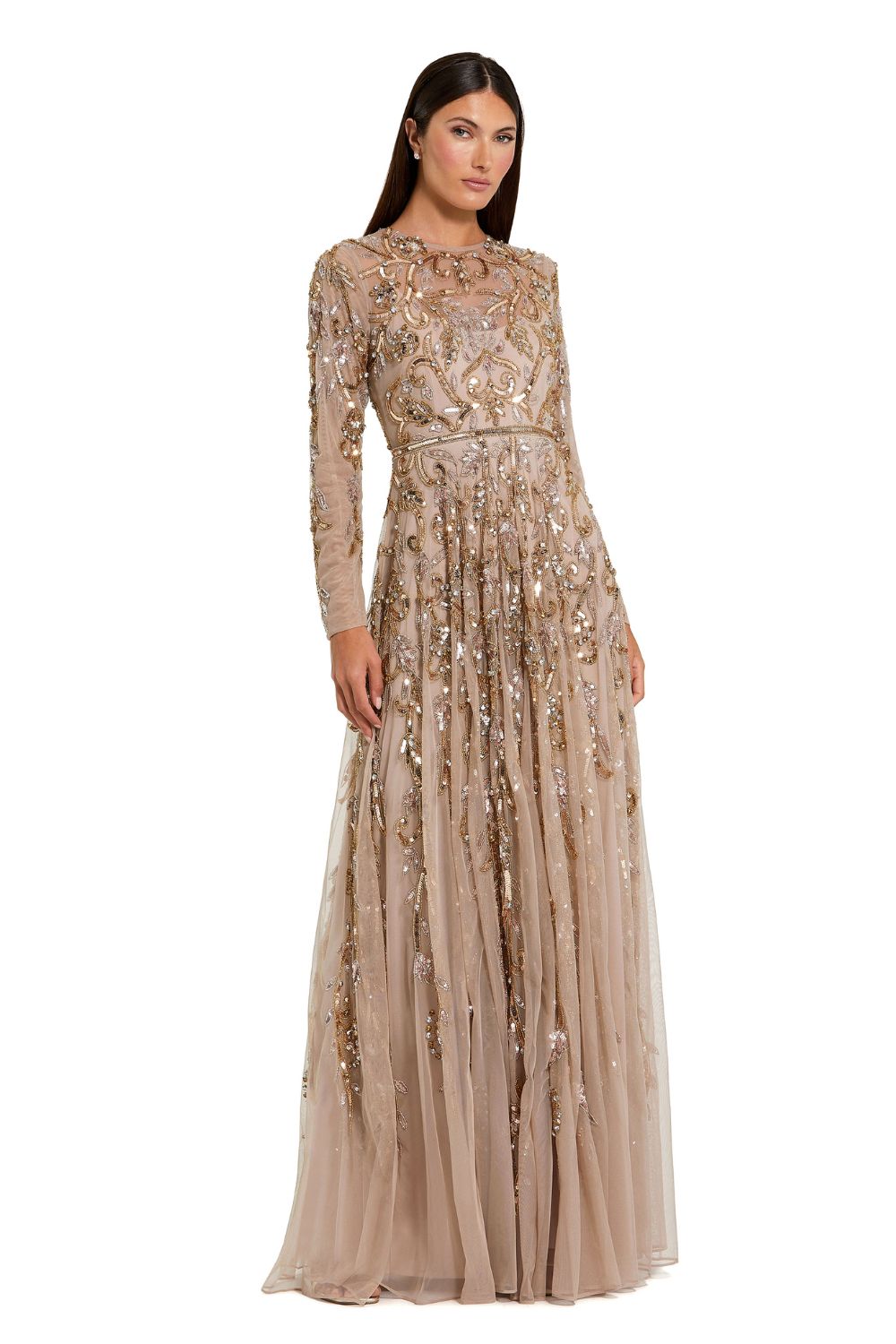 Embrace timeless glamour in this stunning long sleeve embellished gown. Its illusion neckline, intricate hand-beaded and sequined embellishments, and sheer long sleeves create an effortlessly elegant look, perfect for your next special occasion.