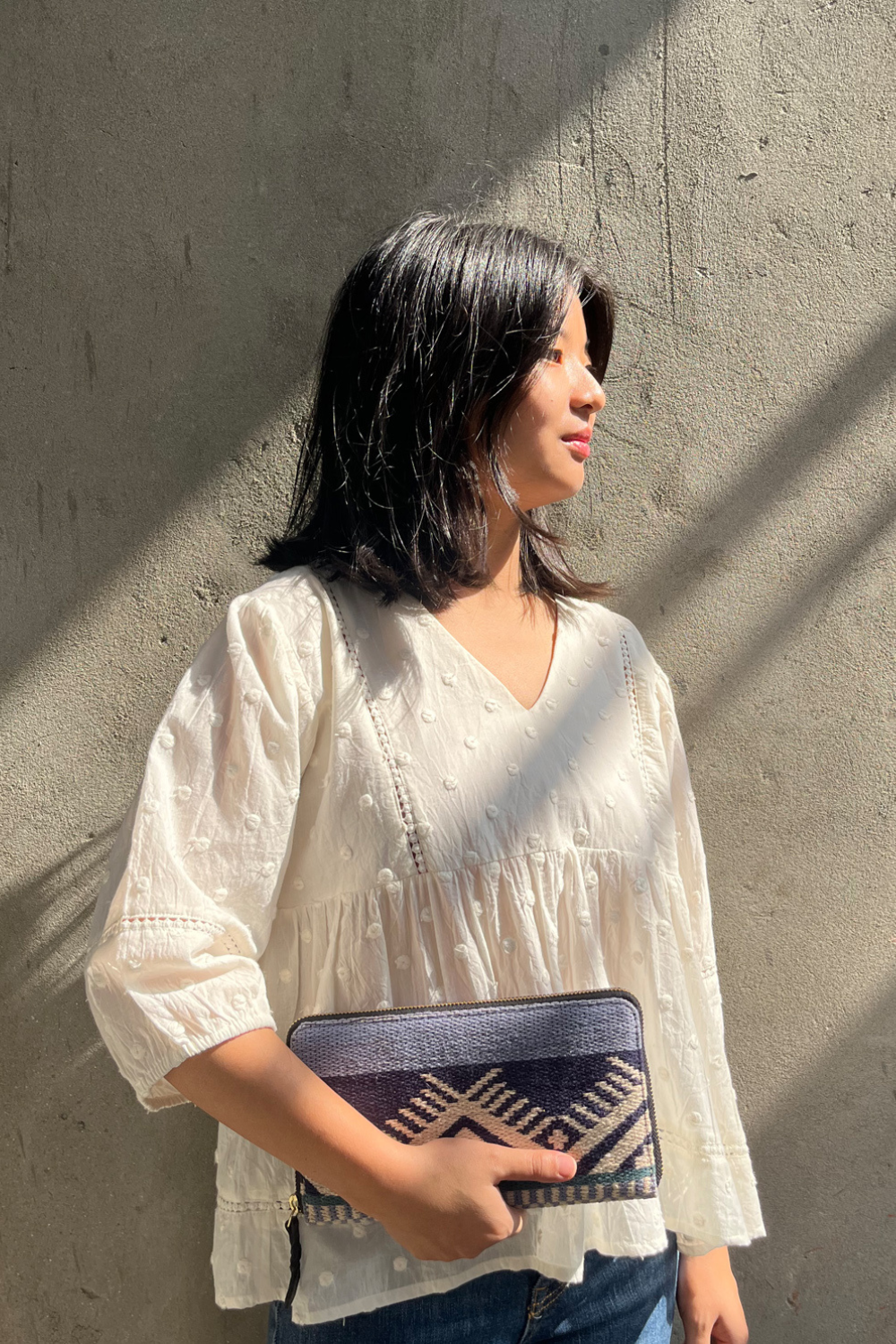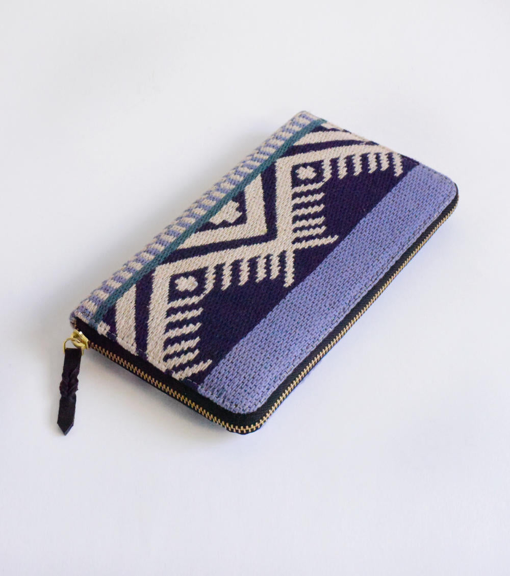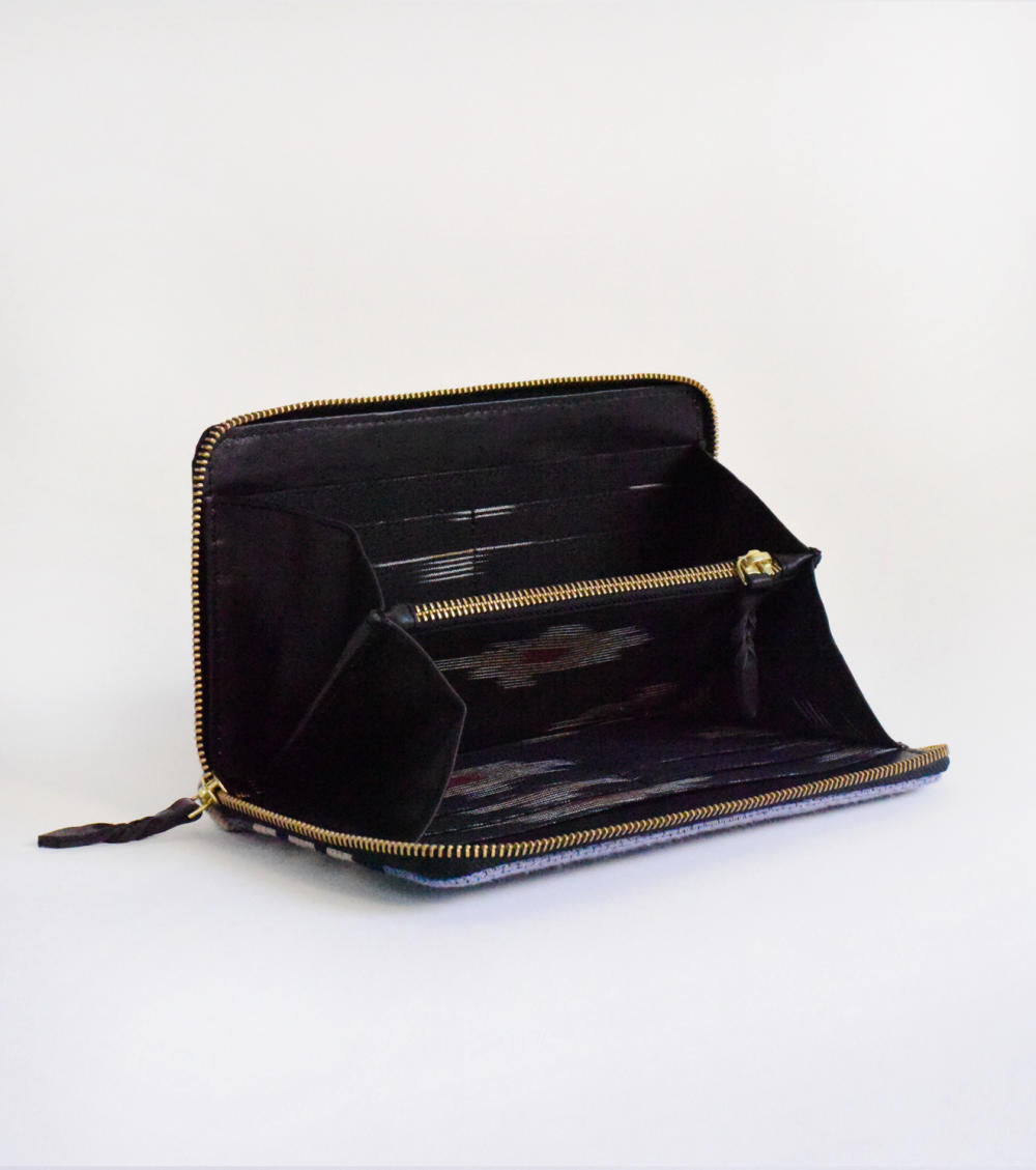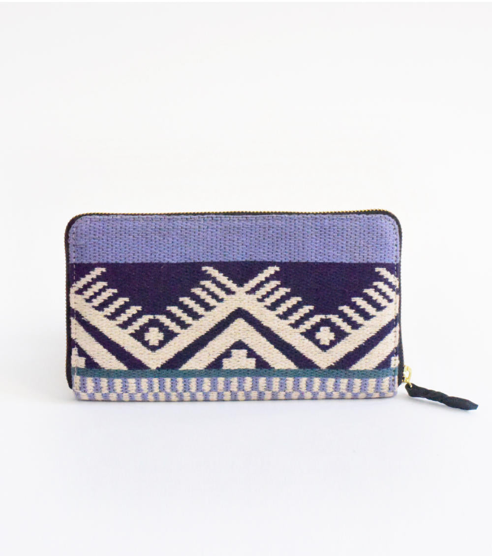 Zip-Around Wallet that effortlessly fits in your routine. Handcrafted in handloom cotton with ikat detailing inside. Features 2 compartments one zip pocket and 8 card holder