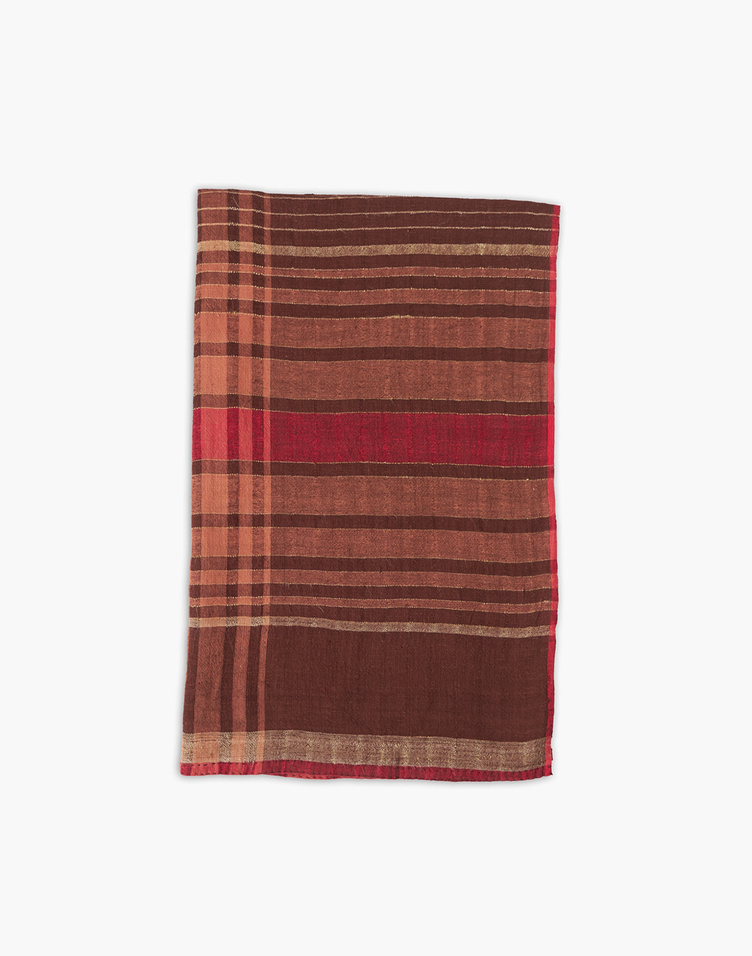 This elegant hand-spun and handwoven Maheshwari stole is a luxurious blend of conventional cotton and tussar silk. It features a rich, earthy plaid pattern in shades of deep maroon, chocolate brown, and beige, beautifully framed by a thin, vibrant red border. Crafted with azo-free vat dyes, this piece combines sophisticated style with a commitment to quality and safety.