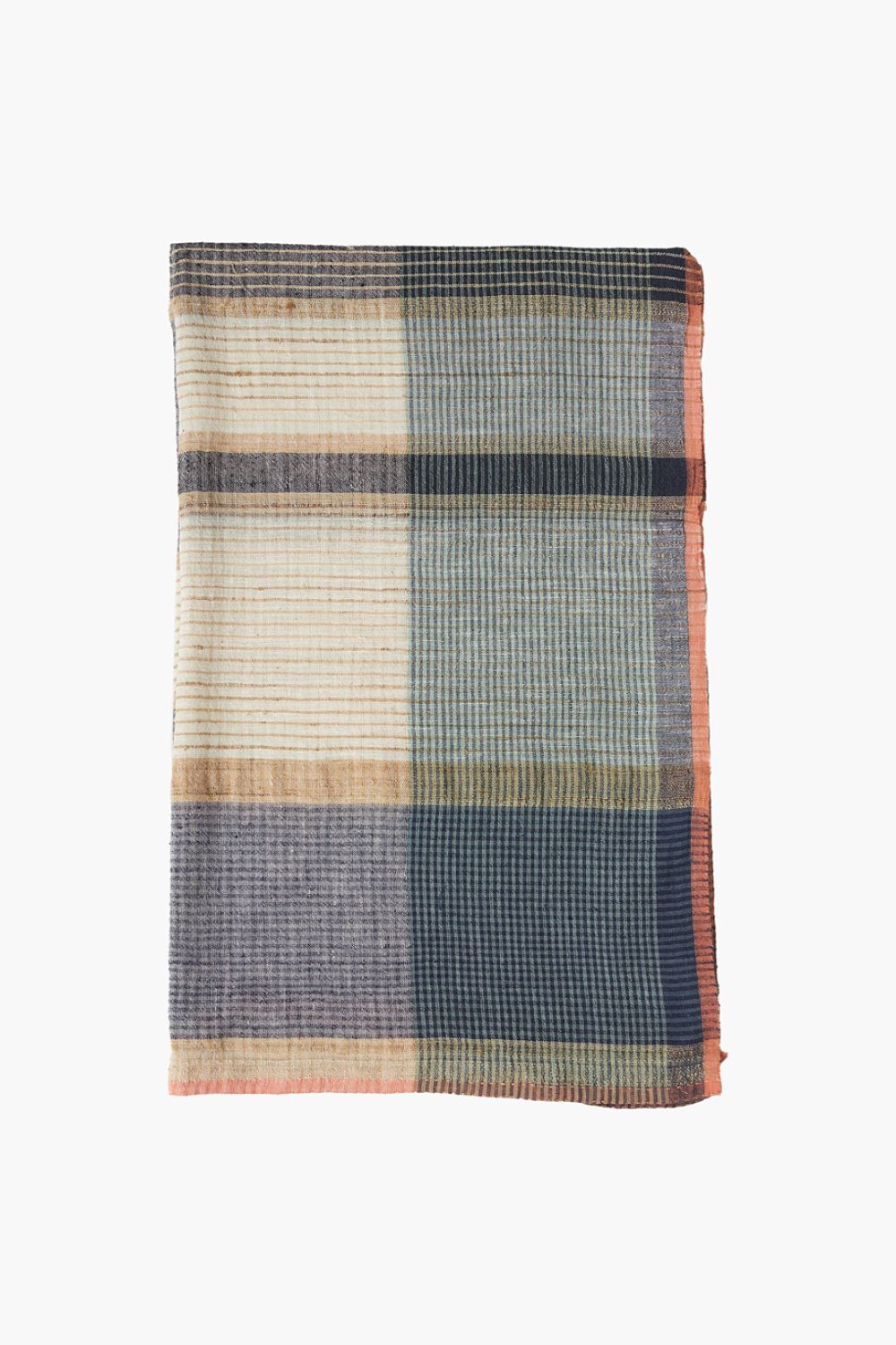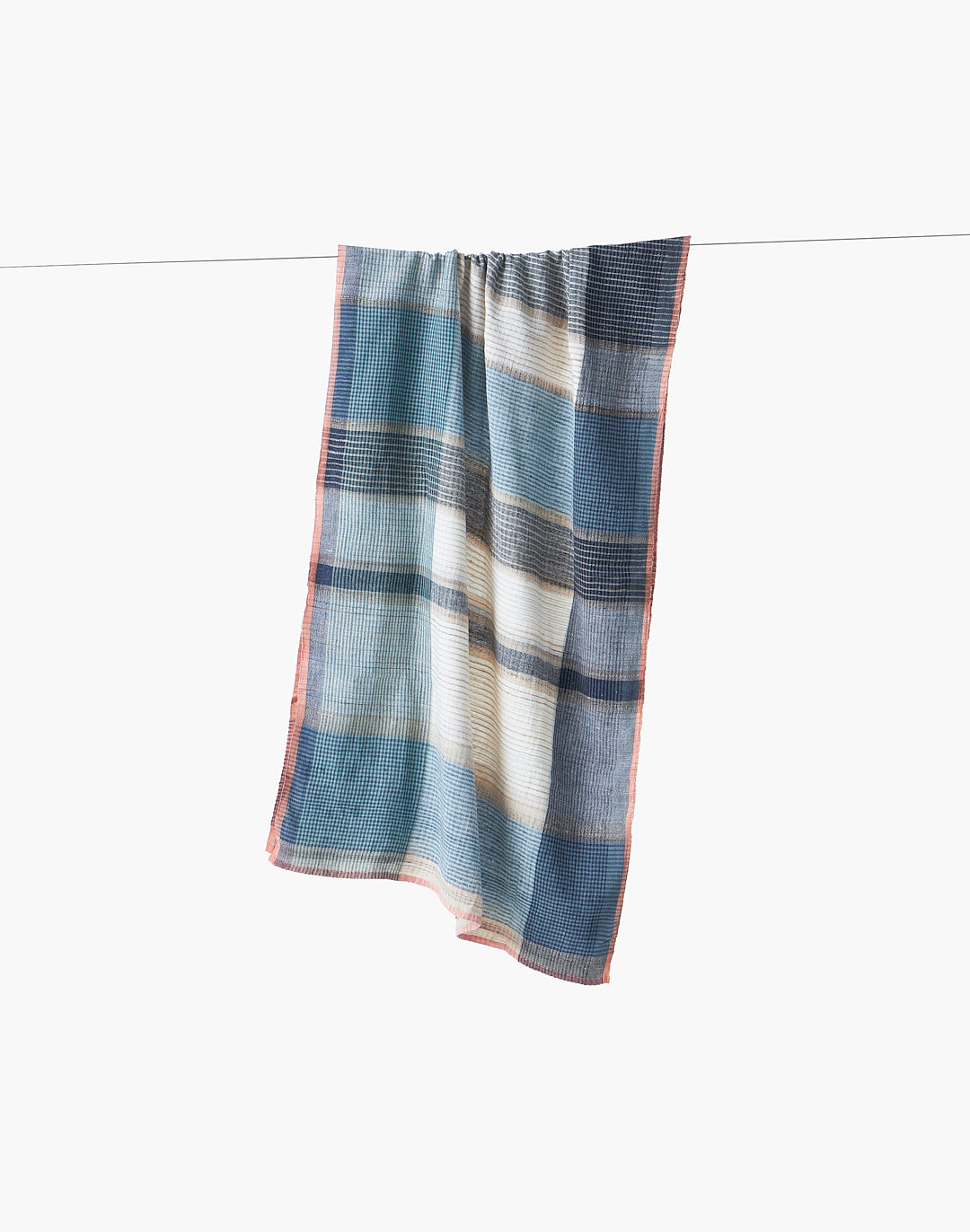 This hand-spun and handwoven Maheshwari stole blends conventional cotton and tussar to create a sophisticated check pattern in muted shades of slate blue, off-white, and beige. A fine, rust-colored border provides a subtle pop of contrast. The stole is colored with azo-free vat dyes, ensuring both quality and safety. Its versatile design makes it ideal for a variety of casual and formal occasions.