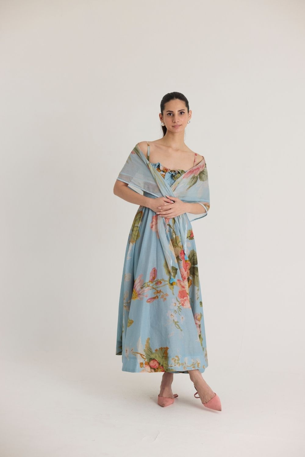 This scarf features an elegant floral print set against a soft pastel blue base, evoking a romantic and vintage-inspired aesthetic. The delicate, hand-painted blooms in soft pinks, warm greens, and subtle yellows add a timeless charm to this versatile accessory. The lightweight fabric drapes beautifully, making it a graceful addition to any outfit.