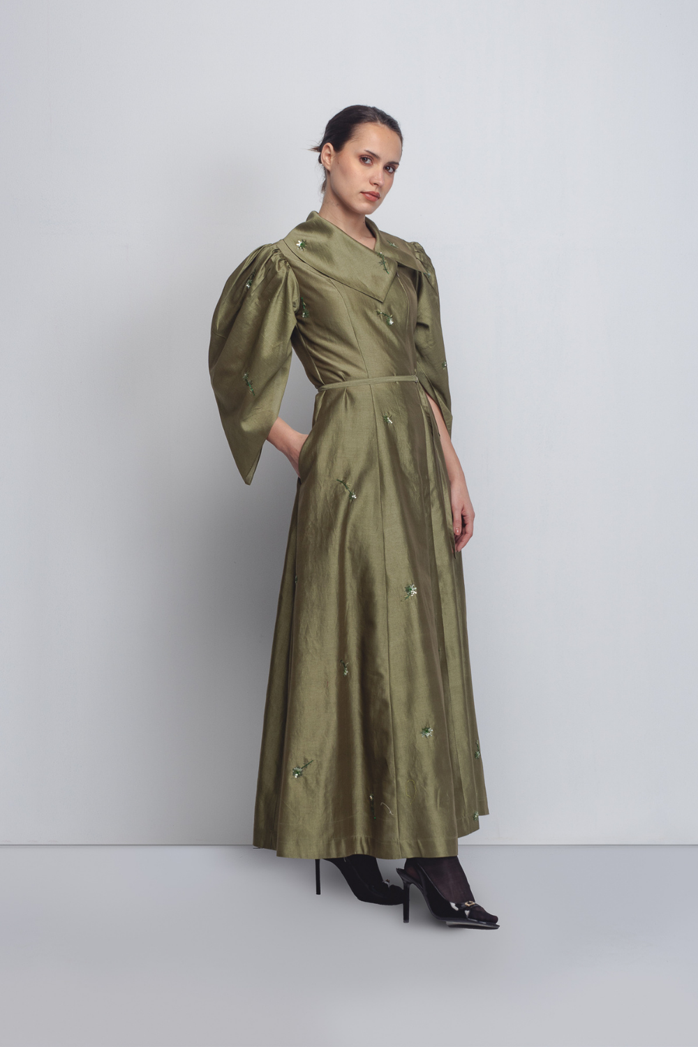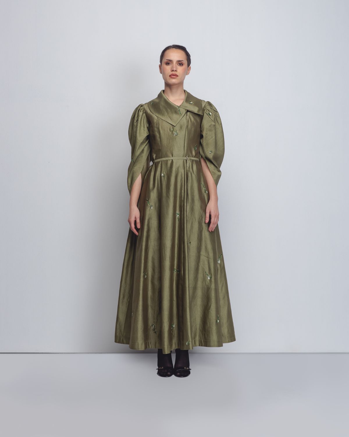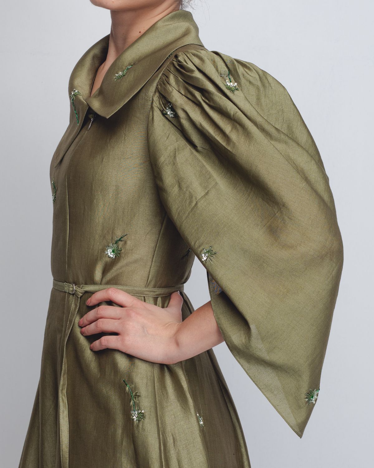 Crafted in Chanderi, this dress features a front zipper opening integrated into an architectural bodice with a wide, structured lapel and a delicate tie-belt to define the waist. The dramatic leg-o-mutton sleeves add significant volume at the shoulders before tapering elegantly toward the forearms. The entire piece is elevated by intricate floral embellishments scattered across the fabric. The model is 5 ft 8 inches and the garment length is 55 inches.