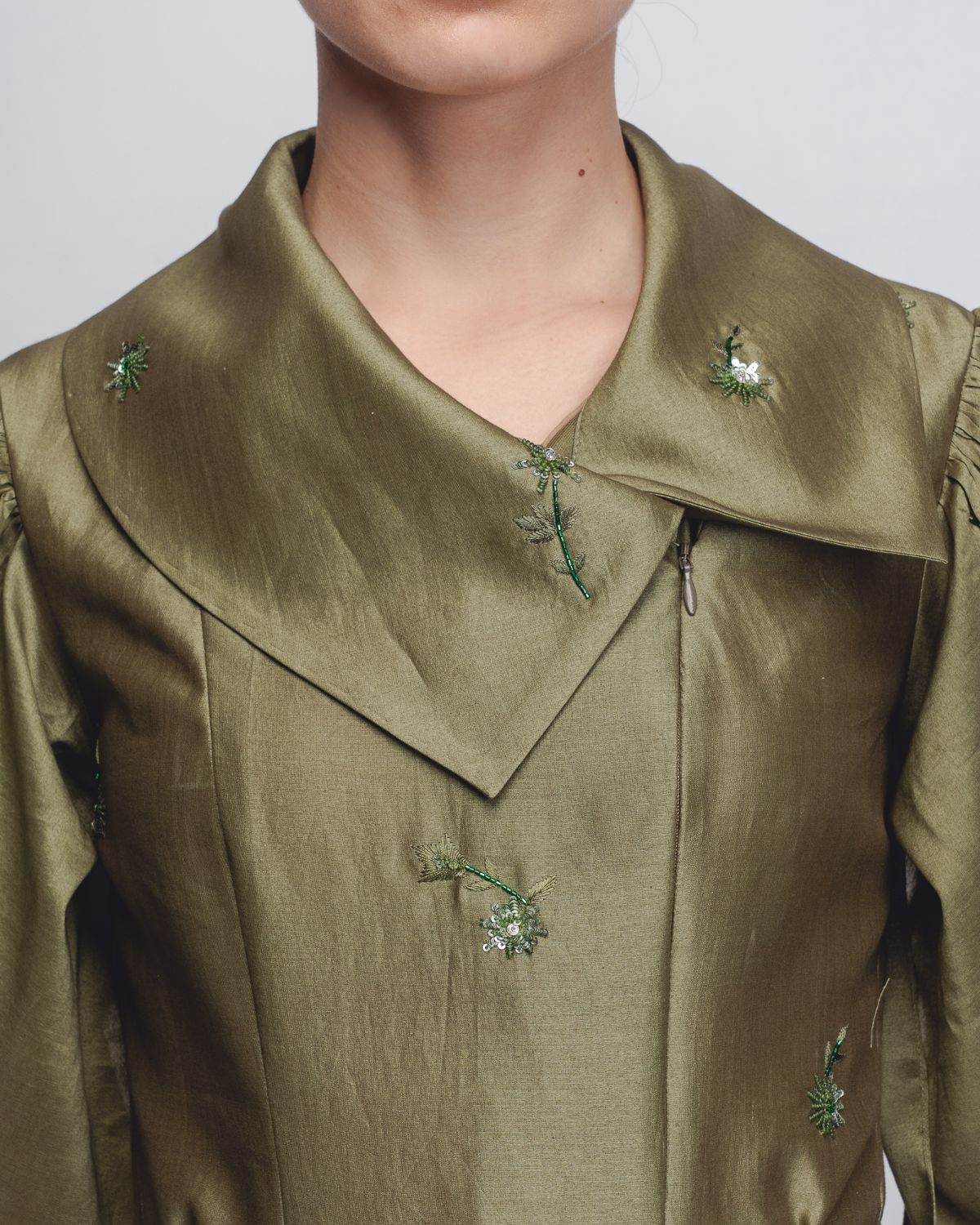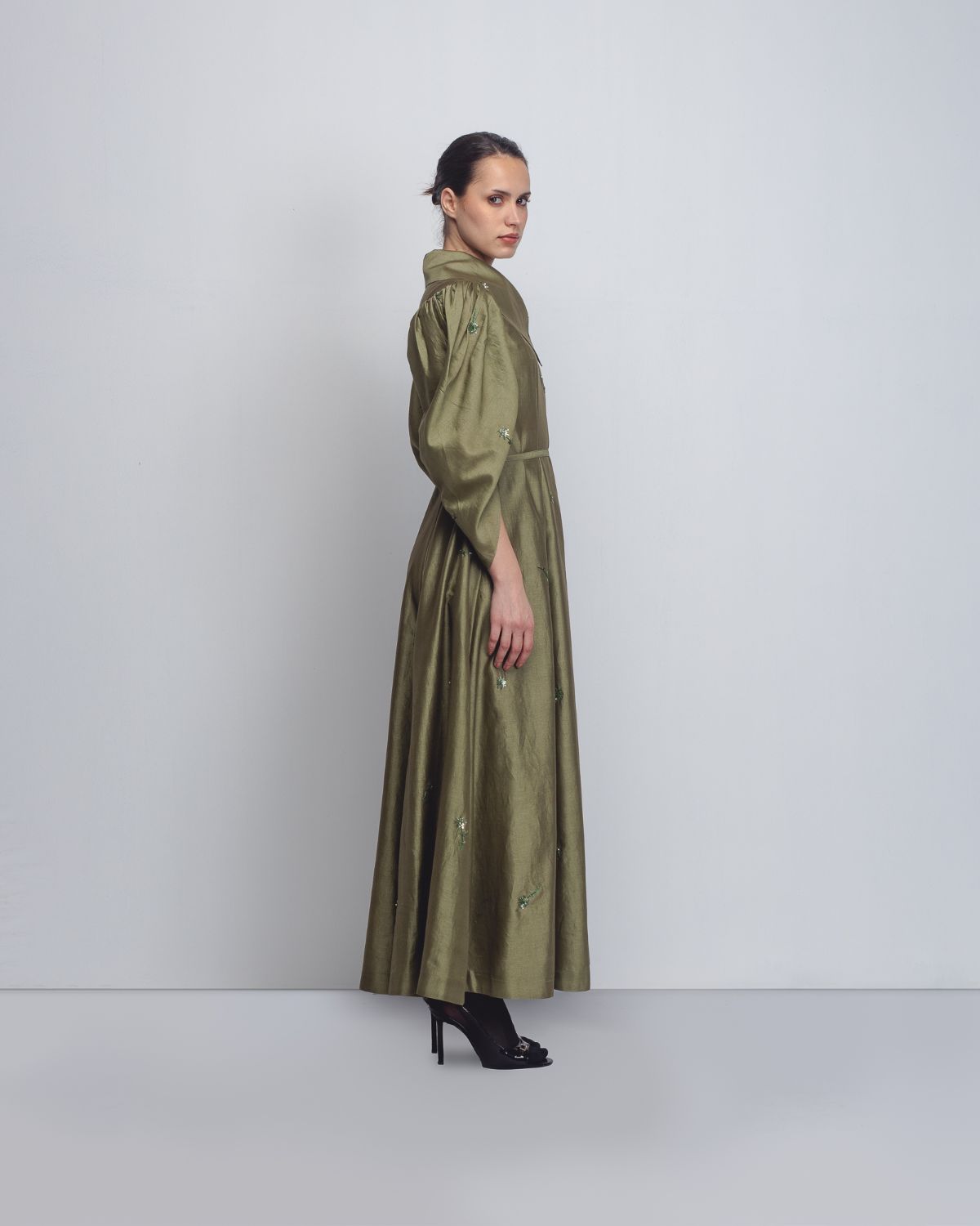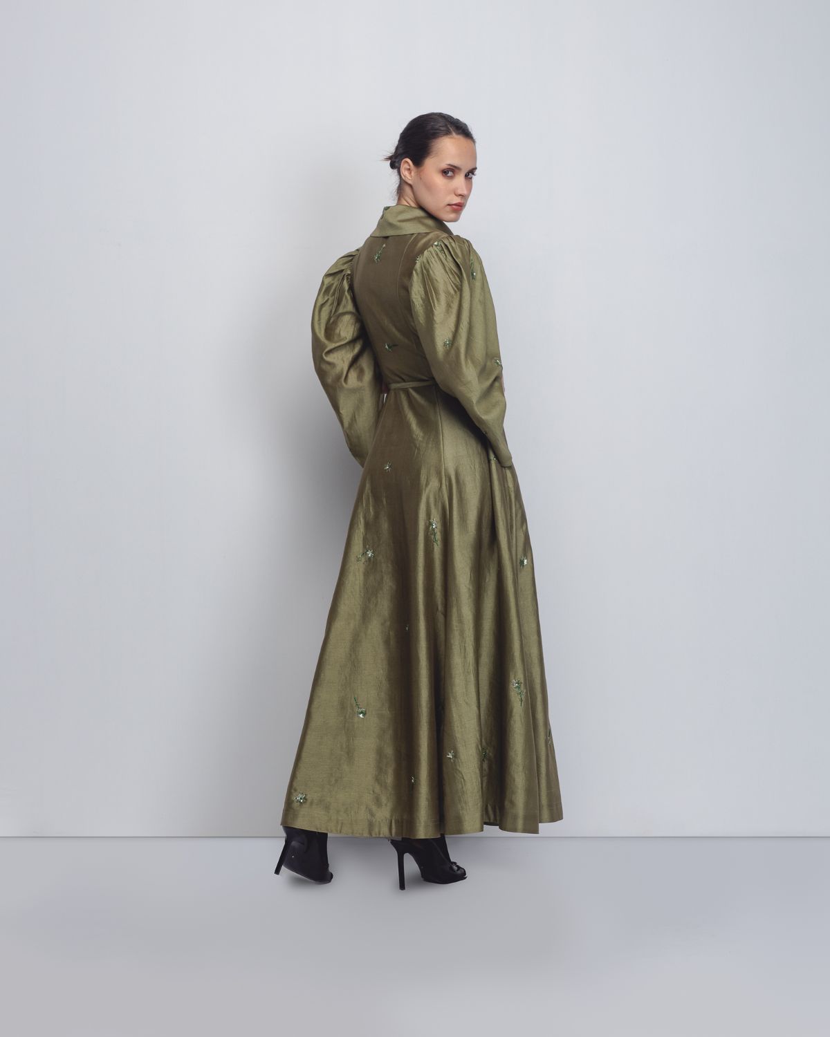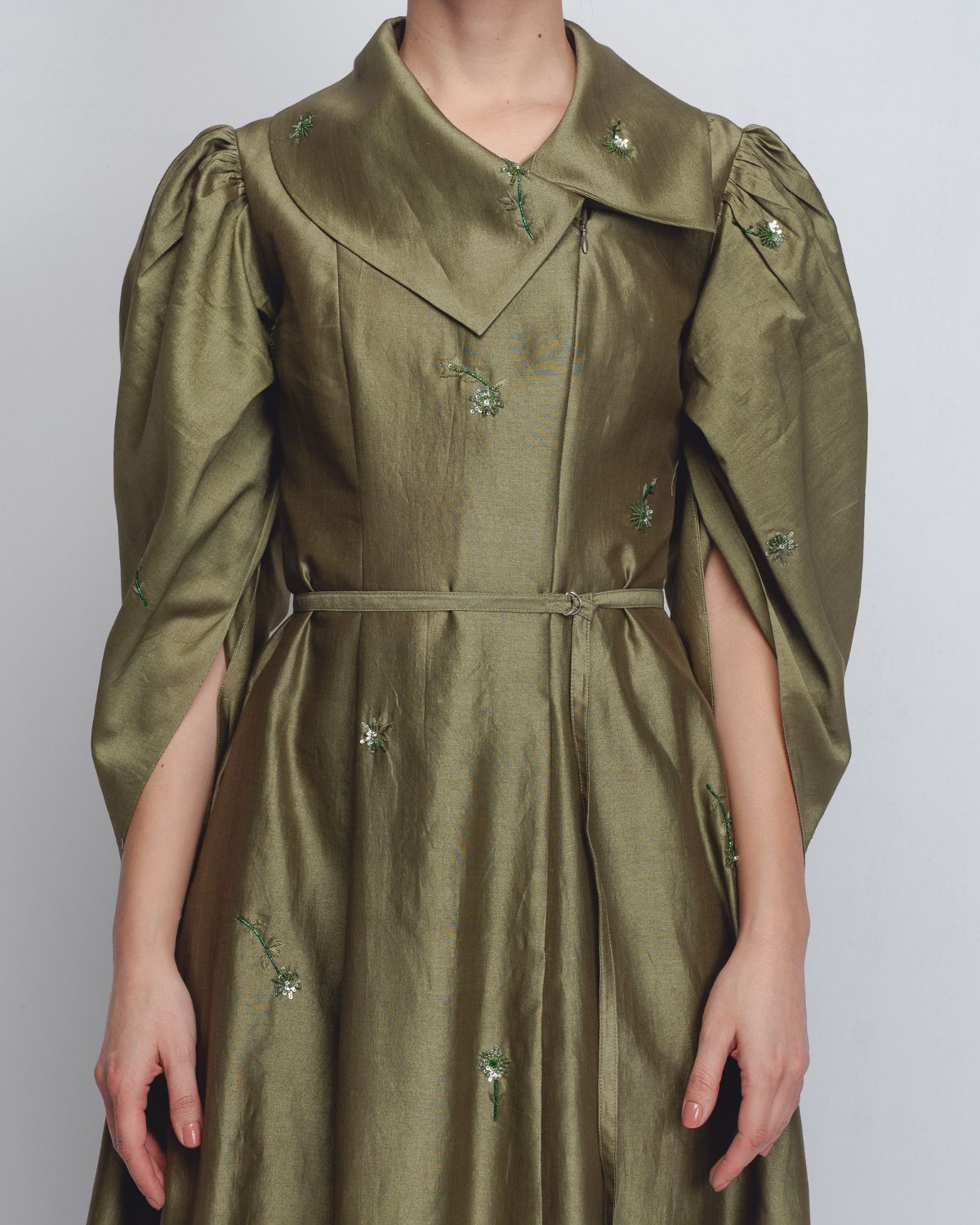 Crafted in Chanderi, this dress features a front zipper opening integrated into an architectural bodice with a wide, structured lapel and a delicate tie-belt to define the waist. The dramatic leg-o-mutton sleeves add significant volume at the shoulders before tapering elegantly toward the forearms. The entire piece is elevated by intricate floral embellishments scattered across the fabric. The model is 5 ft 8 inches and the garment length is 55 inches.