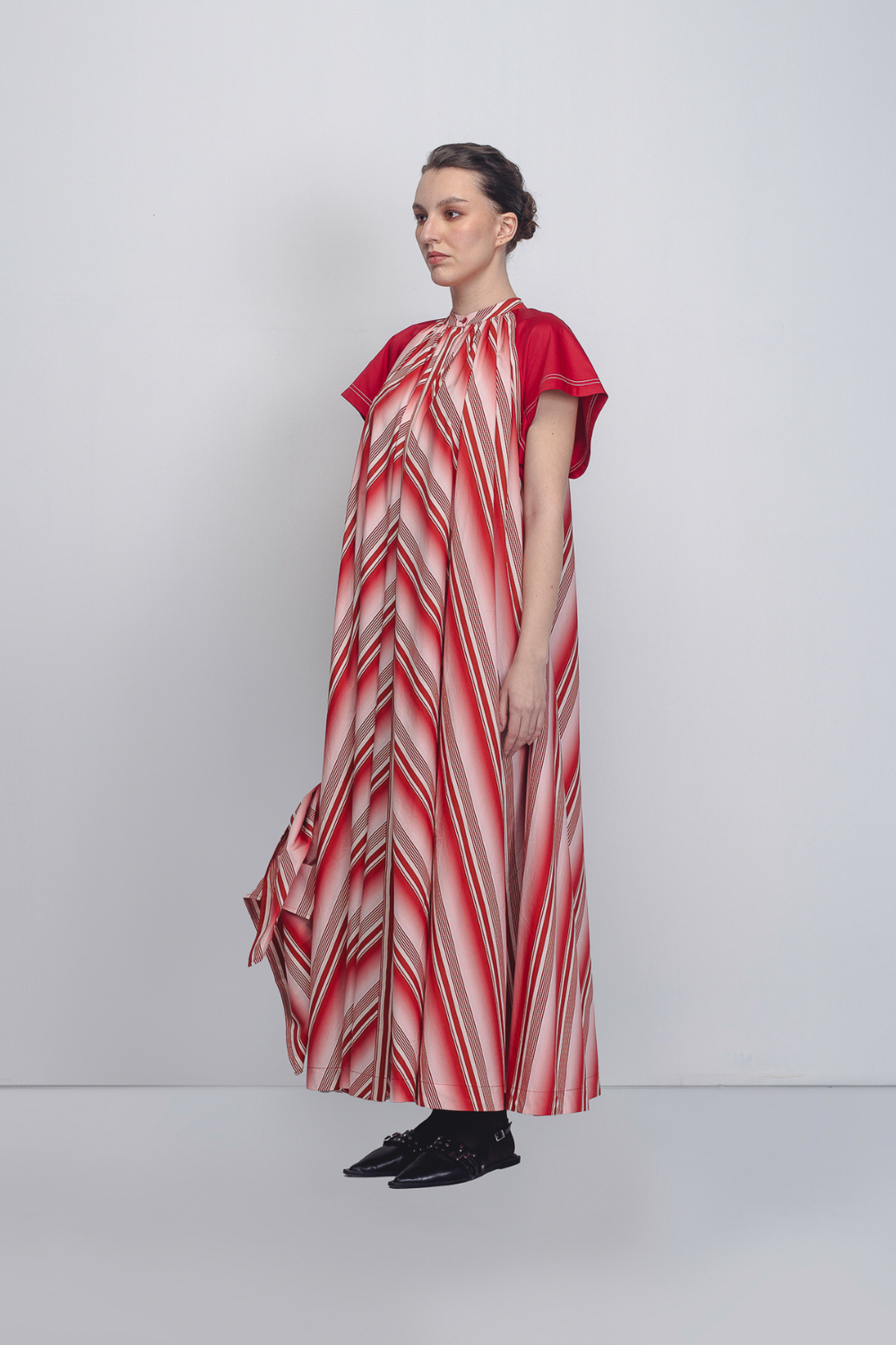 A playful, graphic take on the classic tent dress silhouette, this garment is crafted in striped 100% Cotton Poplin. The design features a high, gathered neckline and a functional button front opening, transitioning into a sweeping A-line frame. Contrasting structured black cap sleeves provide a sharp architectural counterpoint to the fluid body. The model is 5'10 and the garment length is 55 inches.