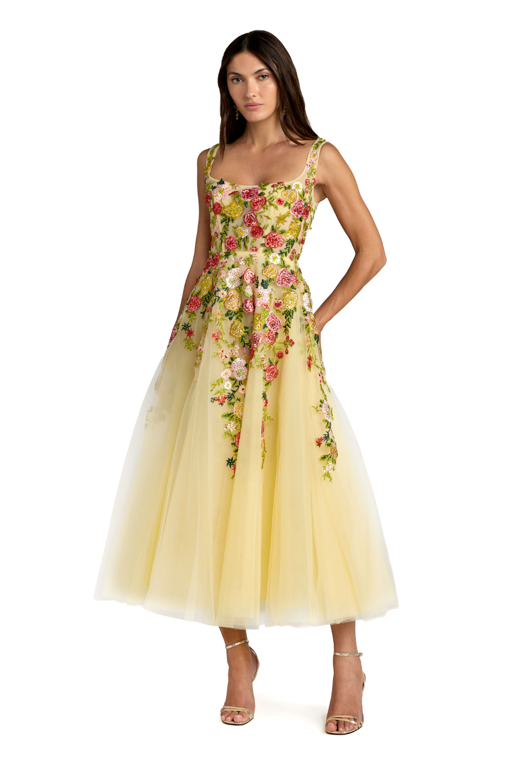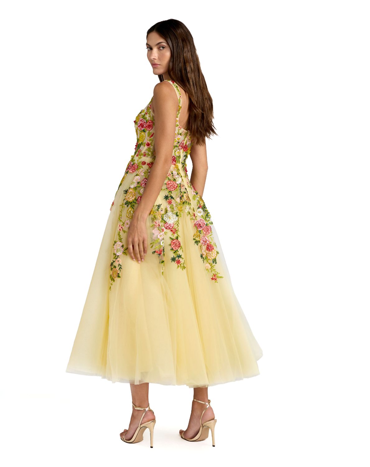 21294 - Yellow Embroidered Tulle A-Line Midi Dress