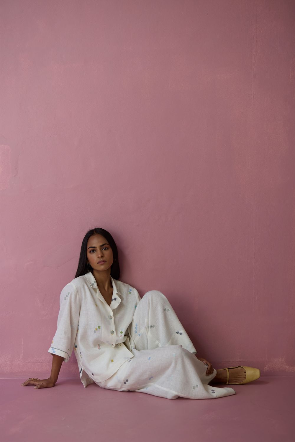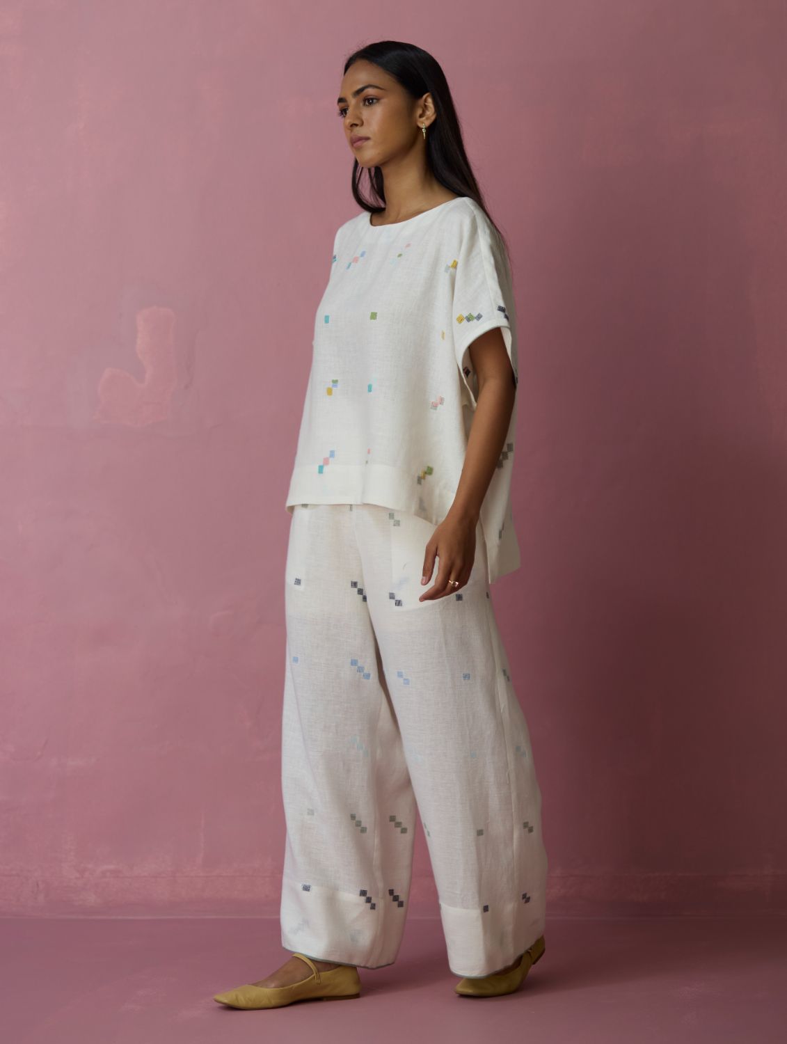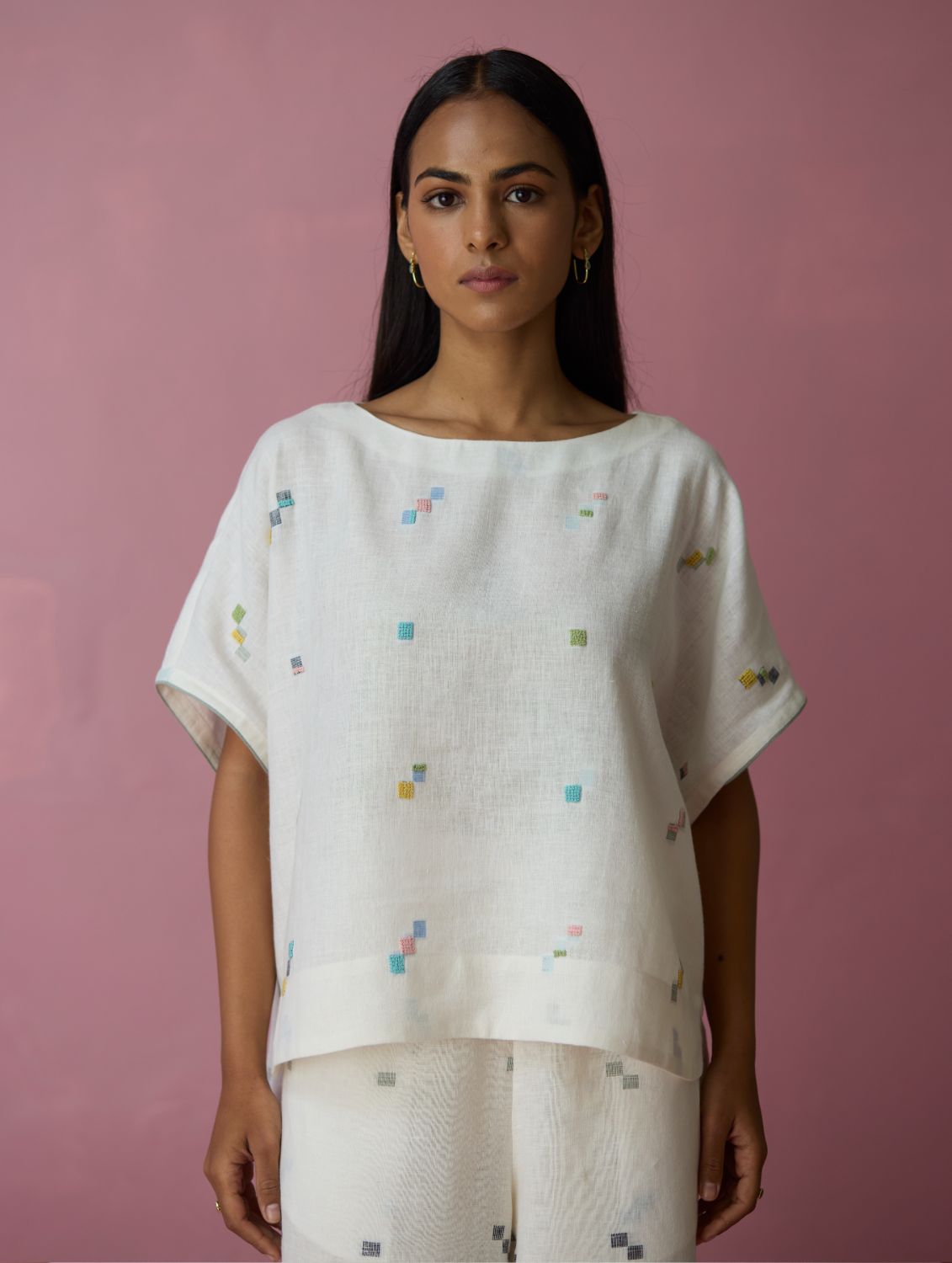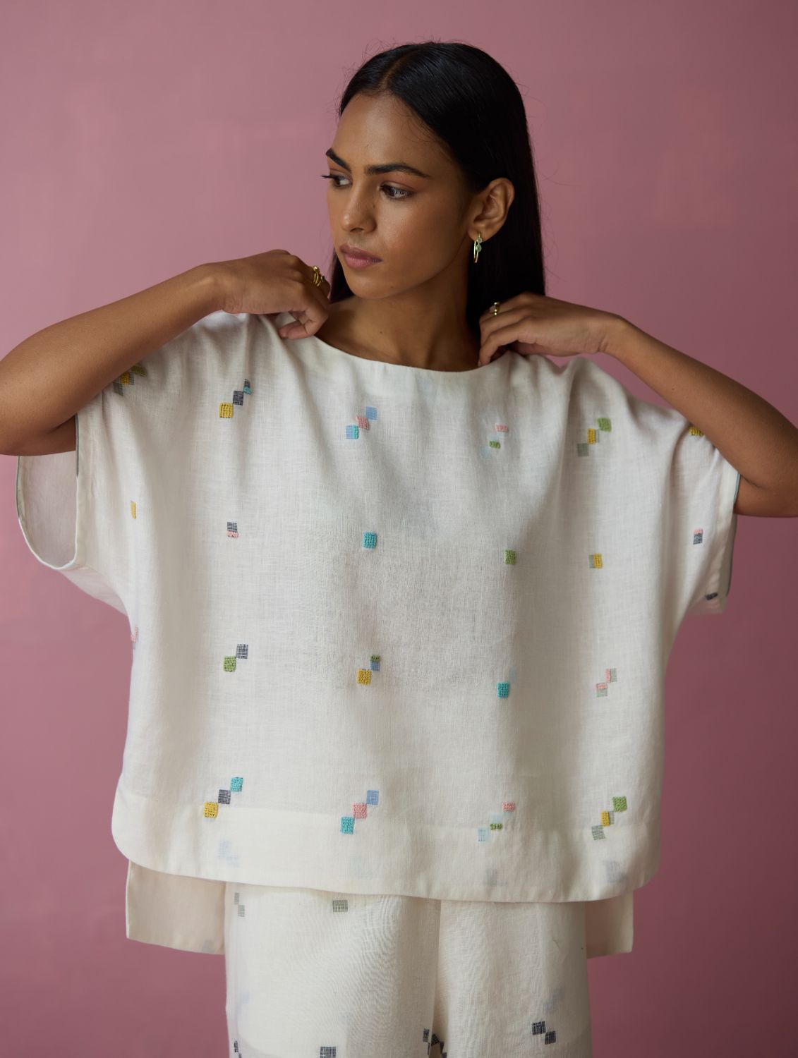 The Kanni top is thoughtfully crafted in our handwoven soft jamdani linen weave with a distinctive varying 4-colour square motif weave pattern. Designed with a boat neckline and a relaxed silhouette, the Kanni has colourful and intricate french knot embroidery delicately scattered across the jamdani motifs in multiple colours. The top is finished with an uneven side slit for movement and flow, while a woven selvedge edging at the sleeve hem adds a contrast. A timeless breathable piece designed for effortless everyday wear.