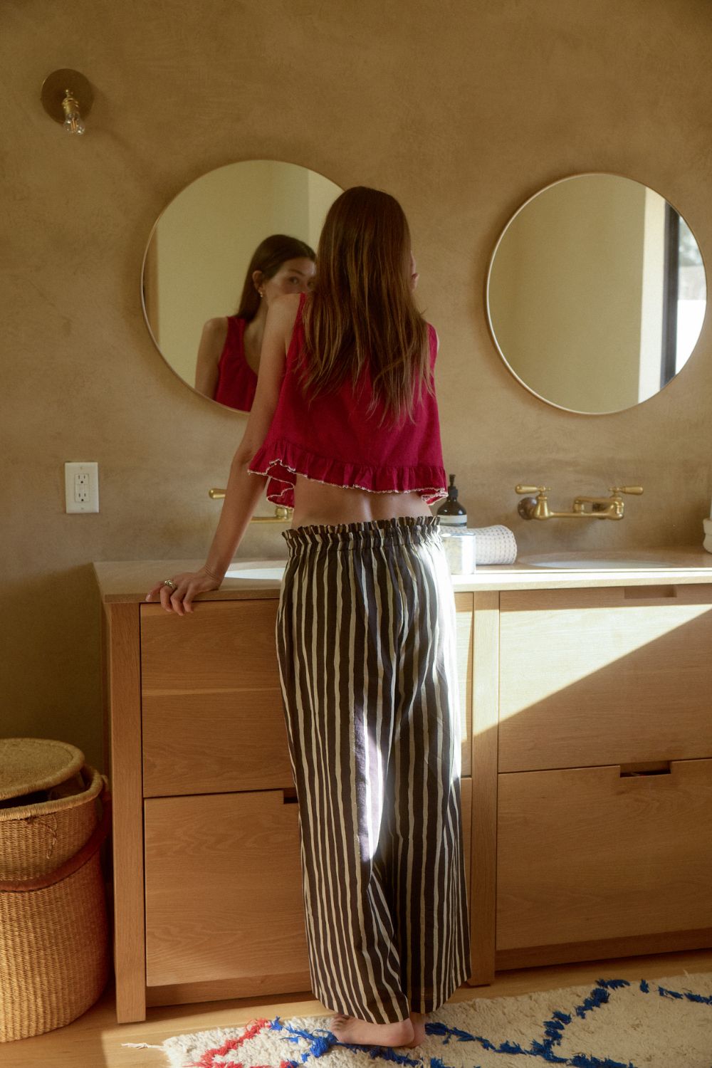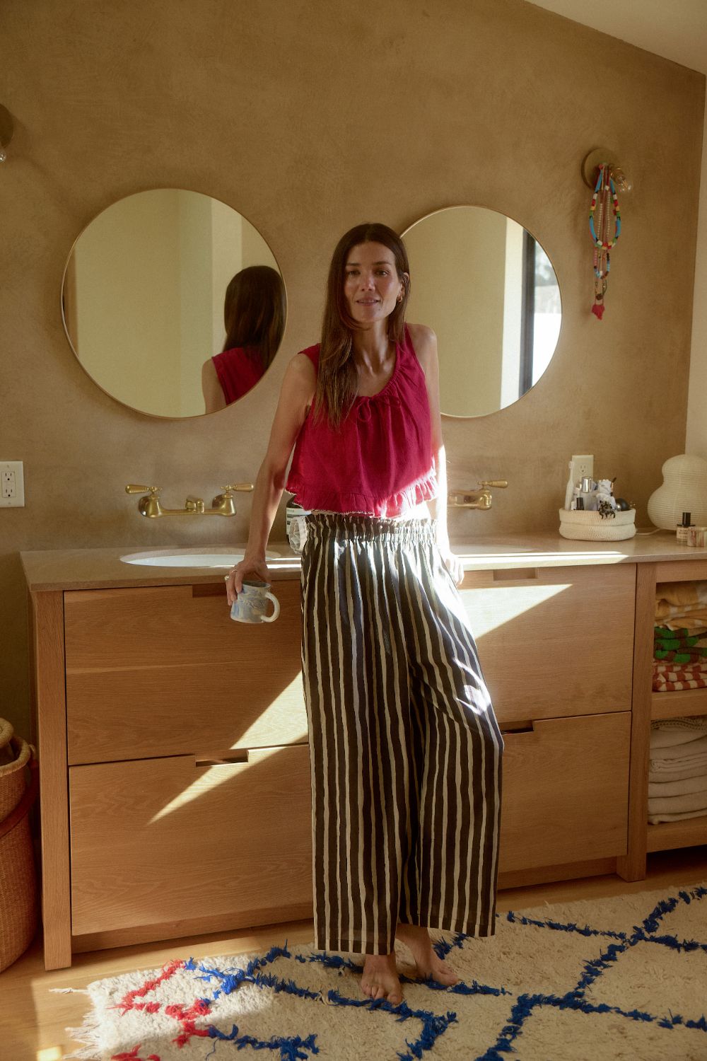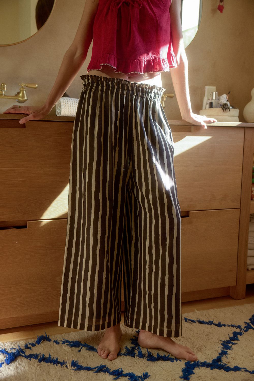 An easy silhouette with graphic rhythm, the Zebra Stroll Pants – Sand reinterpret stripes through a softer, organic lens.