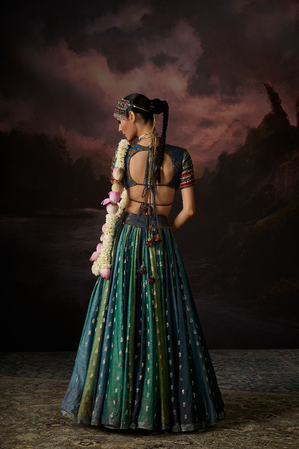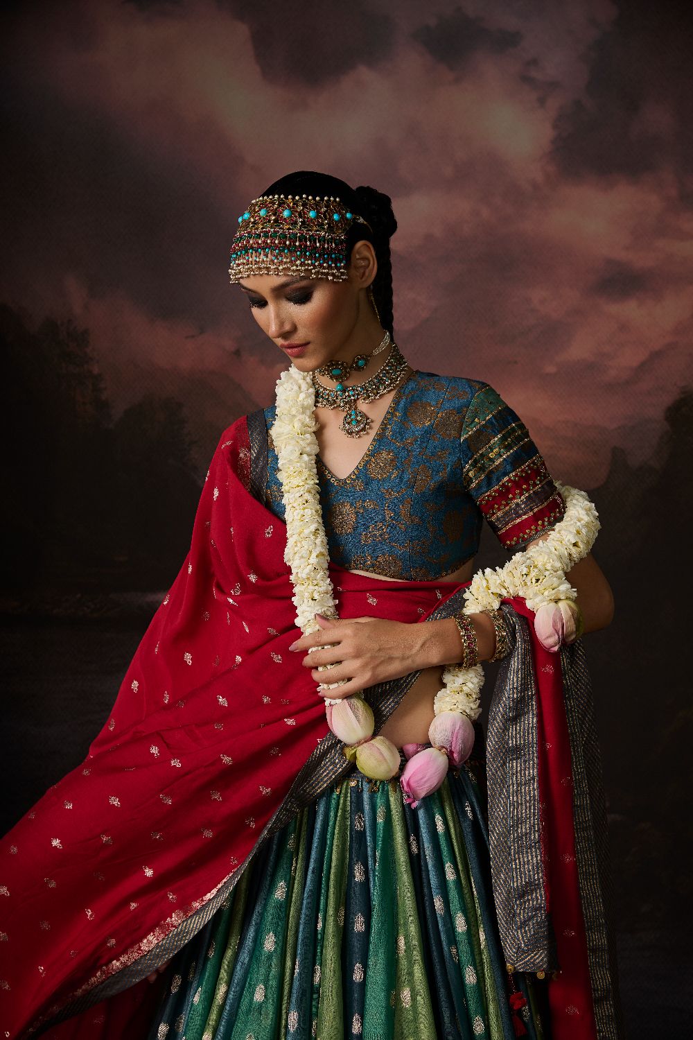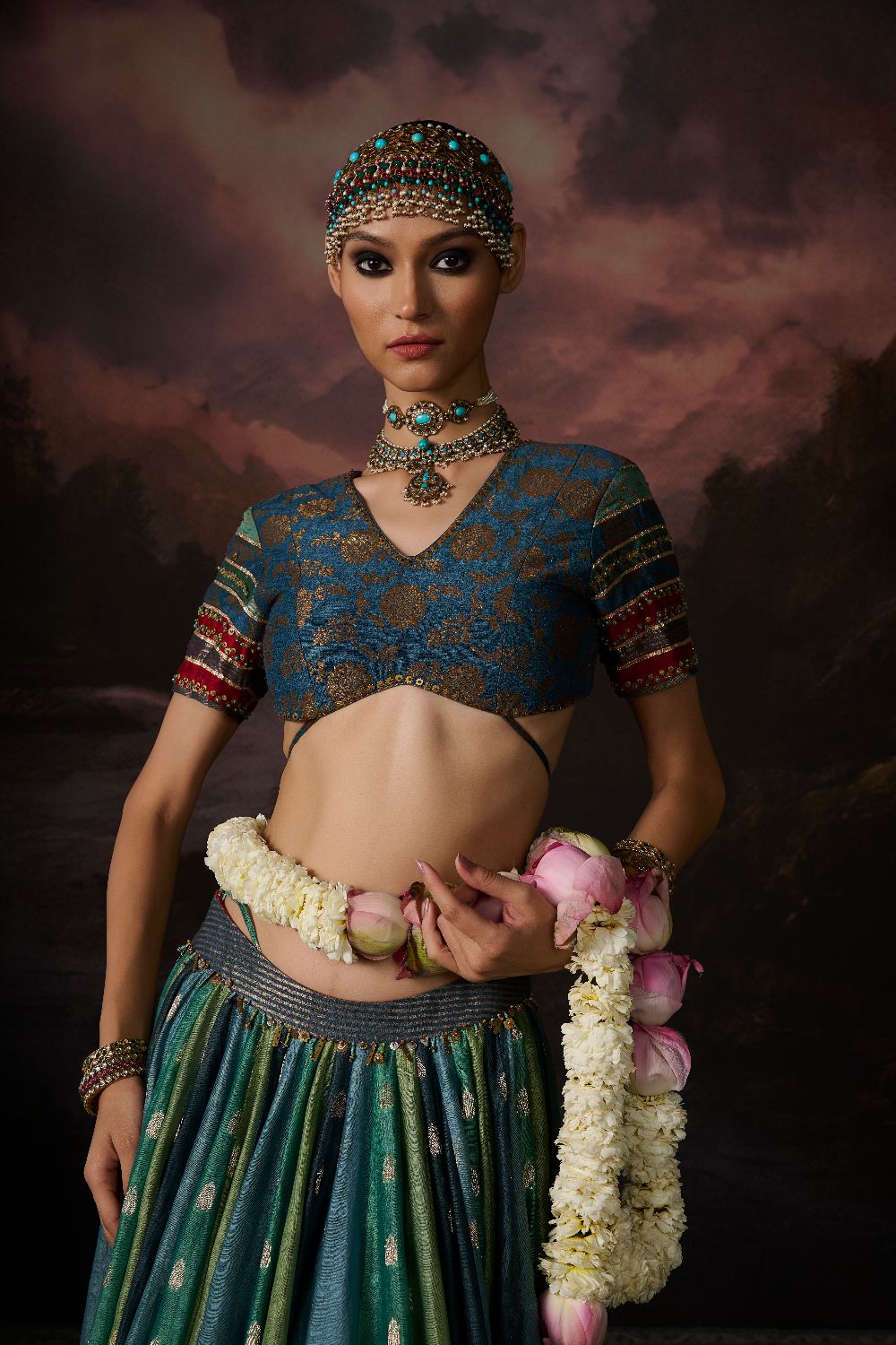 Handwoven Muga Silk Brocade Antique & Handwoven Chanderi Zari Stripe Blouse Lined With 100% Cotton, Embellished With Sleeve Splicing, Gota Lines, Beaded Details, and Tassels