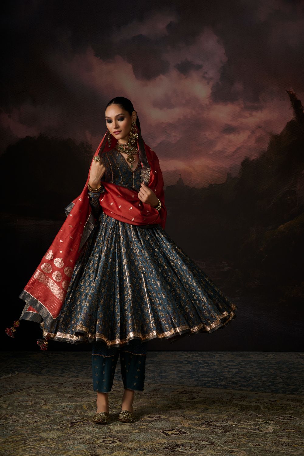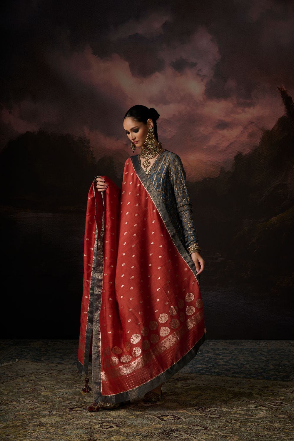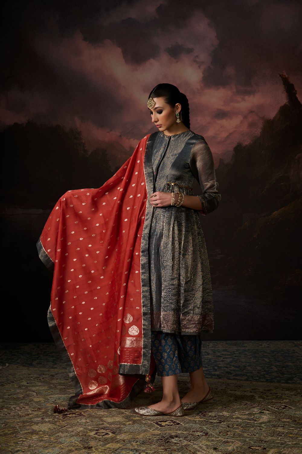 Her Chanderi carries its signature translucence and soft sheen, but with a subtlety that feels almost ethereal — printed slowly, consciously, through hand block printing that heightens the fabric's inherent delicacy.