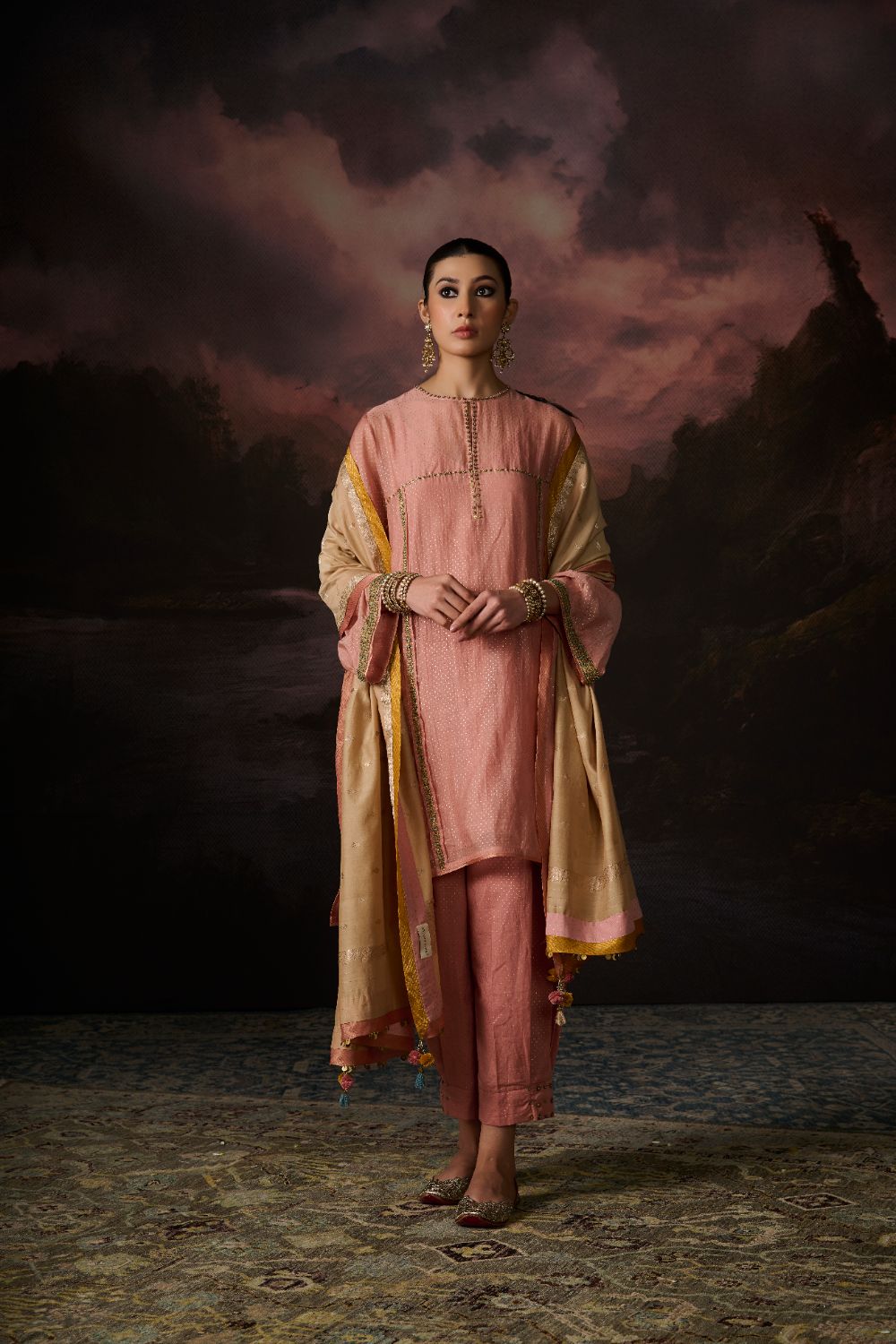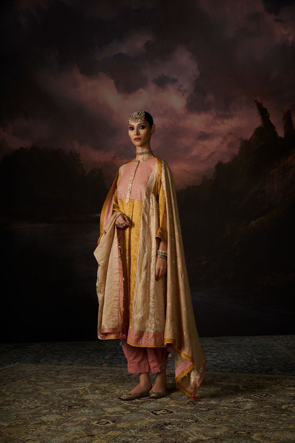 Color:GOLD WITH MUSTARD YELLOW & DUSTY PINK BORDER