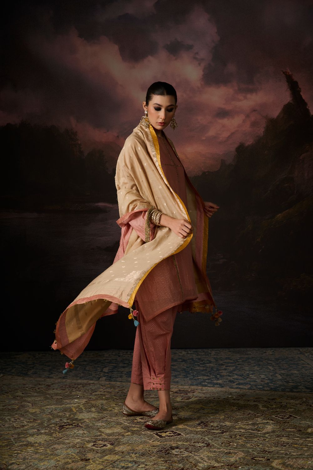 Her Chanderi carries its signature translucence and soft sheen, but with a subtlety that feels almost ethereal — printed slowly, consciously, through hand block printing that heightens the fabric's inherent delicacy.