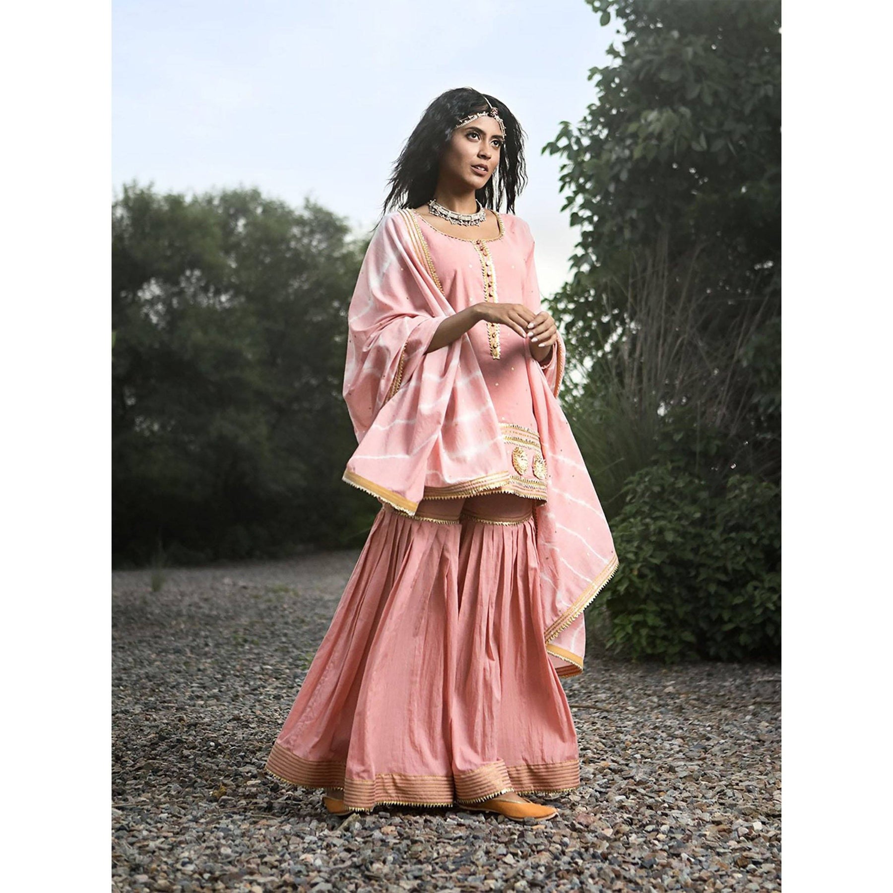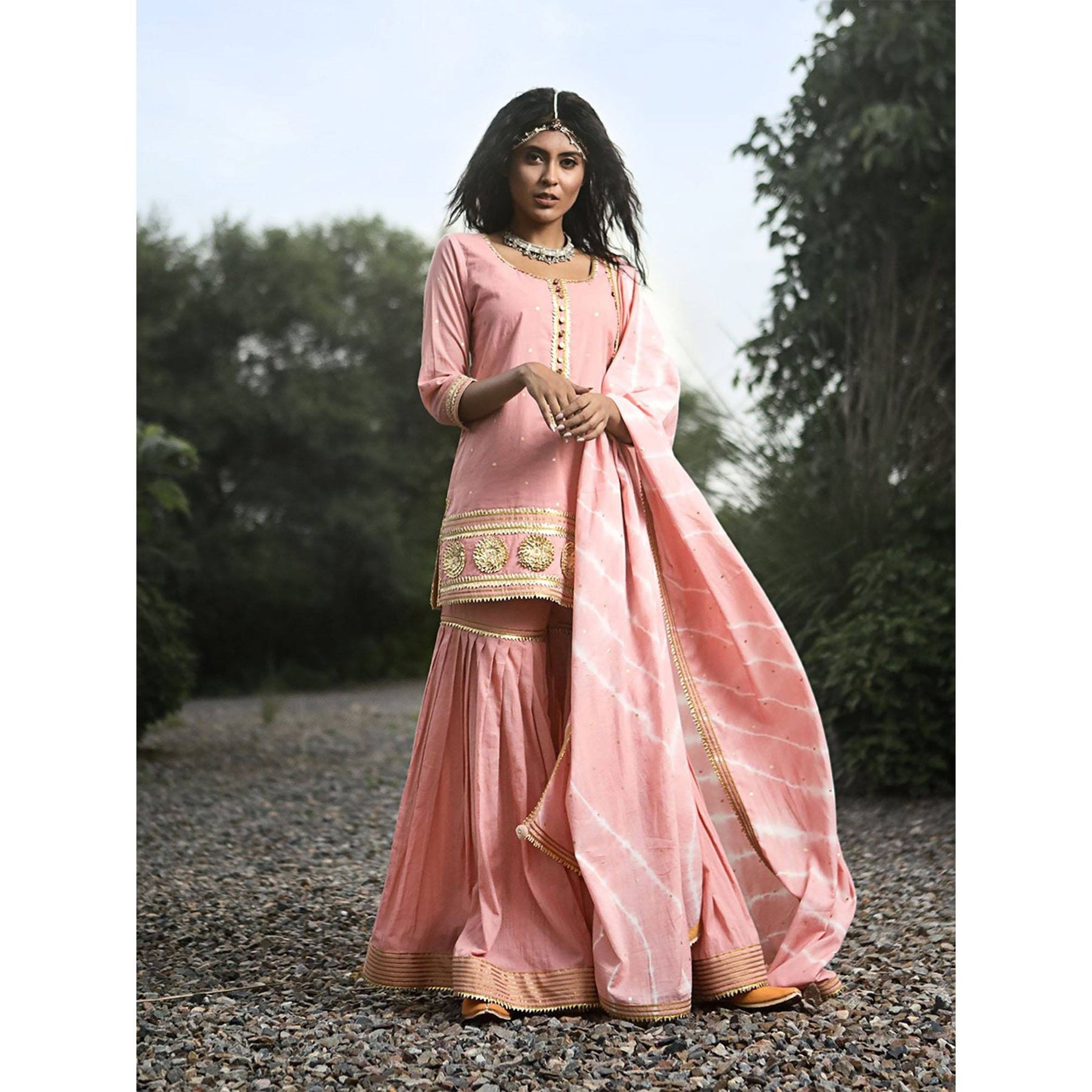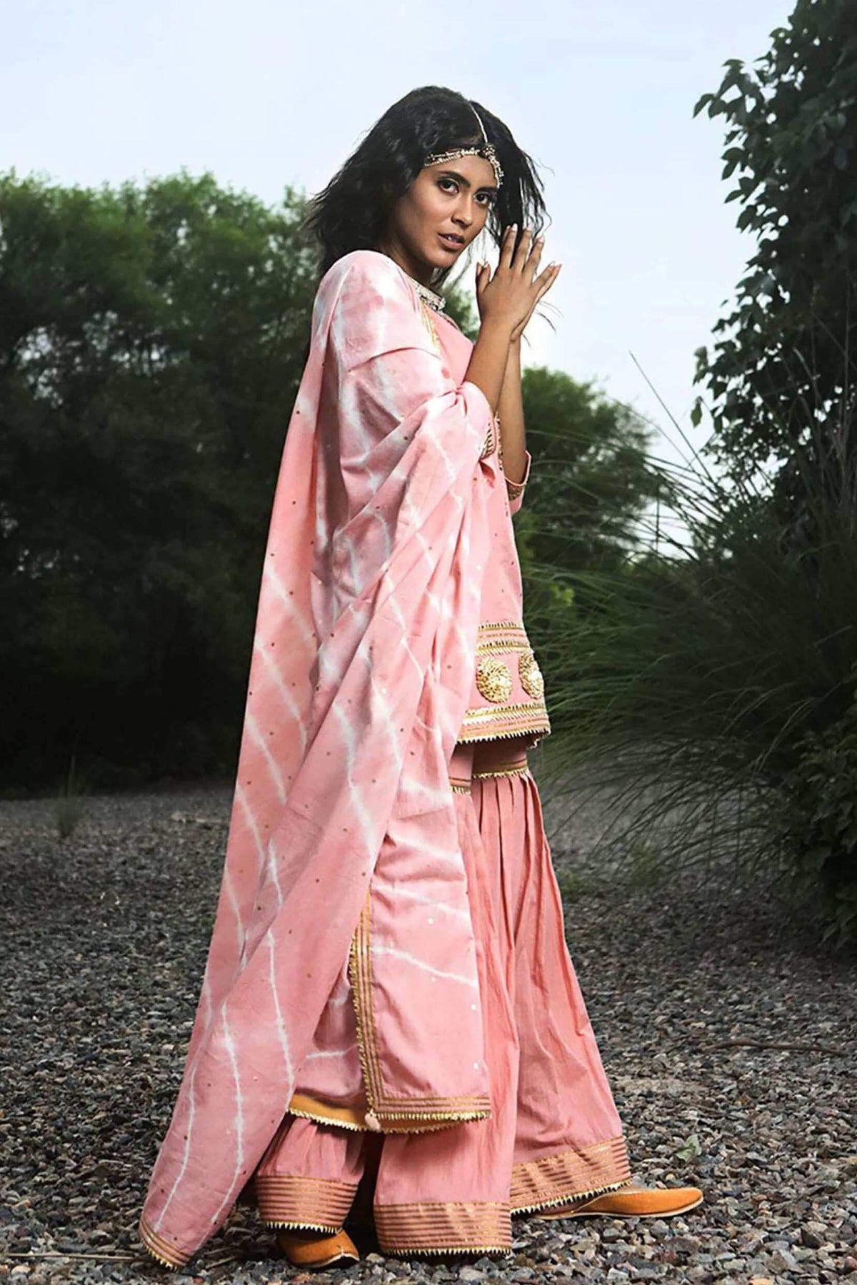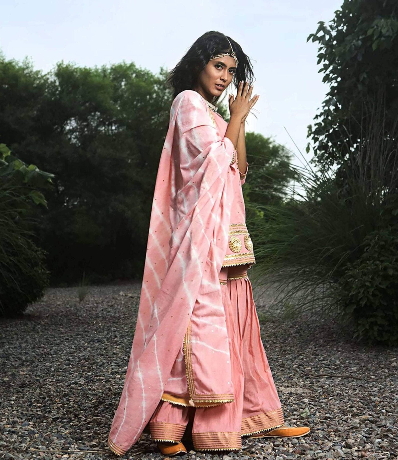 The blush pink kurta and sharara set detailed with foil print, and intricate lace and gota work all across, steals its inspiration from her blooming back yard.