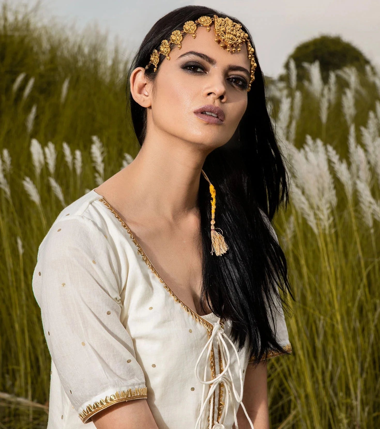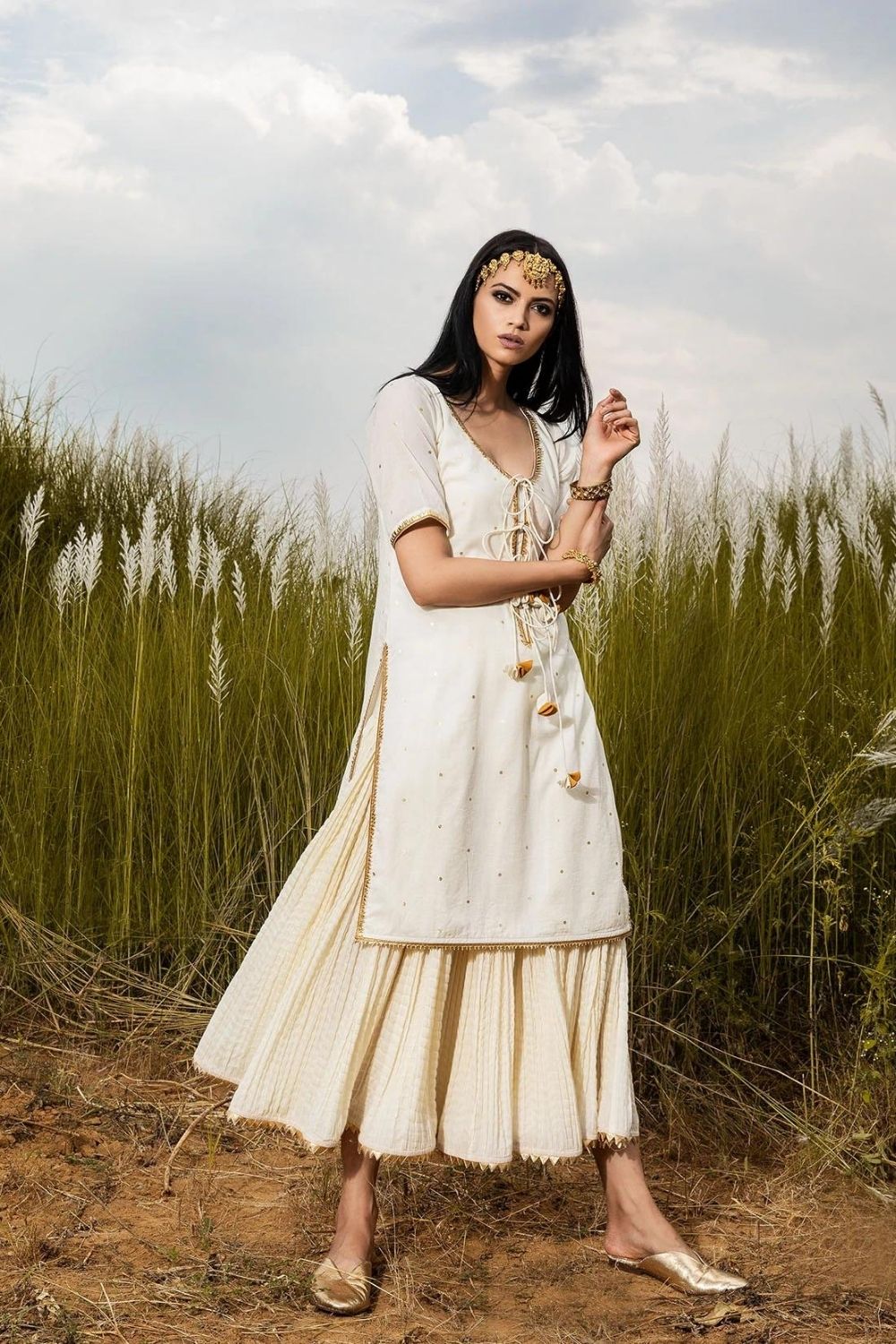 Ivory crinkle bottom dress with an ivory overlay kurta shirt. We elongate the bodice and accentuate the neckline with tie up tassels in contrast colors. Festive glitter sparkles through delicate details of gota on hemlines. Perfect balance of tradition and comfort. Pair this classic style with gold mules and chunky gold jewellery and you are ready to turn heads this festive season.