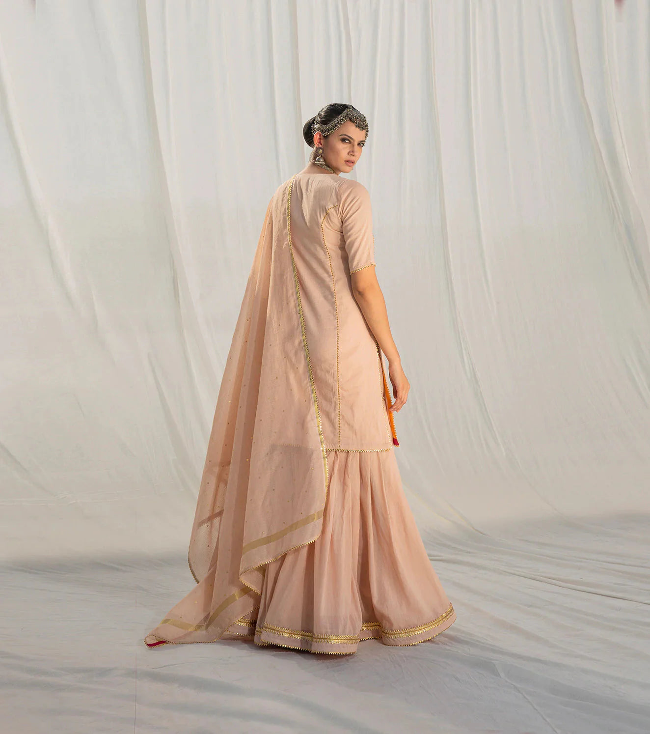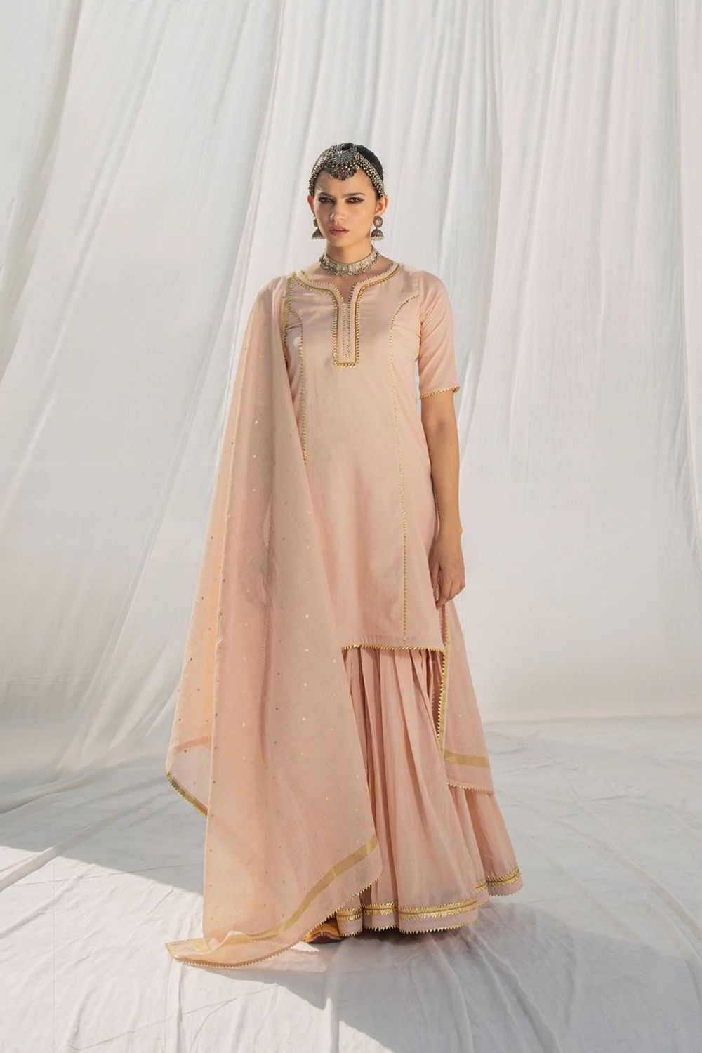 Our blush and gold sharara set has an old world charm with its delicate and lightweight finish in soft mulmul fabric. It's well tailored and finely finished with intricate gota work in gold. The mulmul fabric gives it a dreamy and mystical feel. The dupatta comes with a kota doria border and overall gold foil polka print adding a pinch of color to this timeless piece.