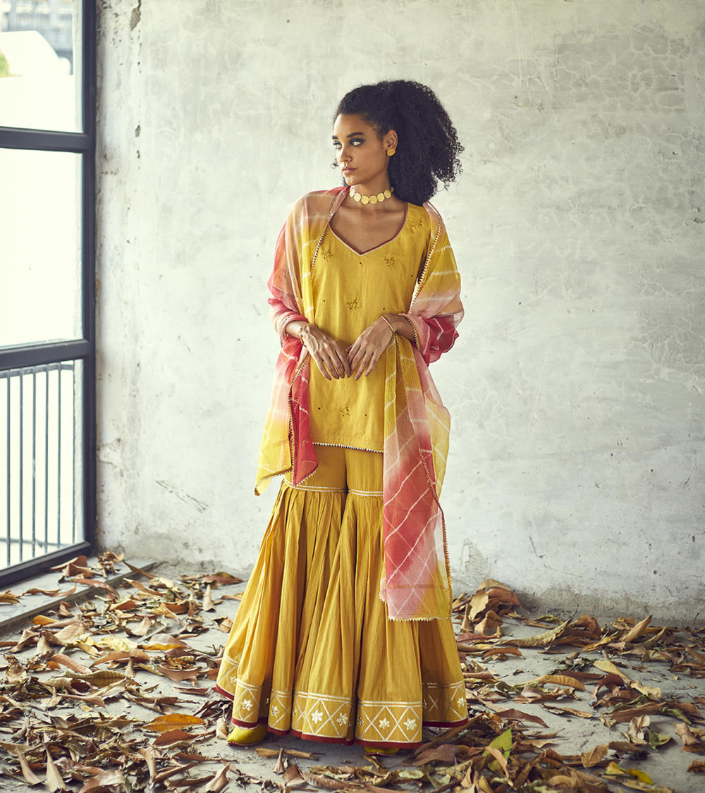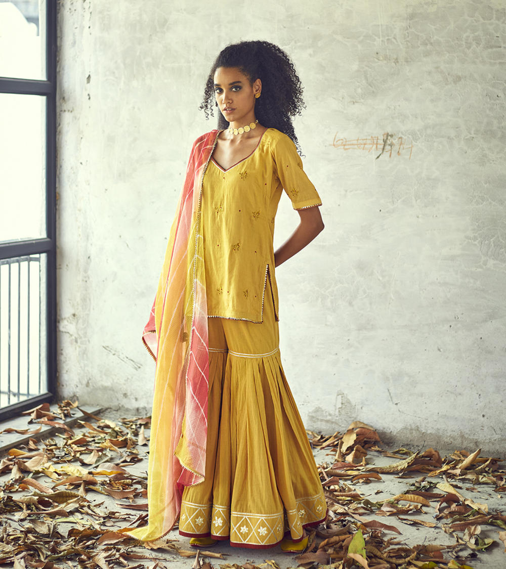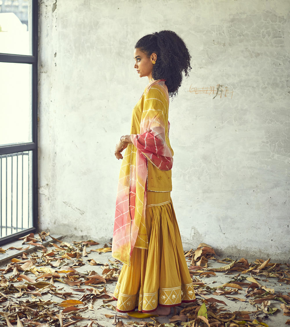 Mustard short kurti with a splatter of gold and gulabi floral embroidry, and pleated sharara set. Delicate gota work with a peek a boo finishing. Paired with our Rangeen kota doria dupatta, with delicate details of gota and tassels. It comes with potli button face back opening for an easy wear.