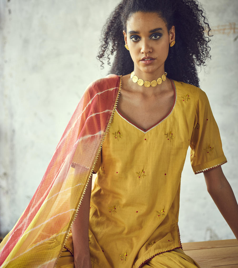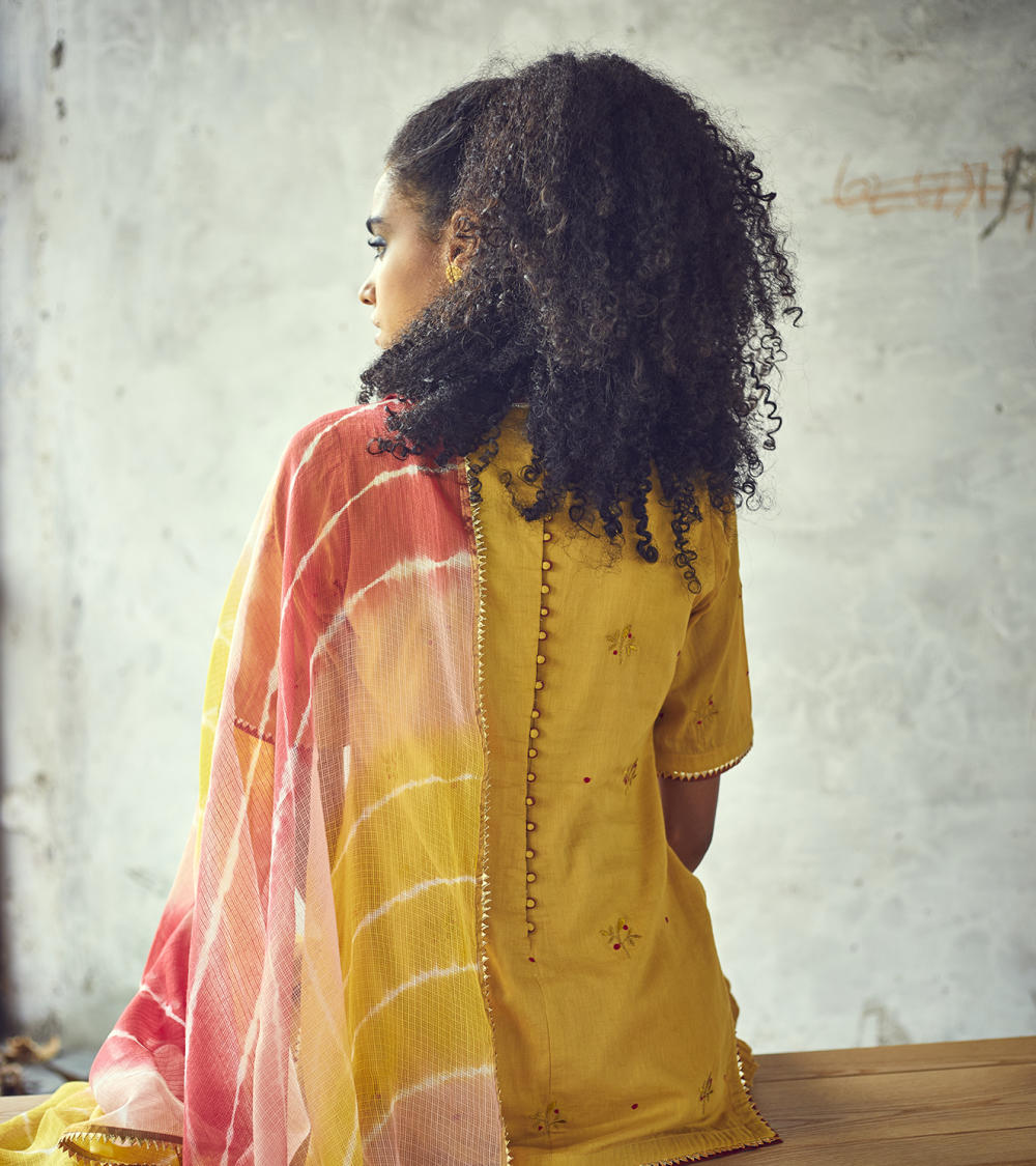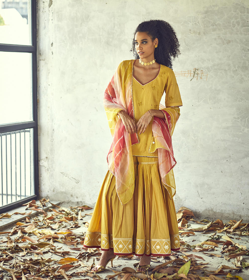 Mustard short kurti with a splatter of gold and gulabi floral embroidry, and pleated sharara set. Delicate gota work with a peek a boo finishing. Paired with our Rangeen kota doria dupatta, with delicate details of gota and tassels. It comes with potli button face back opening for an easy wear.