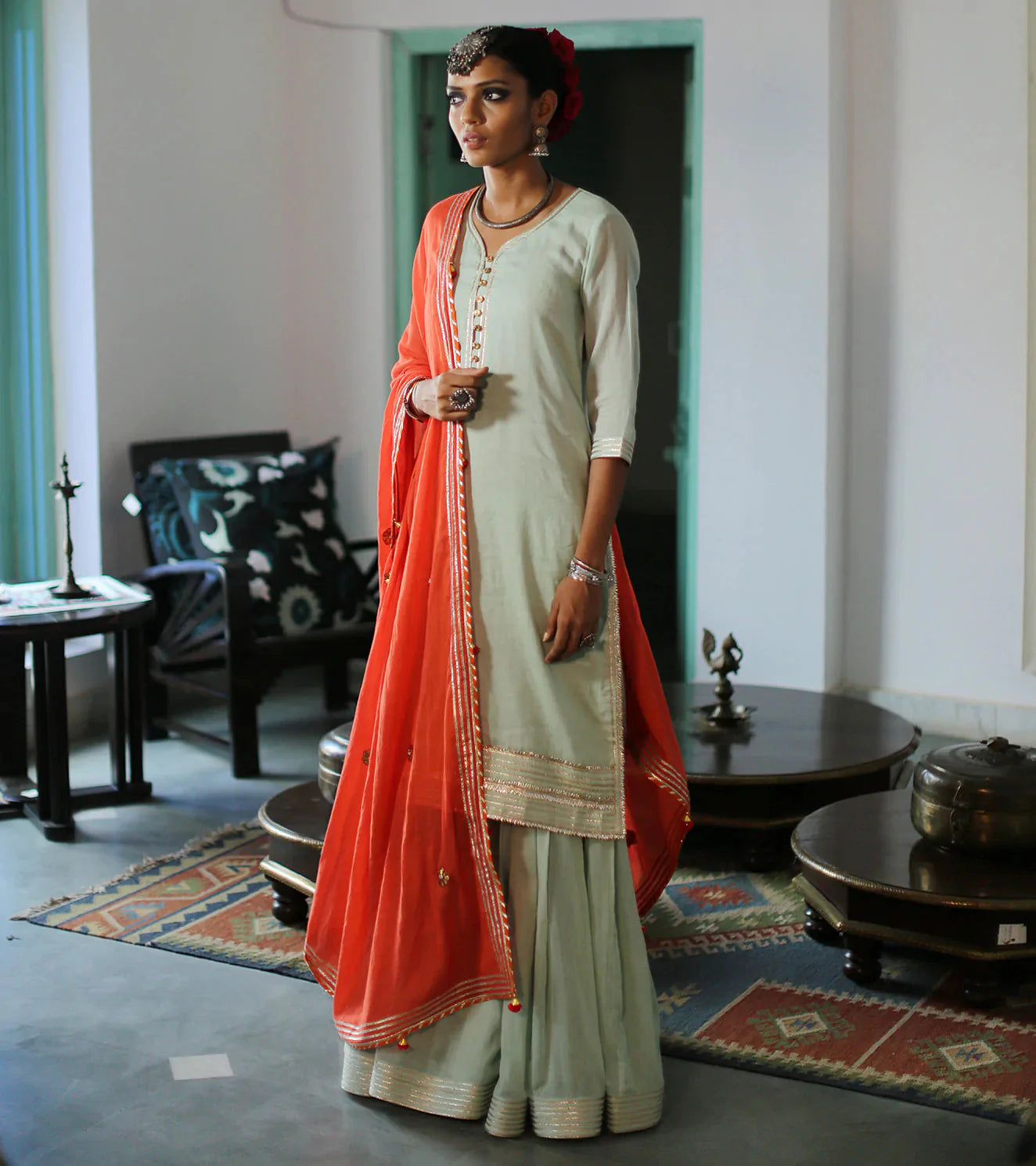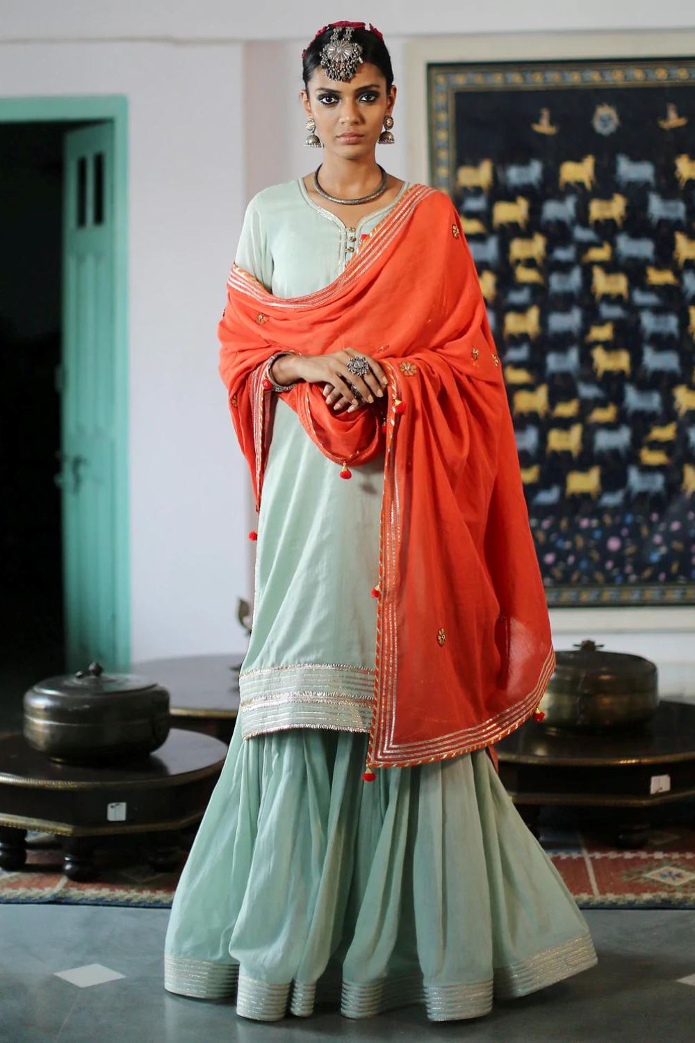 A feather-light sharara set in a fresh hue of green, handcrafted from the soft and sensuous mul fabric. The set consists of a beautiful kurti trimmed with gota highlights and golden buttons, a sharara fitted till the thighs and flaring out for a royal appeal, and a contrasting dupatta in a contemporary shade of orange.