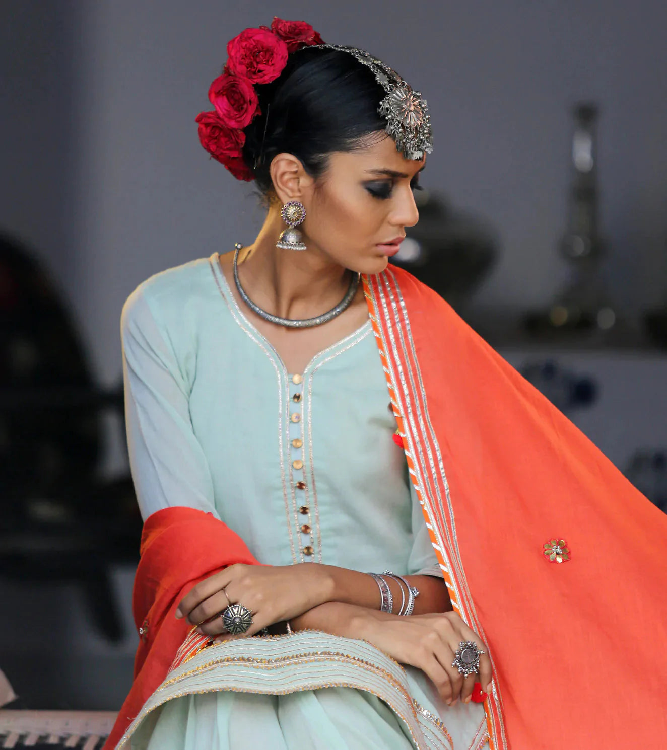 The ensemble revels in a majestic magnificence, reminiscent of beautiful palaces, splendid jharokhas, and sepia tinted frames.