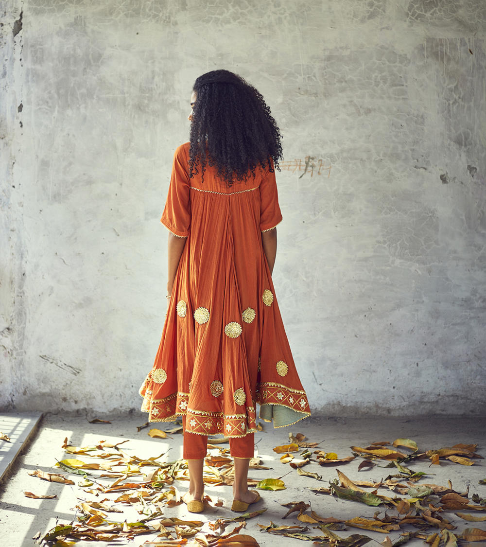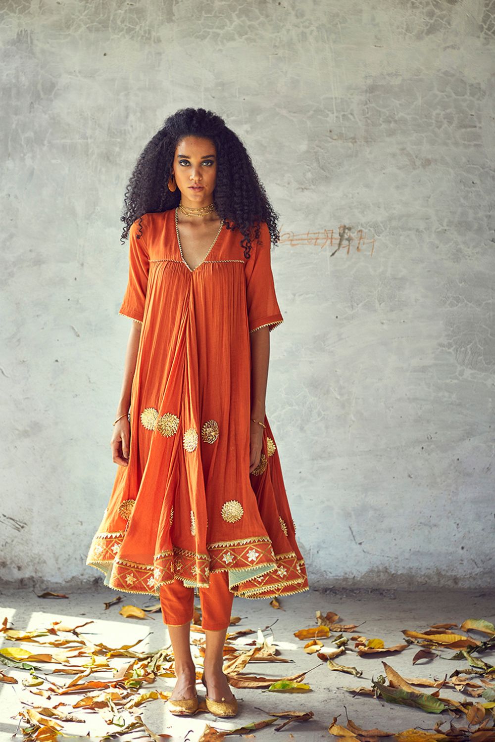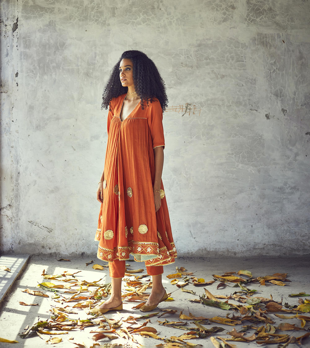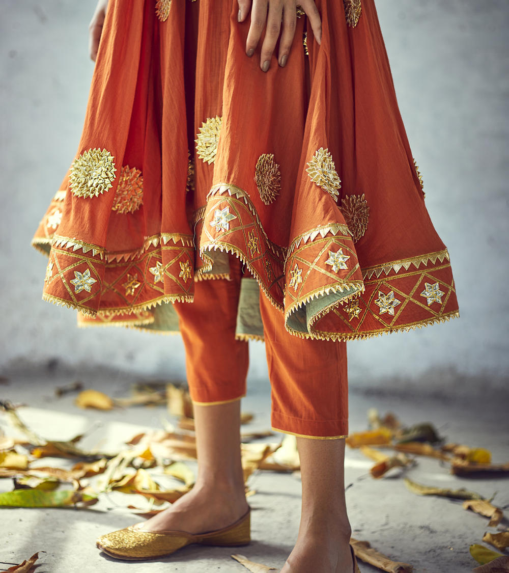 Narangi (orange) kurta, with an upper chest yoke, and generous ghera body. Voluminous body with a peek-a-boo hemline is to make the outfit fun and free. Intricate gold floral and lace work all across the hemline and sleeves add to the luxurious festive feel. Paired with matching straight pants.