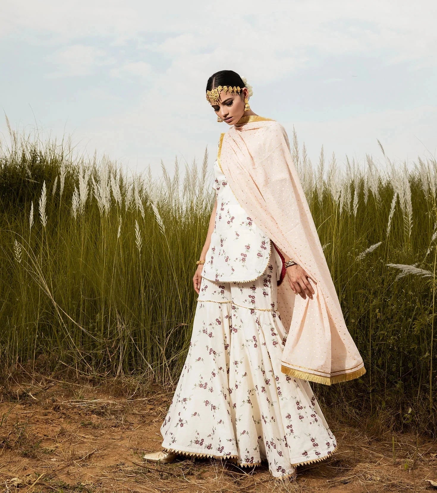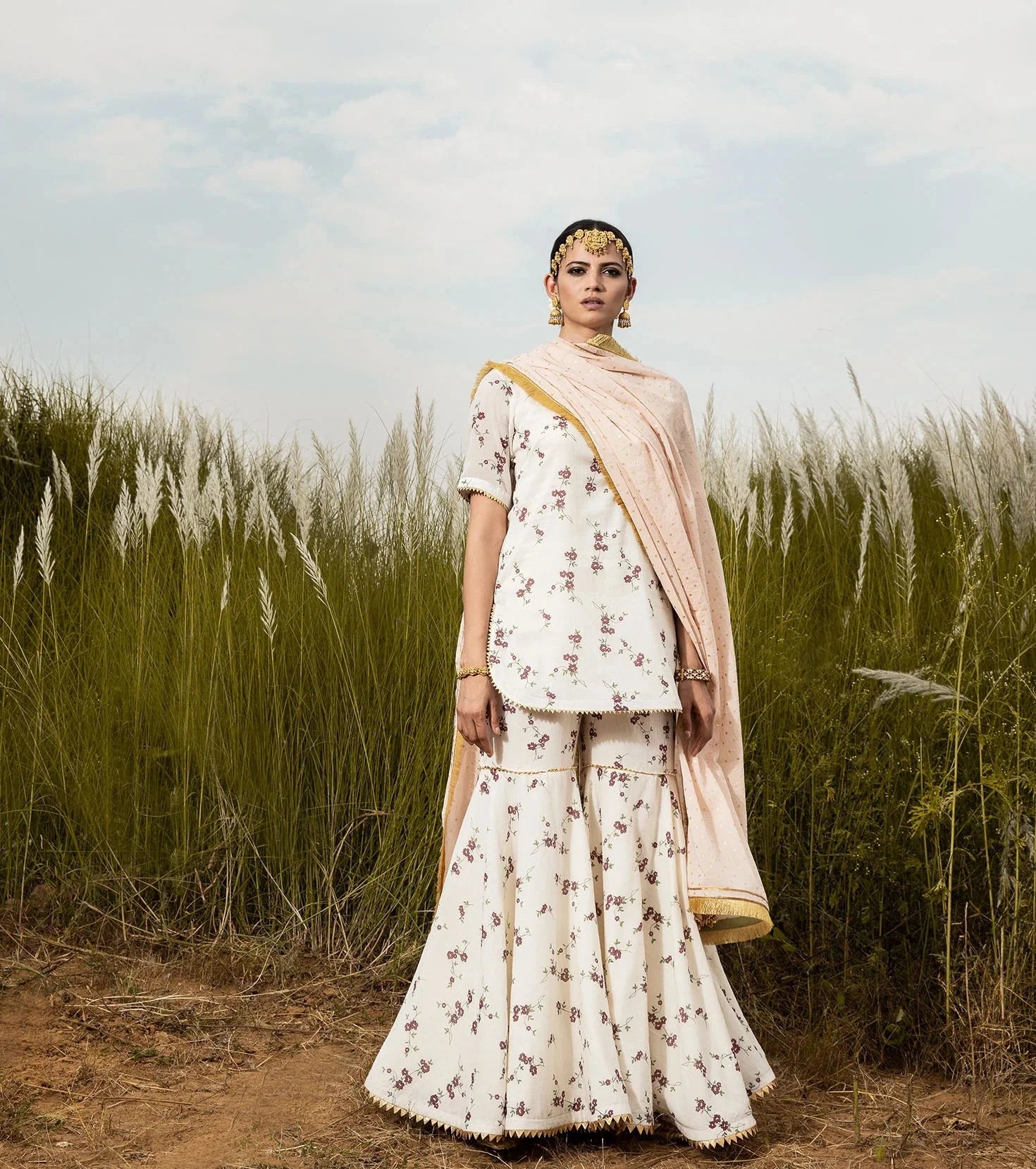 A modern take on our Grandma's staple. Ivory floral short kurti in soft mul, and A-line sharara set. Pair it with our blush 'Saachi' dupatta for a color pop, and drizzle of gold with delicate details of gota.