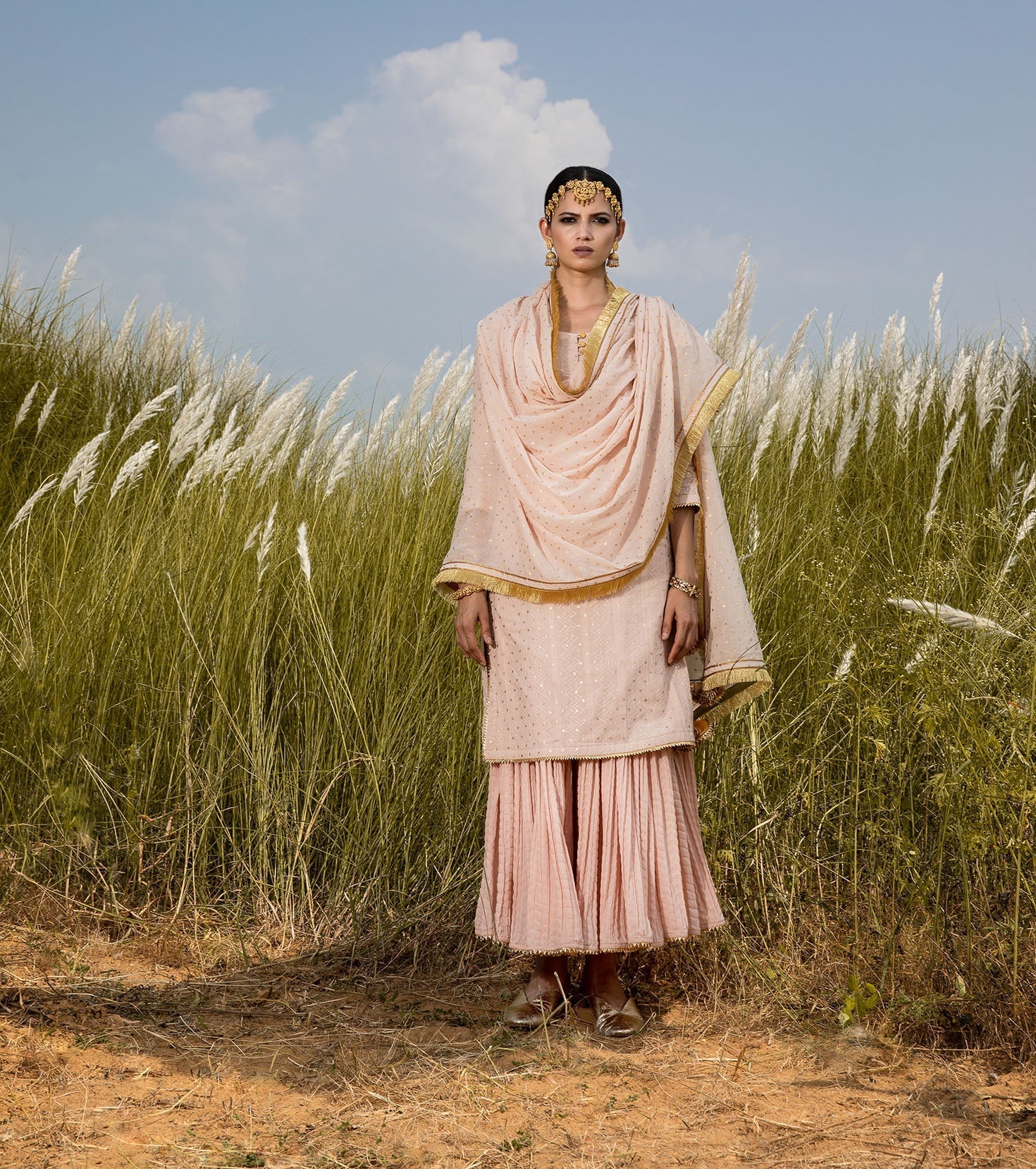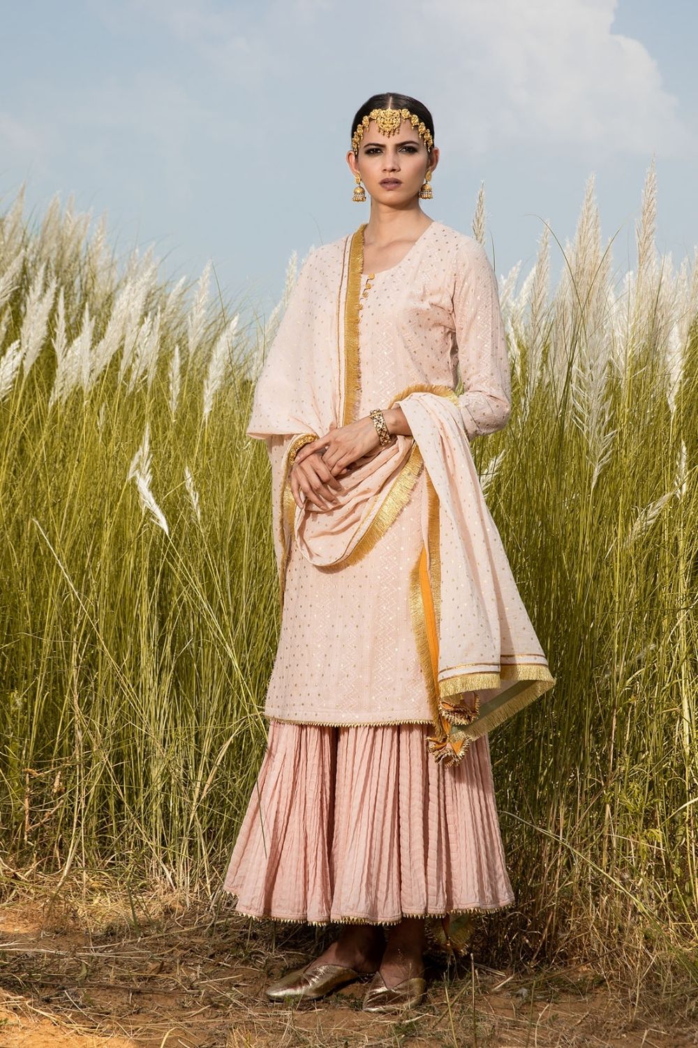 Blush mulmul long kurti with an overall splatter of gold foil polka, and crinkle sharara set. Paired with our blush 'Saachi' dupatta.