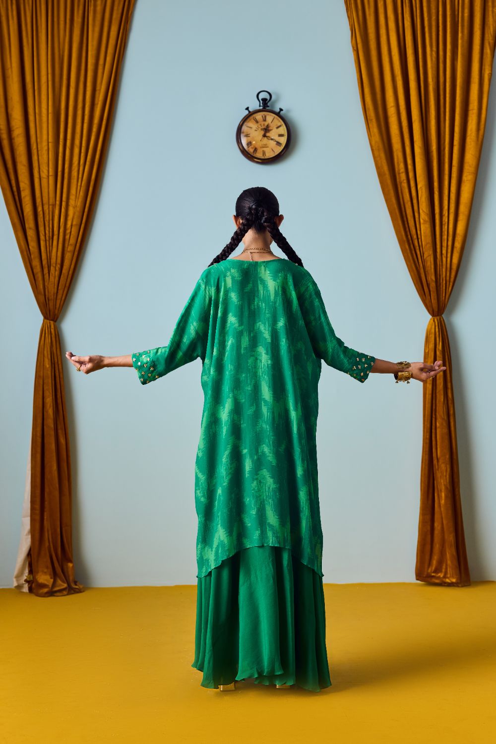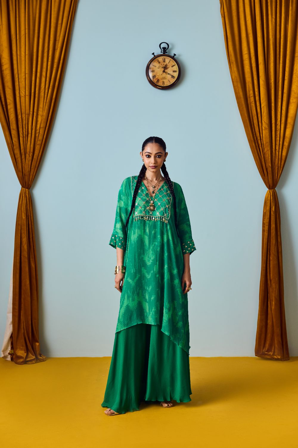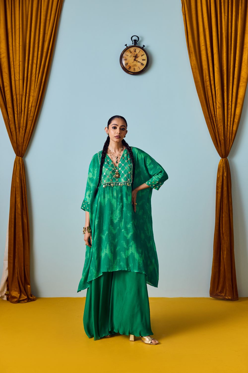 Celebrate in relaxed elegance with this two-piece festive set featuring a hand-embroidered kaftan kurta and flared panelled palazzo. The kaftan top has a generous, flowing fit - while the model wears size S, this same size can comfortably accommodate M due to its anti fit silhouette. The palazzo bottoms feature panel detailing and are lined with soft muslin for comfort, maintaining a true-to-size fit.Ornamental charms tassels on the yoke elevate the top with handcrafted detail.