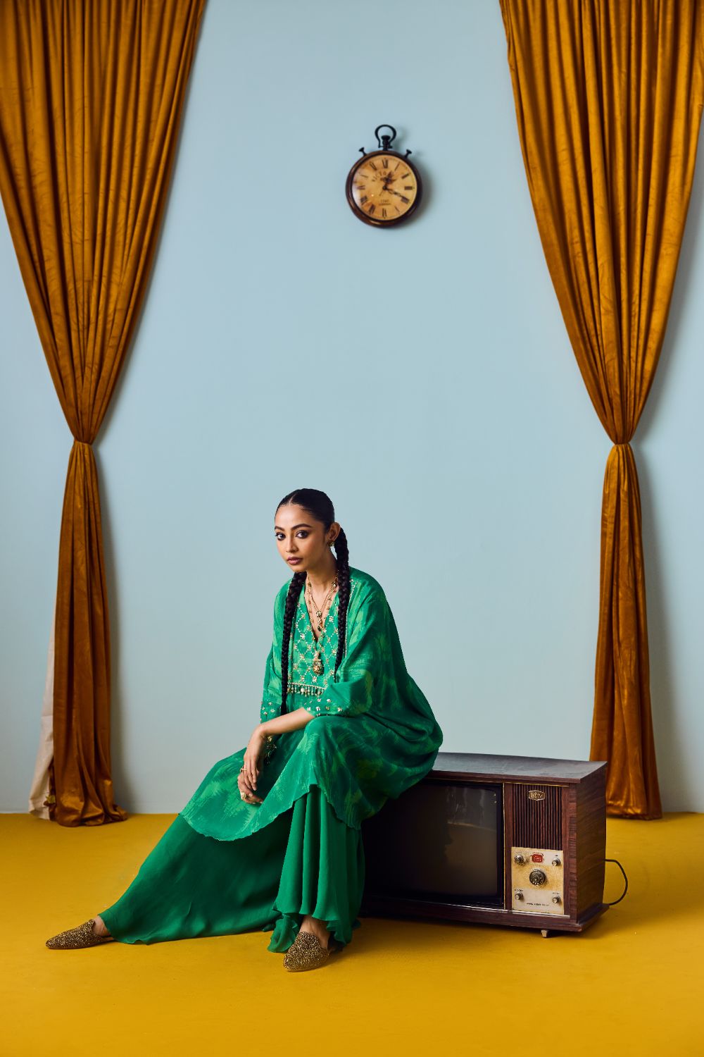Preeti’s design philosophy is refreshingly modern: she takes silhouettes we know — the salwar set, the kurta, the lehenga-inspired skirt — and strips away the weight, quite literally. Fabrics rooted in heritage such as ajrakh and handwoven textiles become unexpectedly playful under her lens. A burst of neon here, a reworked motif there, a dash of embroidery that feels artisanal but never ornate.
