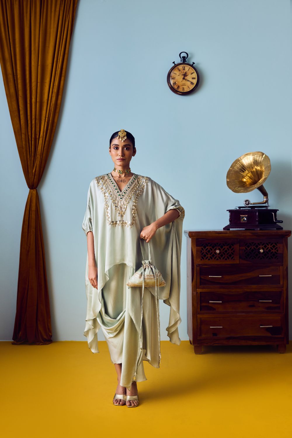 Featuring our signature anti-fit hi-low tunic with delicate hand embroidery .Paired with draped style skirt that are lined with soft muslin. The top is a free-fall silhouette flatters all body types,offering a relaxed yet refined look.Bottoms are true to fit yet flattering. Top width remains consistent across sizes S–XL and increases by 2" for 2XL–4XL. Model is wearing size S.Her body height is 5feet 5inches and wearing heels.