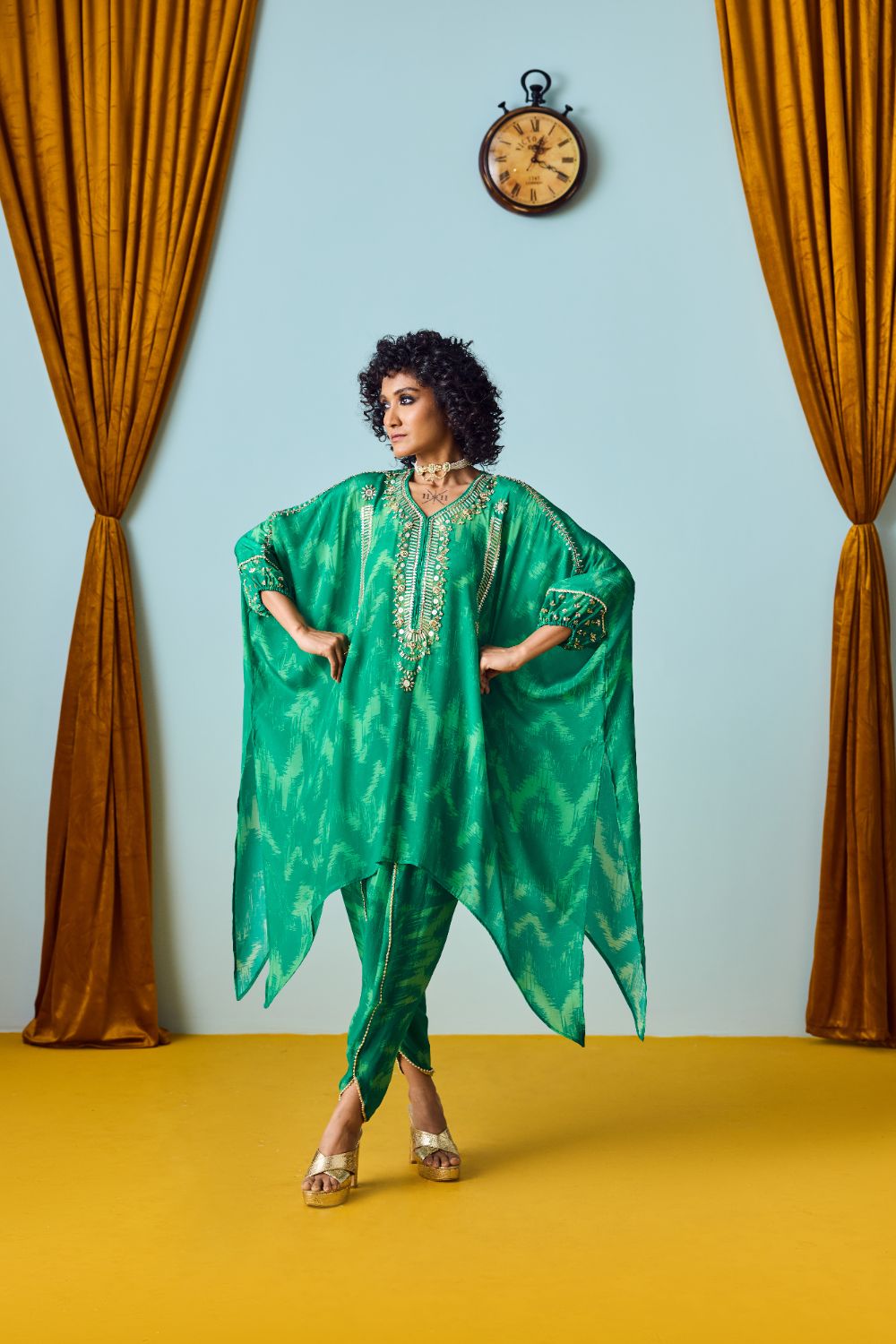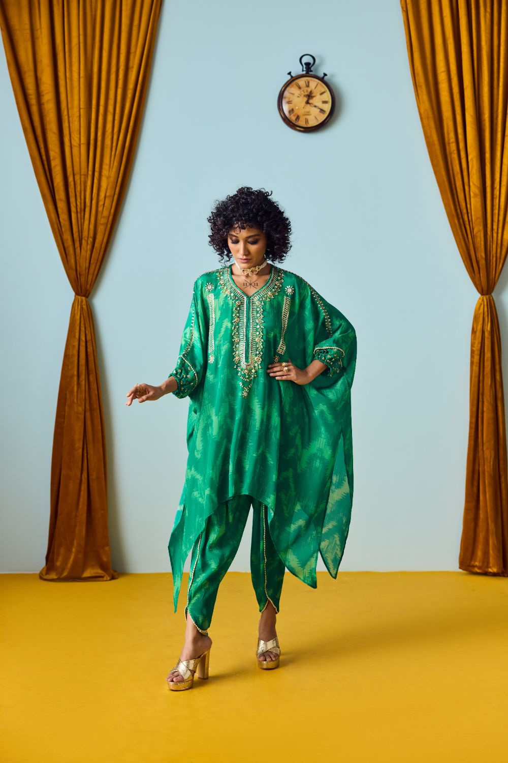 Featuring an antifit hand-embroidered kaftan tunic paired with tulip pants. The kaftan tunic has a relaxed, flowing fit with the model shown wearing size S. The bottom consists of tulip-style pants with reinforced seams and decorative handmade pearl gota lace trim along the edges. While the top offers a loose, comfortable fit, the tulip pants are designed to fit and are true to size.