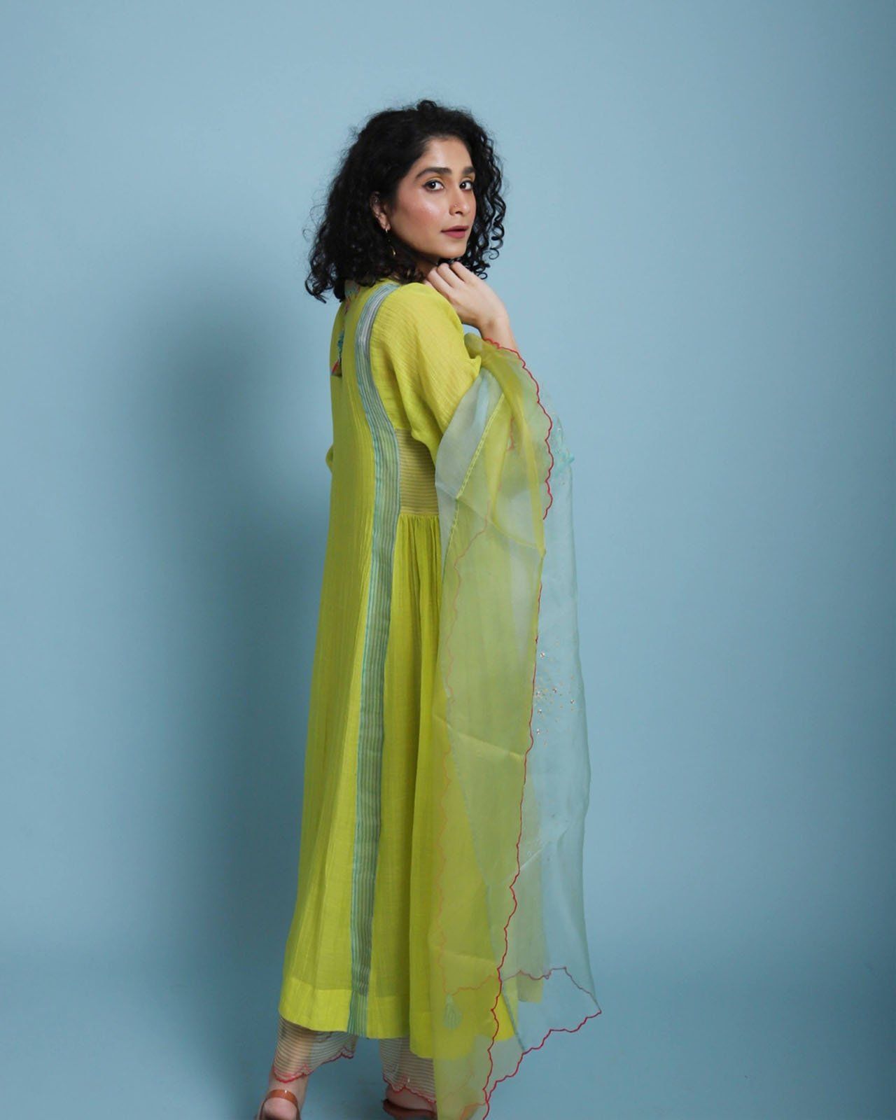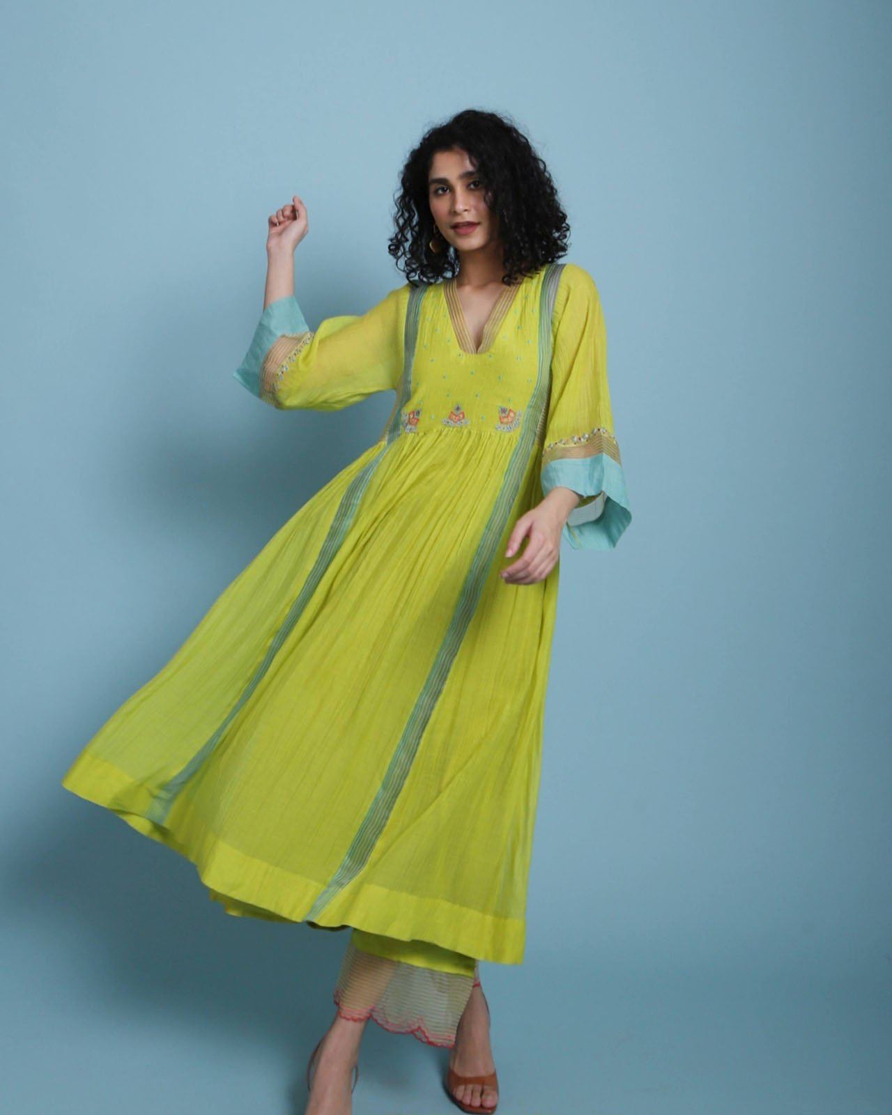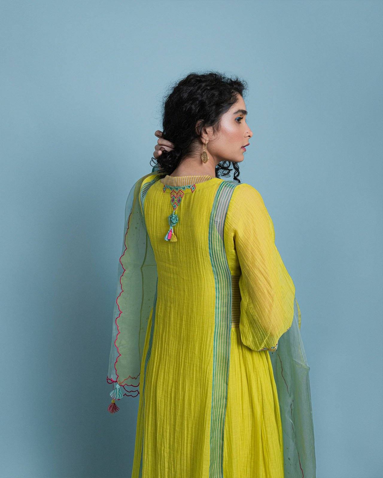 Yellow Chanderi Kurta with organza organza detailing and intricate embroidery paired with modal palazzo with organza scallop panel and embroidered organza dupatta