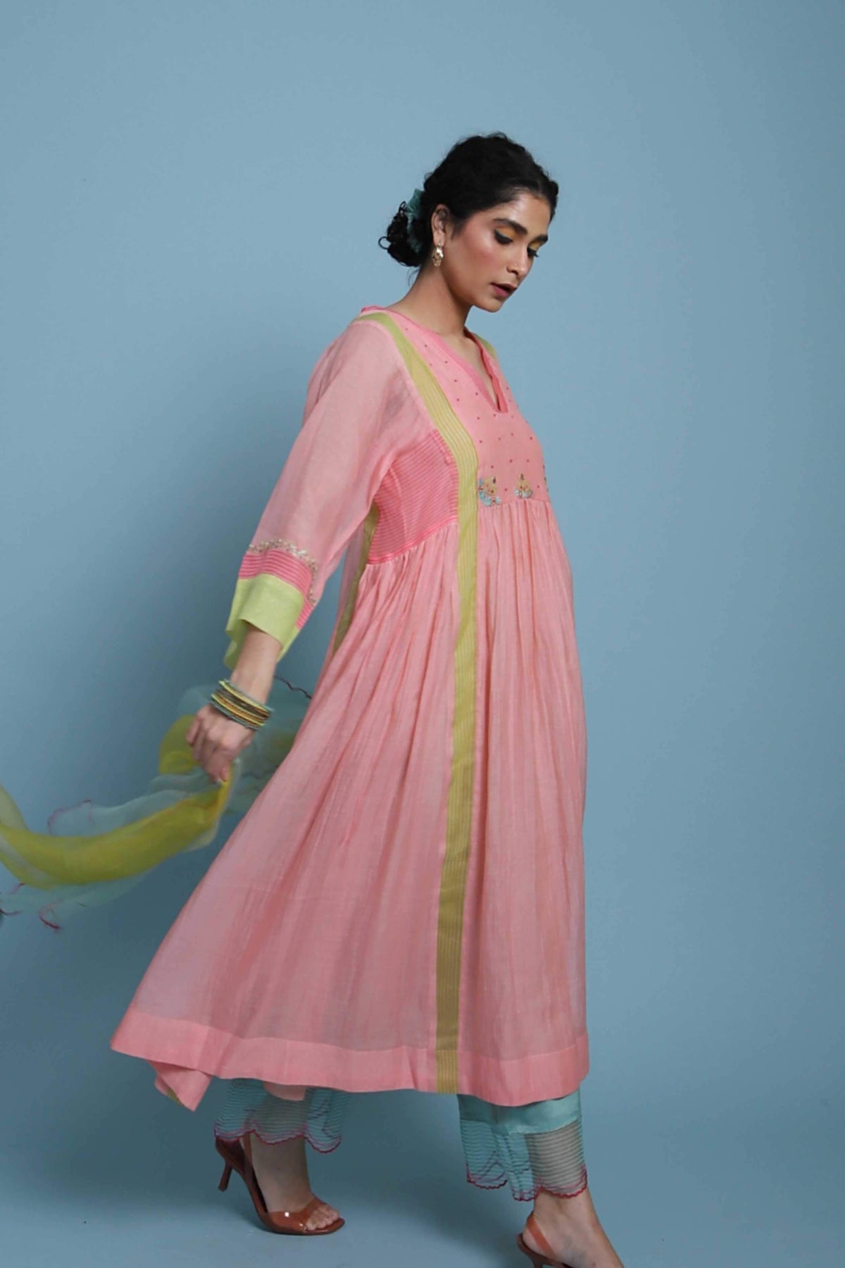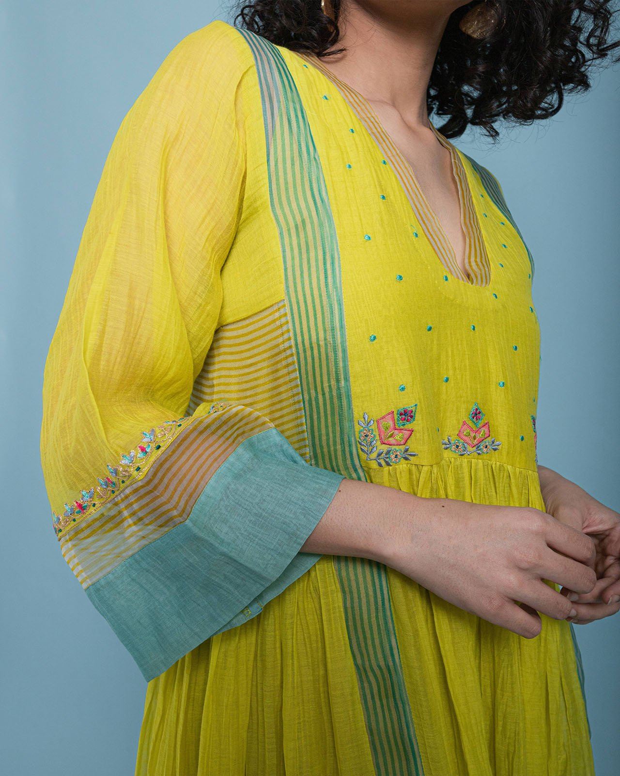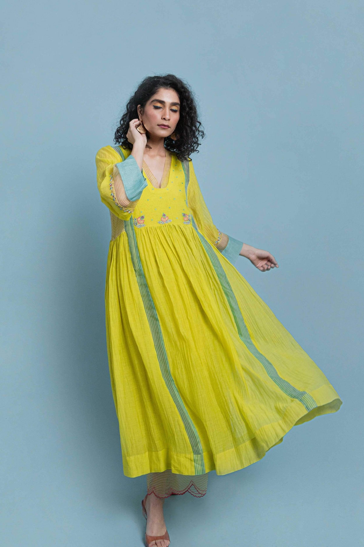 Yellow Chanderi Kurta with organza organza detailing and intricate embroidery paired with modal palazzo with organza scallop panel and embroidered organza dupatta