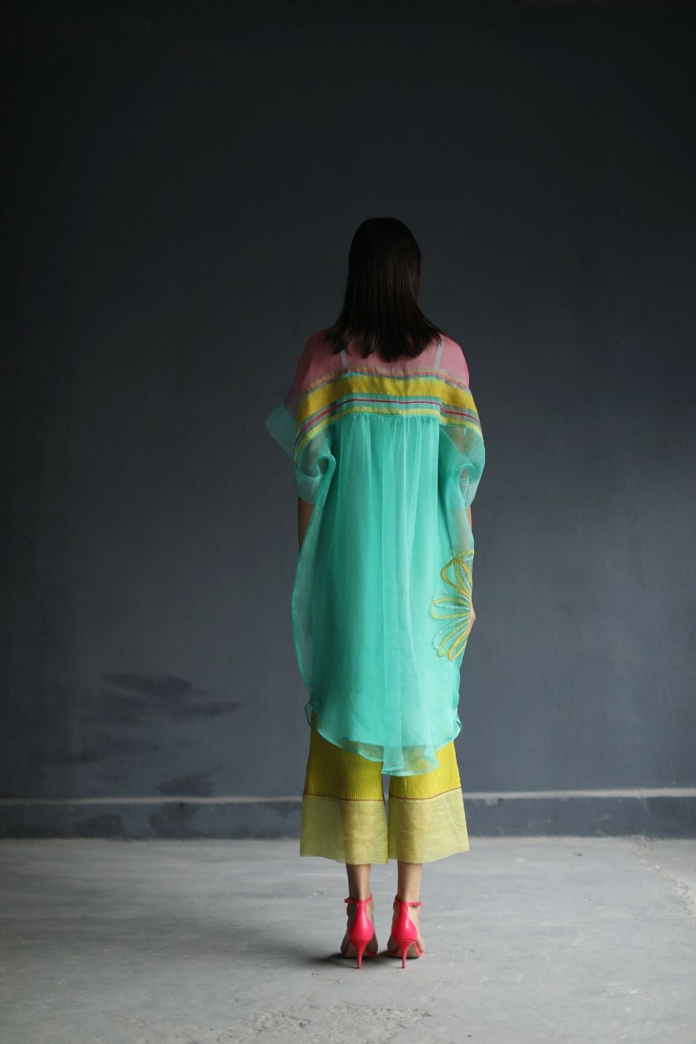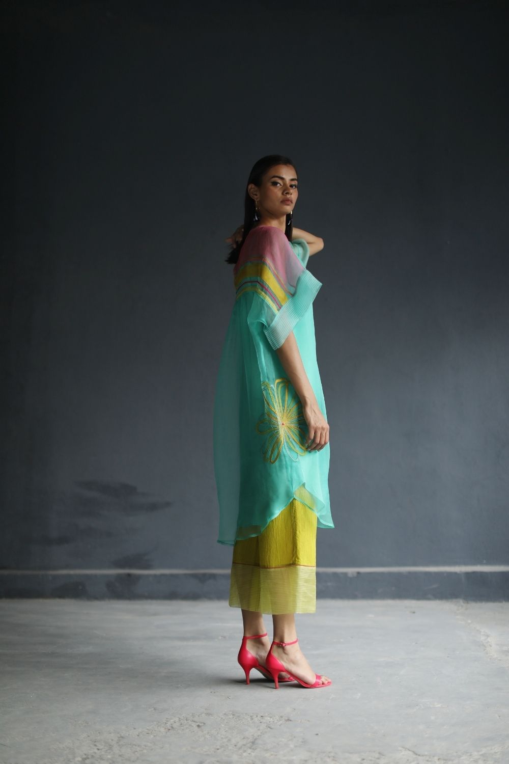 A Classy Organza shirt with Applique Work and Multi-colored Silk detailing paired with a Lime green Organic Cotton Palazzo with Silk Organza Finish.
