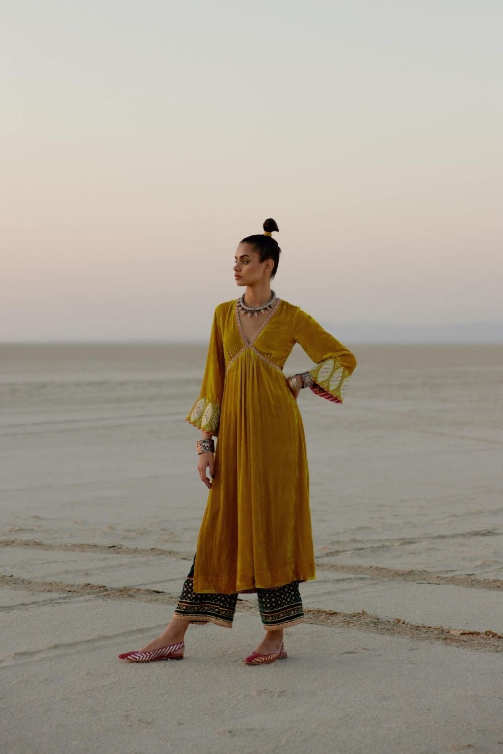 Mustard yellow silk velvet A-line kurta with hand embroidered neck and bell sleeves paired with silk velvet turquoise green embroidered palazzo.