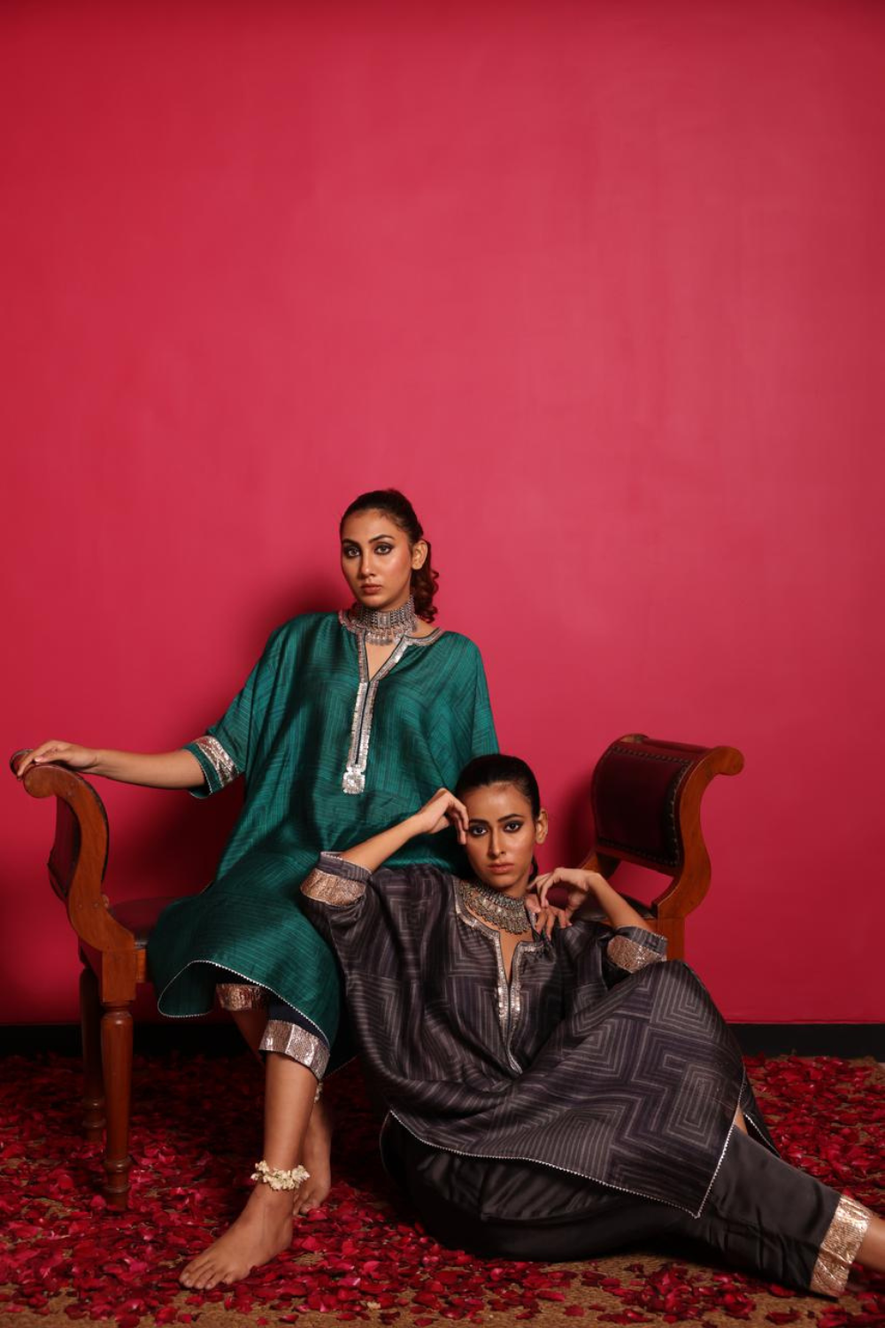 Kurta is Free Size, Pants come in sizes S/M & M/L